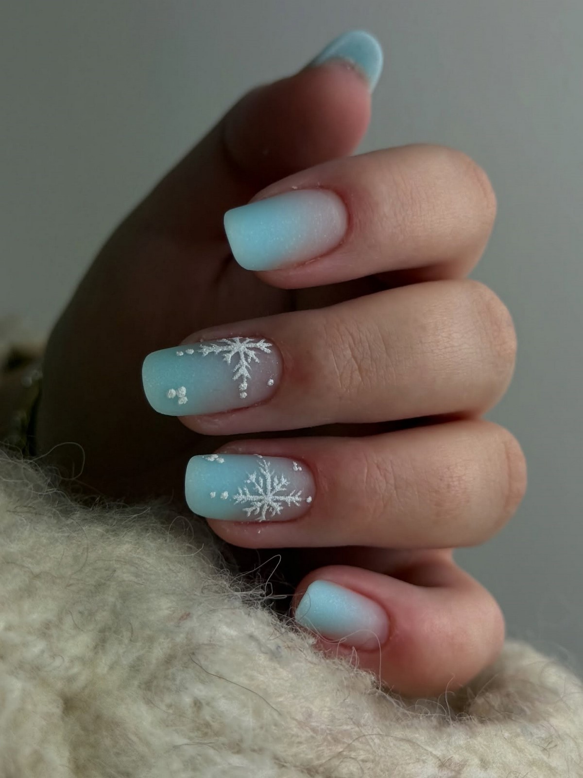 Дизайн найчастіше виконують у білому, сріблястому або прозорому варіанті на нюдовій або холодній пастельній основі. Такий манікюр зберігає зимовий настрій, але не виглядає святково перевантаженим.