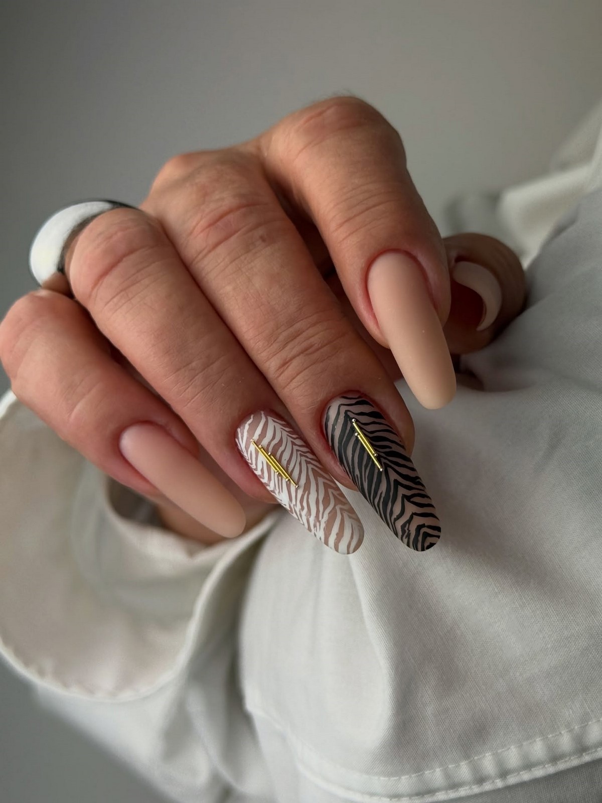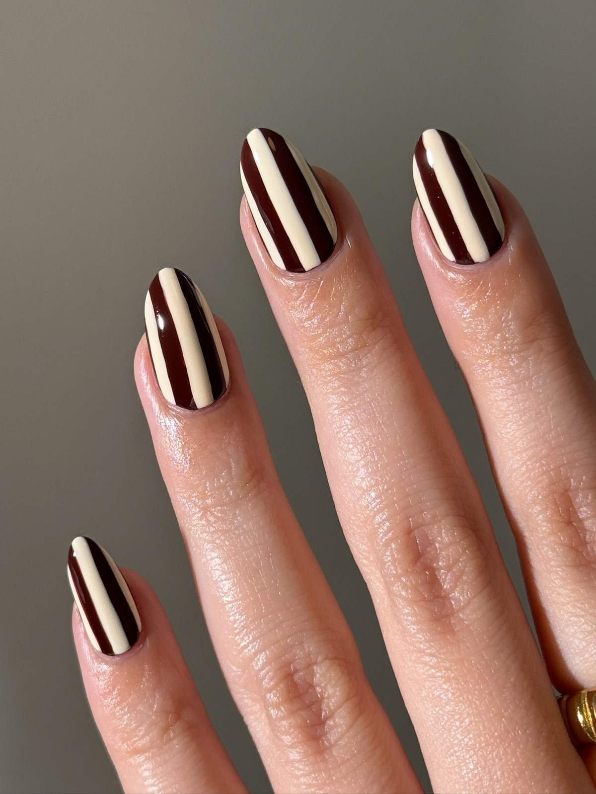 Тонкі лінії зеленого, хакі або темно-смарагдового кольору красиво виглядають на молочній або бежевій основі. Часто дизайн доповнюють мікроблискітками або тонким золотим контуром.
