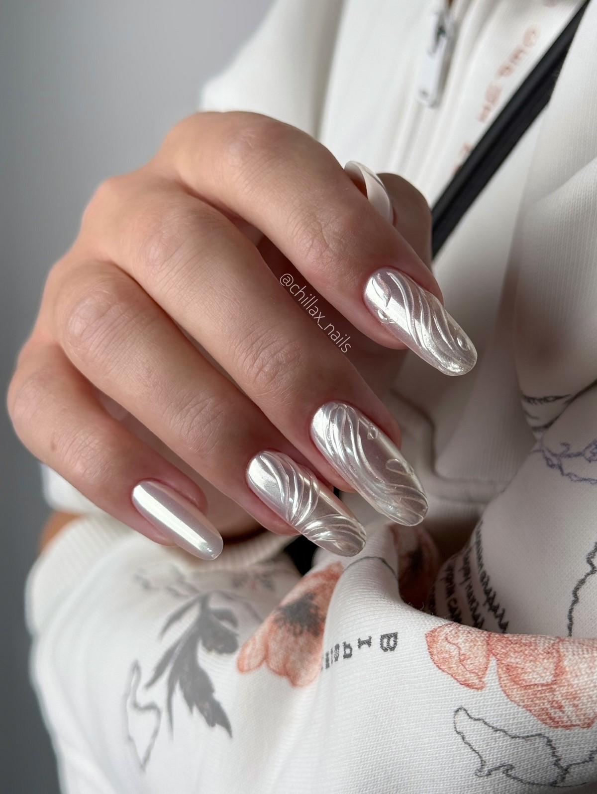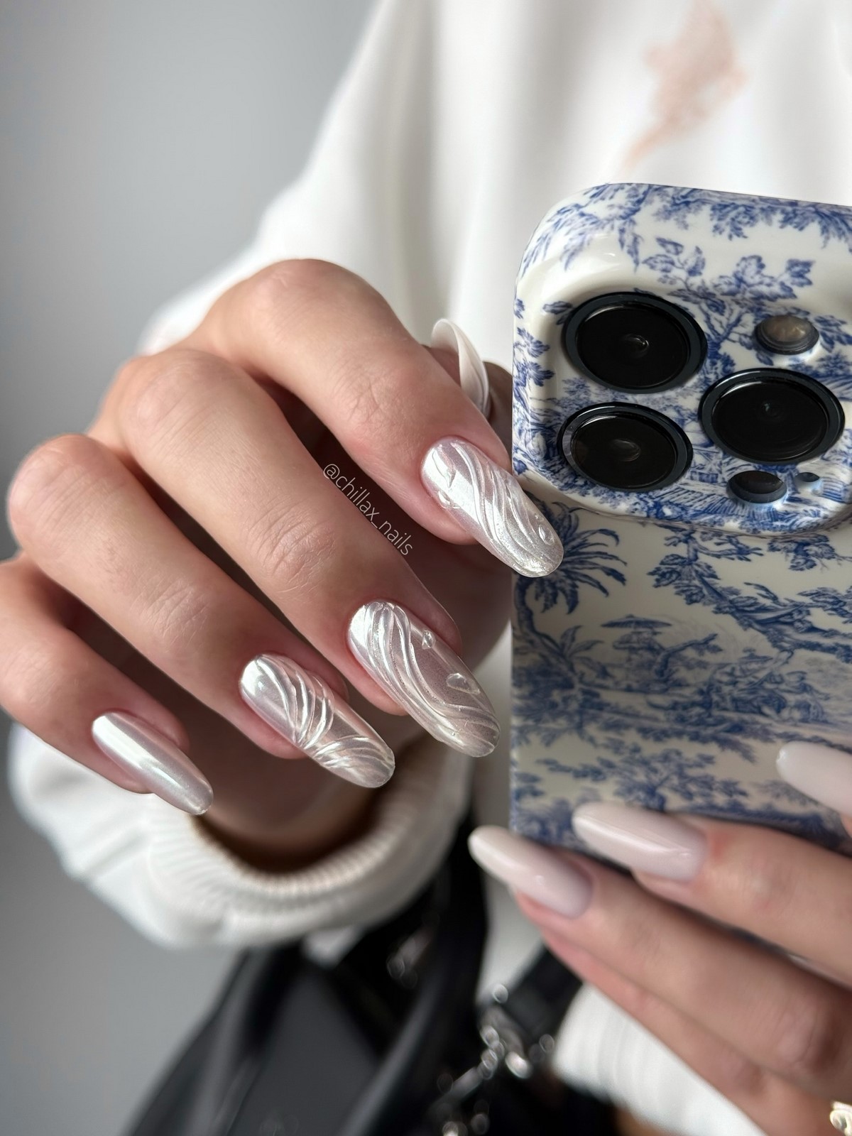 Перламутрові нігті — абсолютний фаворит січня 2026 року. Такий манікюр асоціюється з інеєм, снігом і зимовим сяйвом, підкреслюючи доглянутість рук.