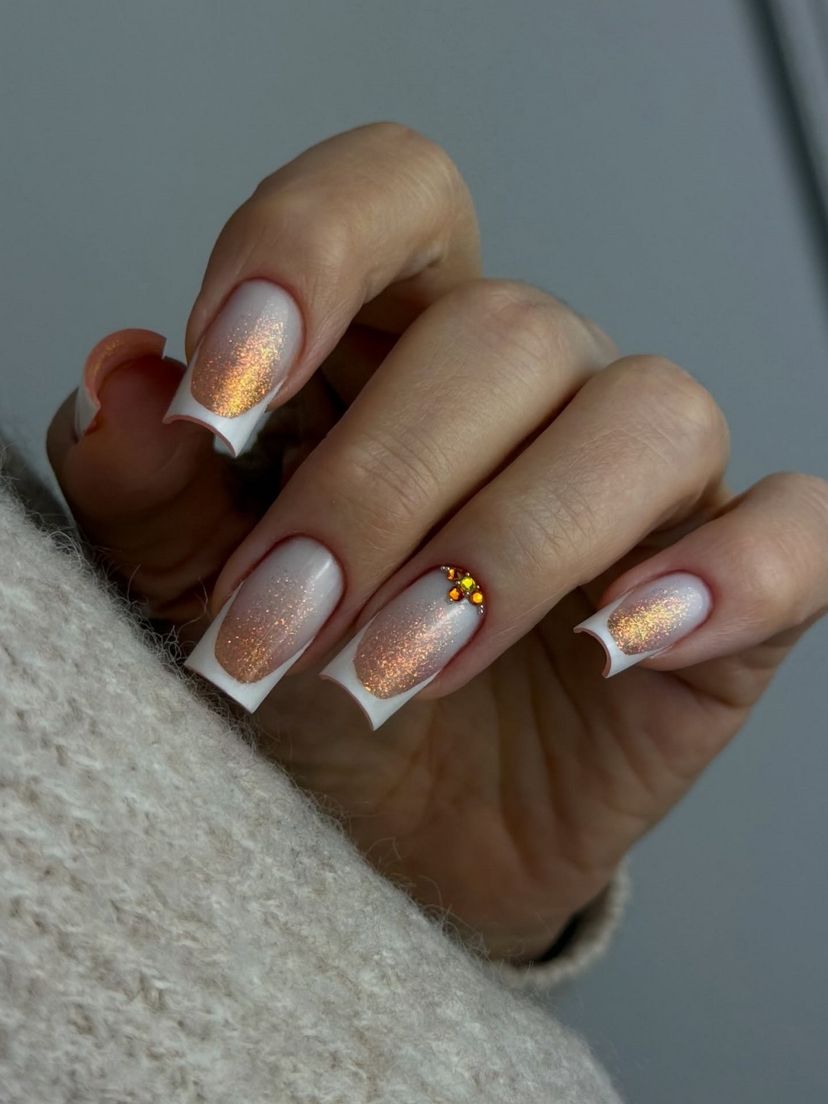 Форма нігтів — мигдаль, м’який квадрат або короткий овал. Особливо актуальний мікрофренч і френч з перламутровим або глянцевим фінішем, який красиво відбиває зимове світло.