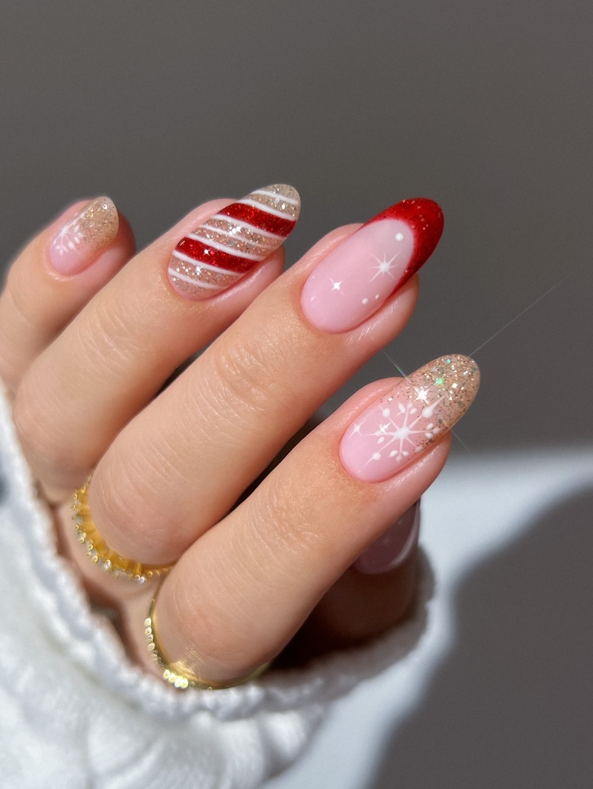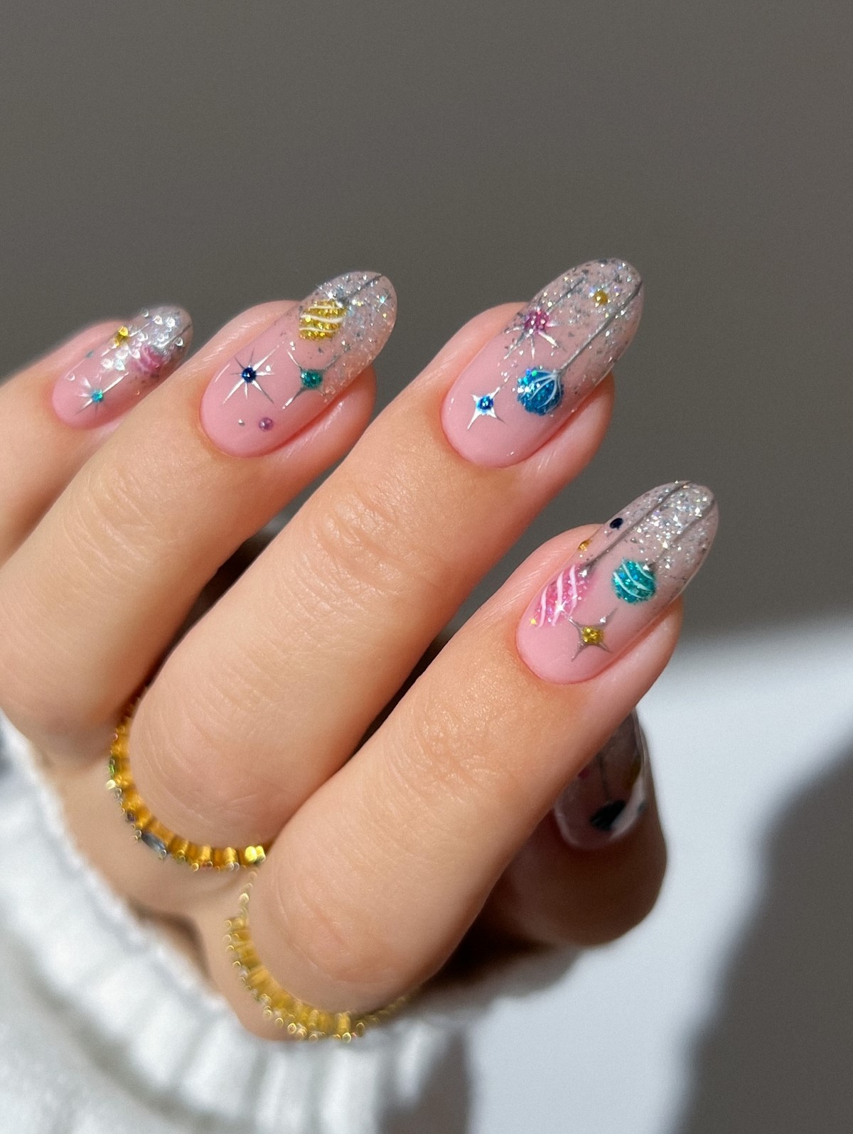 Градієнт з блискітками — один з найніжніших і універсальних варіантів новорічного дизайну. Майстер розтушовує сяючі частинки від кутикули до кінчика або навпаки, створюючи м’який шиммерний перехід. Такий манікюр підходить і до вечірньої сукні, і до більш спокійного святкового образу.
