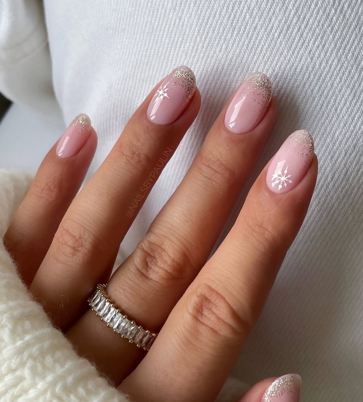 У 2026 році особливо модні розтяжки срібла, «шампань» і холодного рожевого золота — відтінки, які створюють ефект іскристого снігу або морозного туману. Градієнт з блискітками вигідно витягує нігтьову пластину і виглядає дуже елегантно.