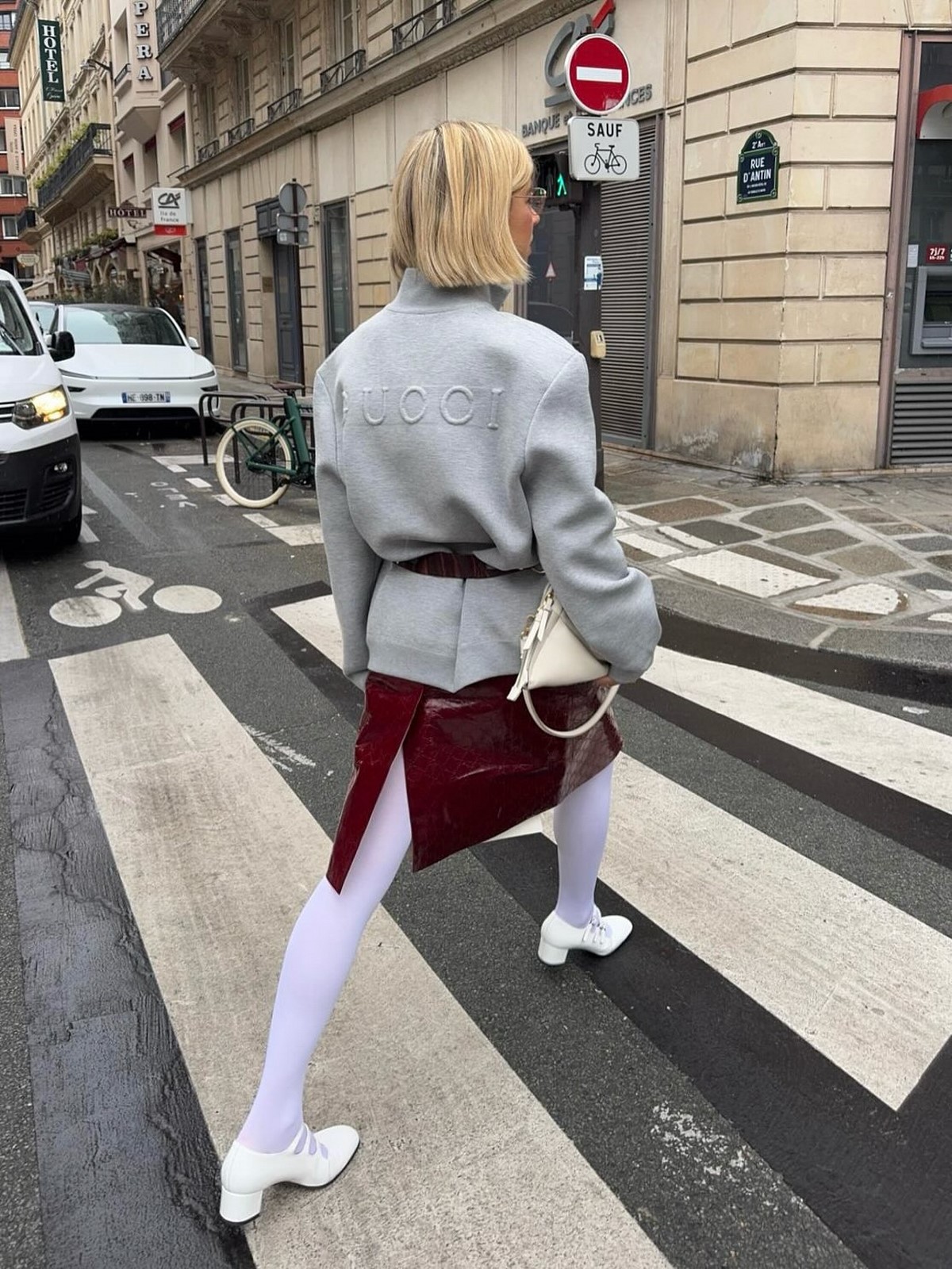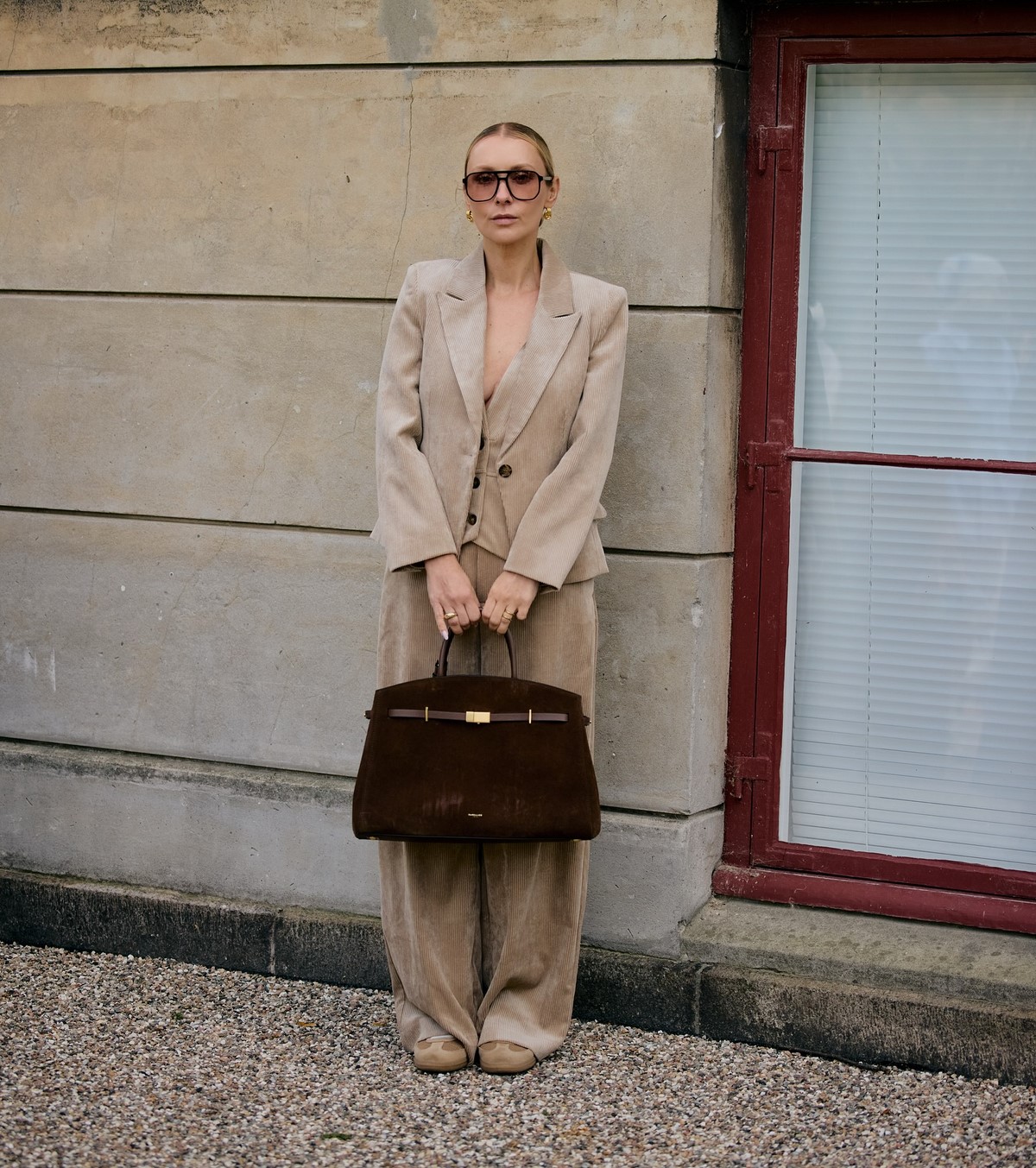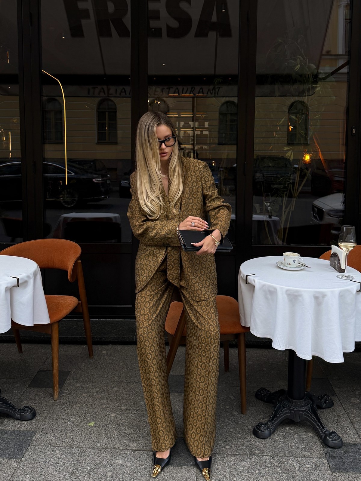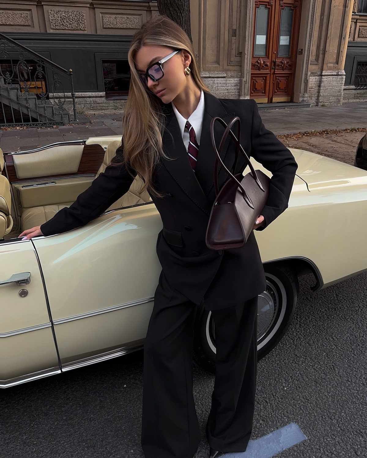 Класика, що повертається на новий рівень. Комплекти зі спідницею міді та жакетом у стилі Chanel, обрамлені золотими ґудзиками, знову на піку. Але тепер їх носять із чобітьми до коліна та міні-сумками, створюючи баланс між елегантністю та сучасністю. Особливо популярні костюми з букле, твіду та замші.
