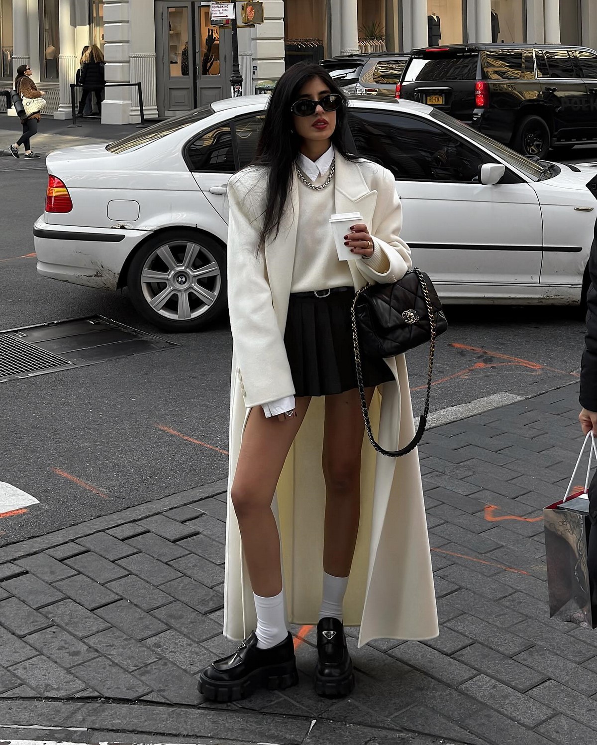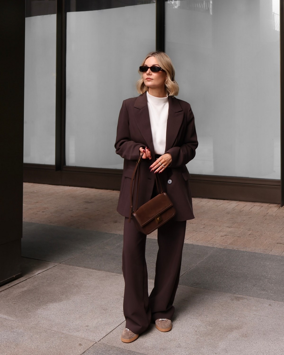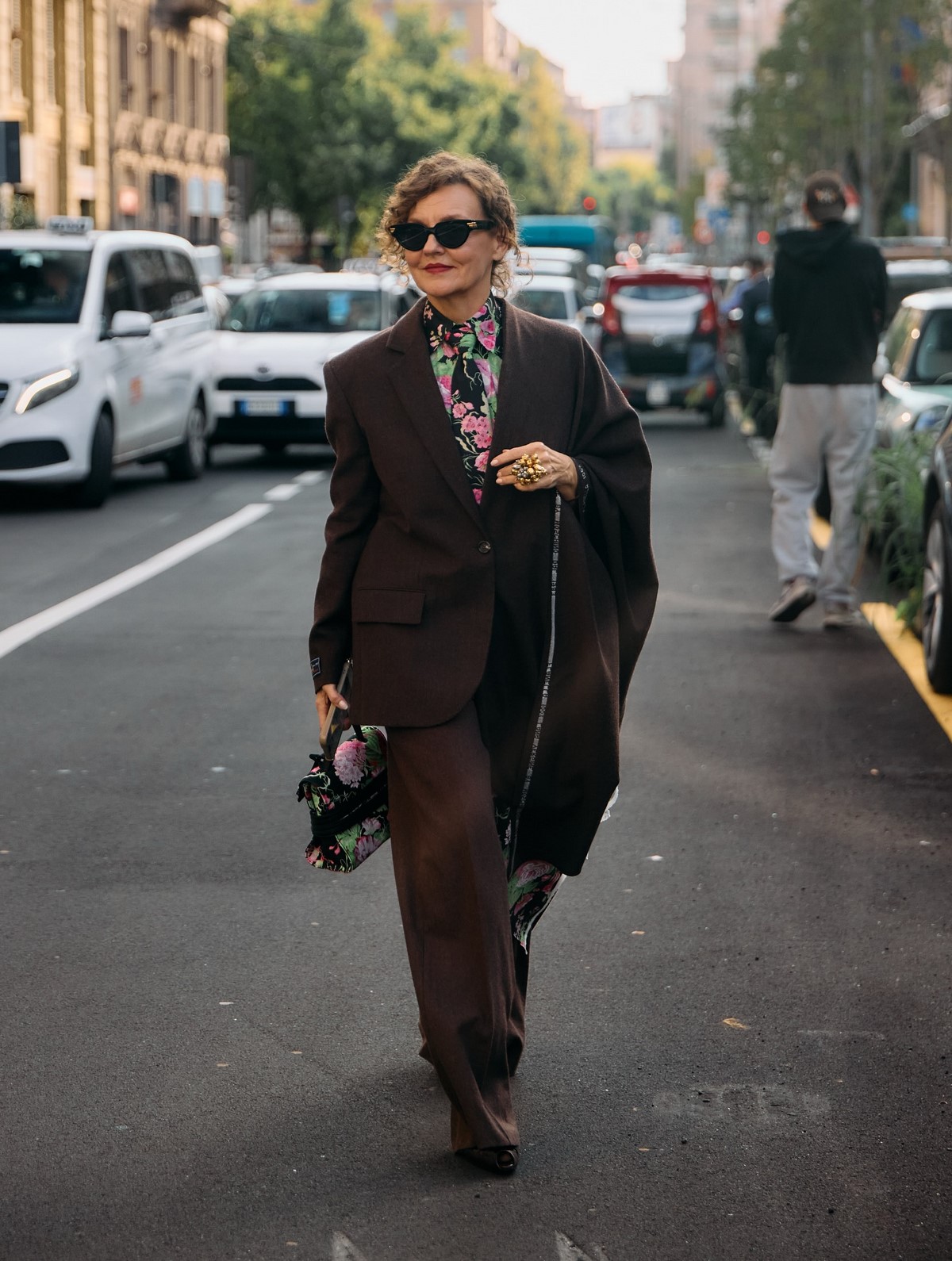 Класика, що повертається на новий рівень. Комплекти зі спідницею міді та жакетом у стилі Chanel, обрамлені золотими ґудзиками, знову на піку. Але тепер їх носять із чобітьми до коліна та міні-сумками, створюючи баланс між елегантністю та сучасністю. Особливо популярні костюми з букле, твіду та замші.