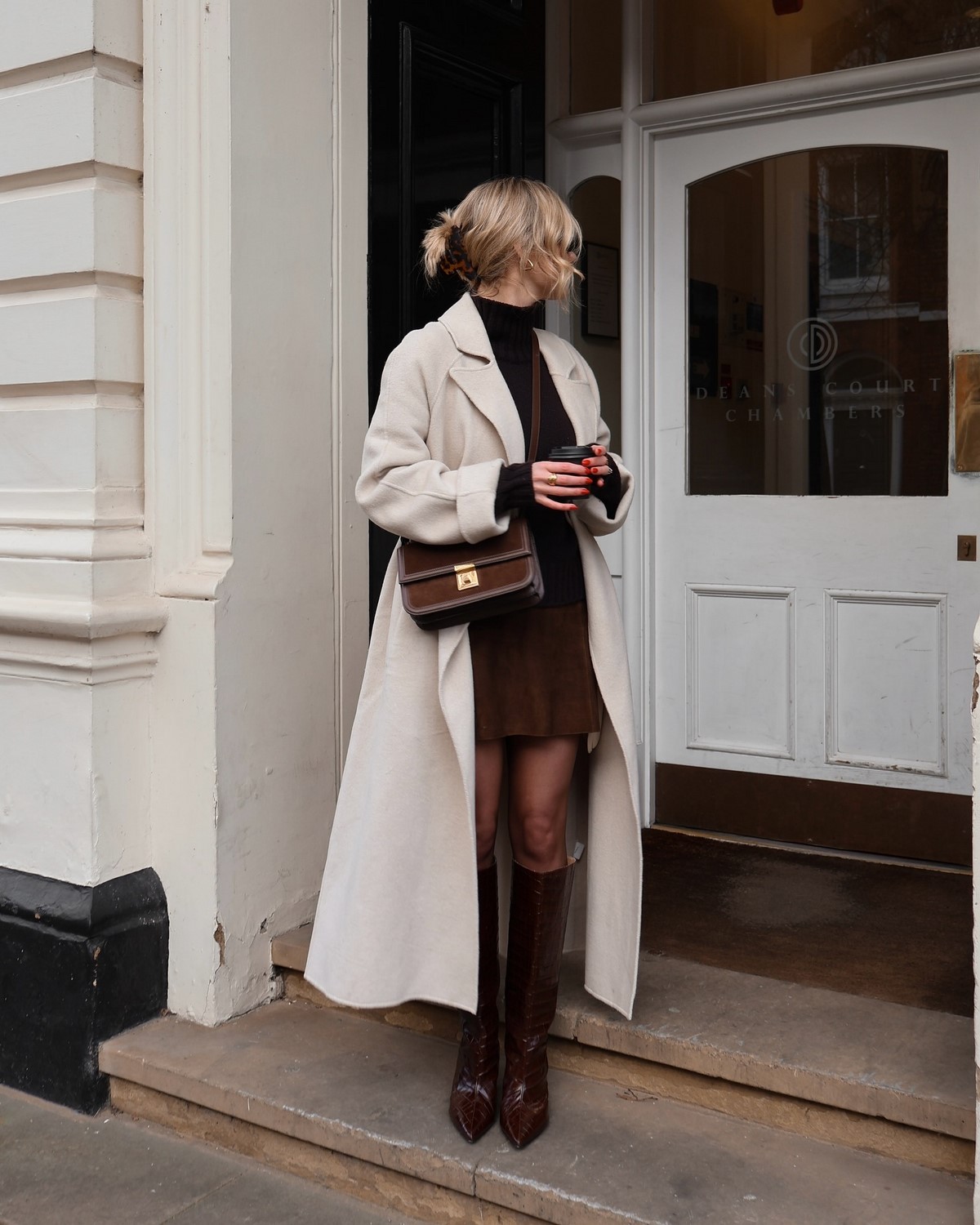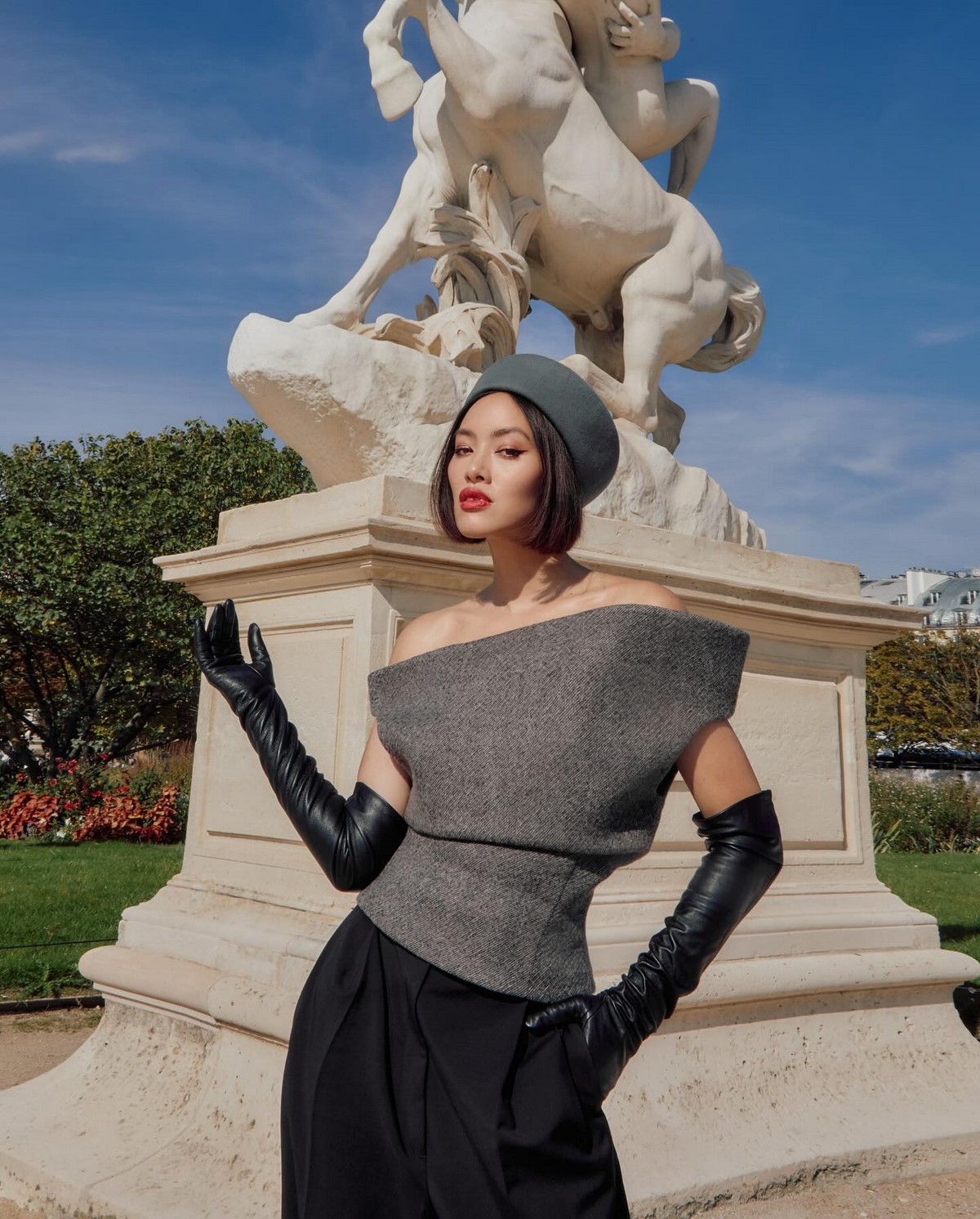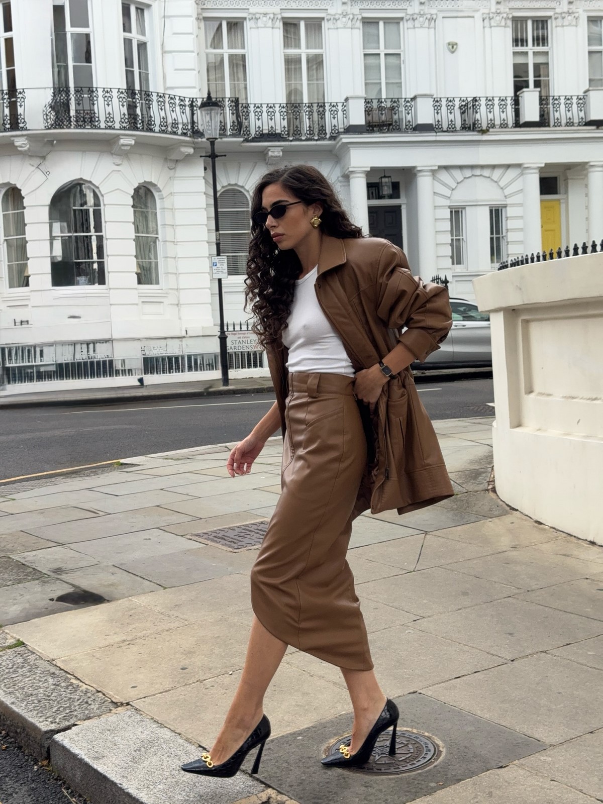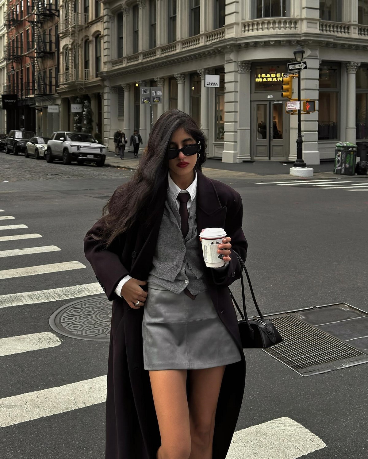 Класика, що повертається на новий рівень. Комплекти зі спідницею міді та жакетом у стилі Chanel, обрамлені золотими ґудзиками, знову на піку. Але тепер їх носять із чобітьми до коліна та міні-сумками, створюючи баланс між елегантністю та сучасністю. Особливо популярні костюми з букле, твіду та замші.