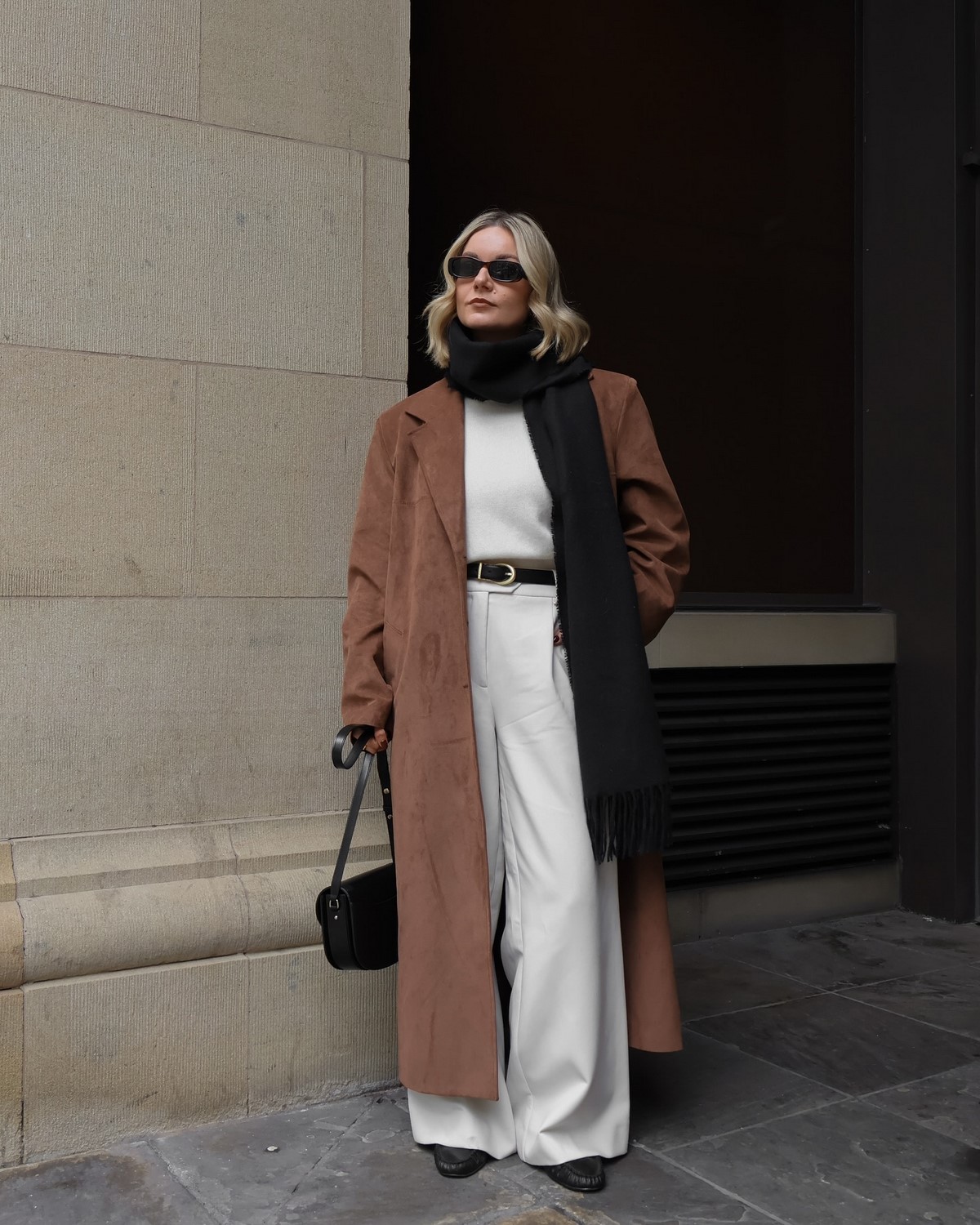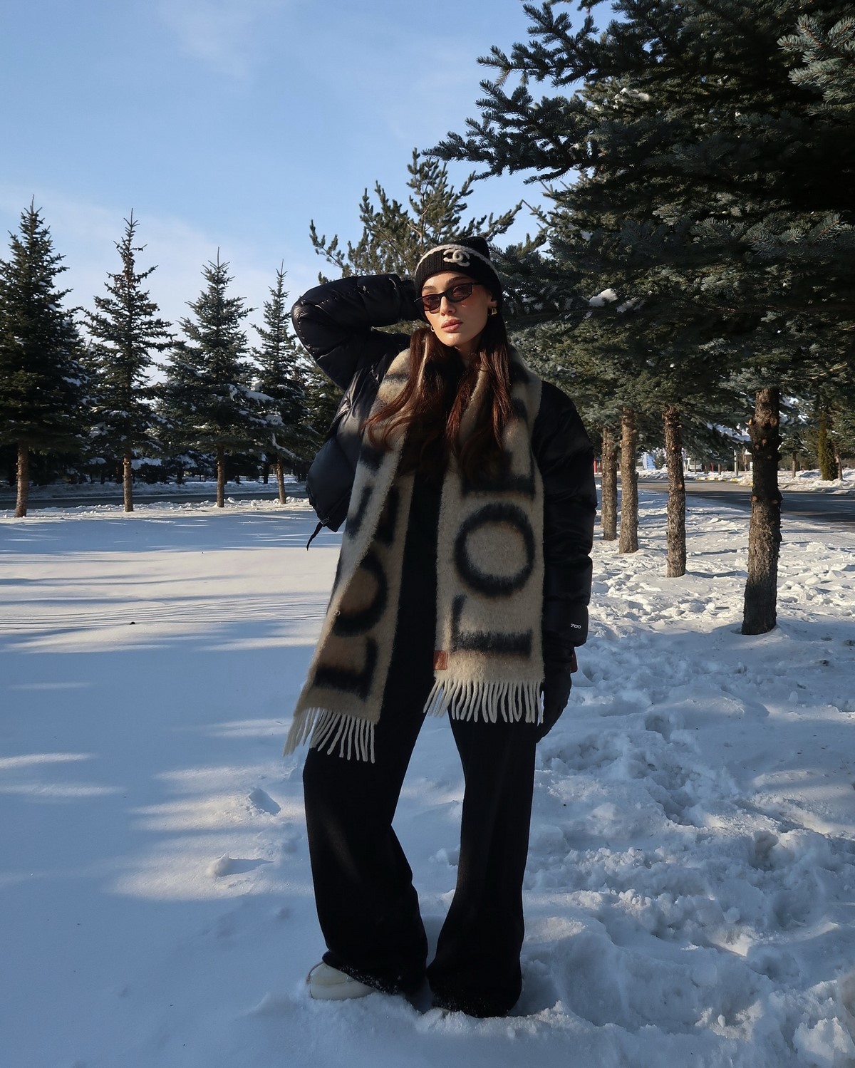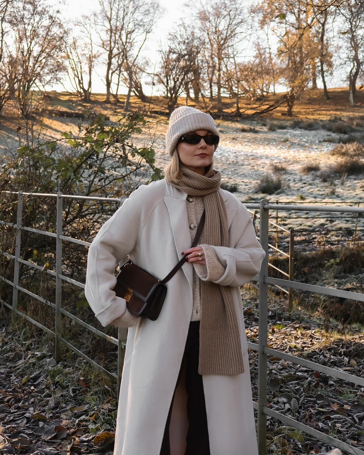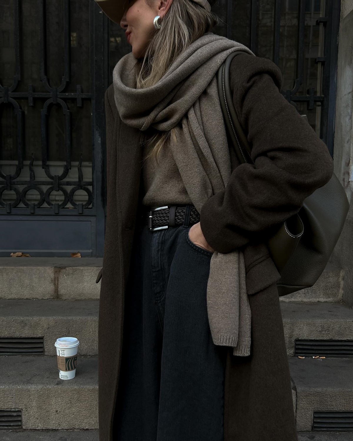 - Довгий шарф — затишний, обгорнутий кілька разів навколо шиї або просто накинутий на плечі, він додає розслабленості.
