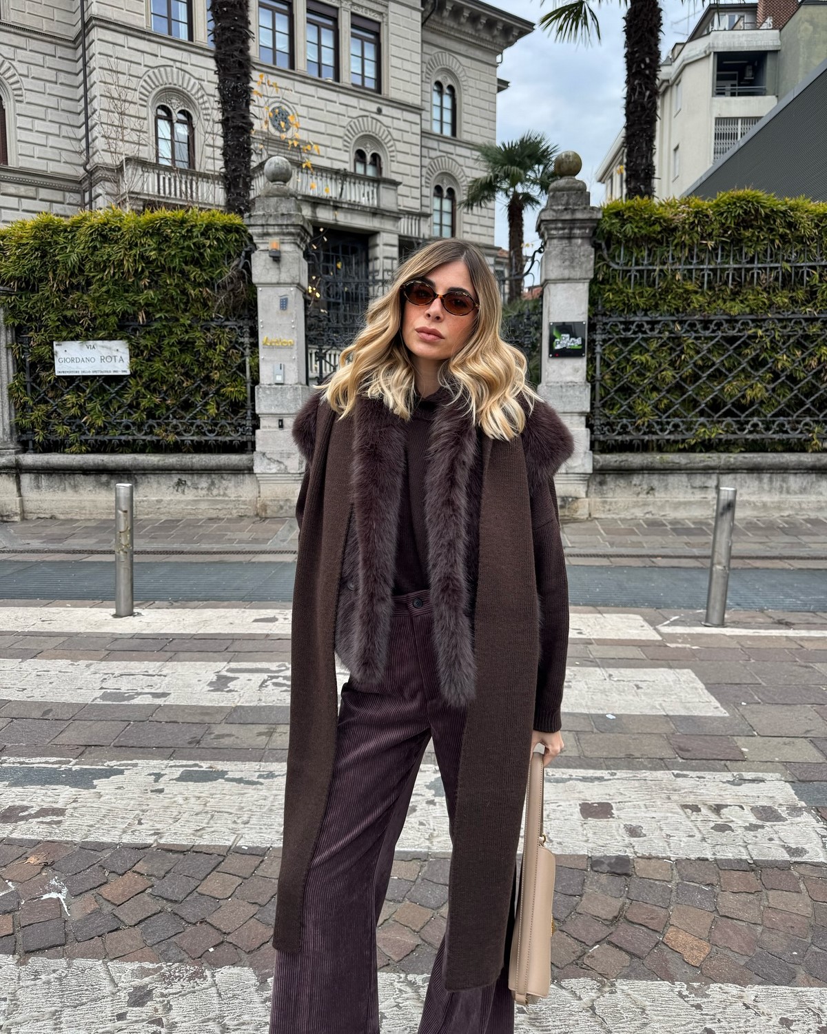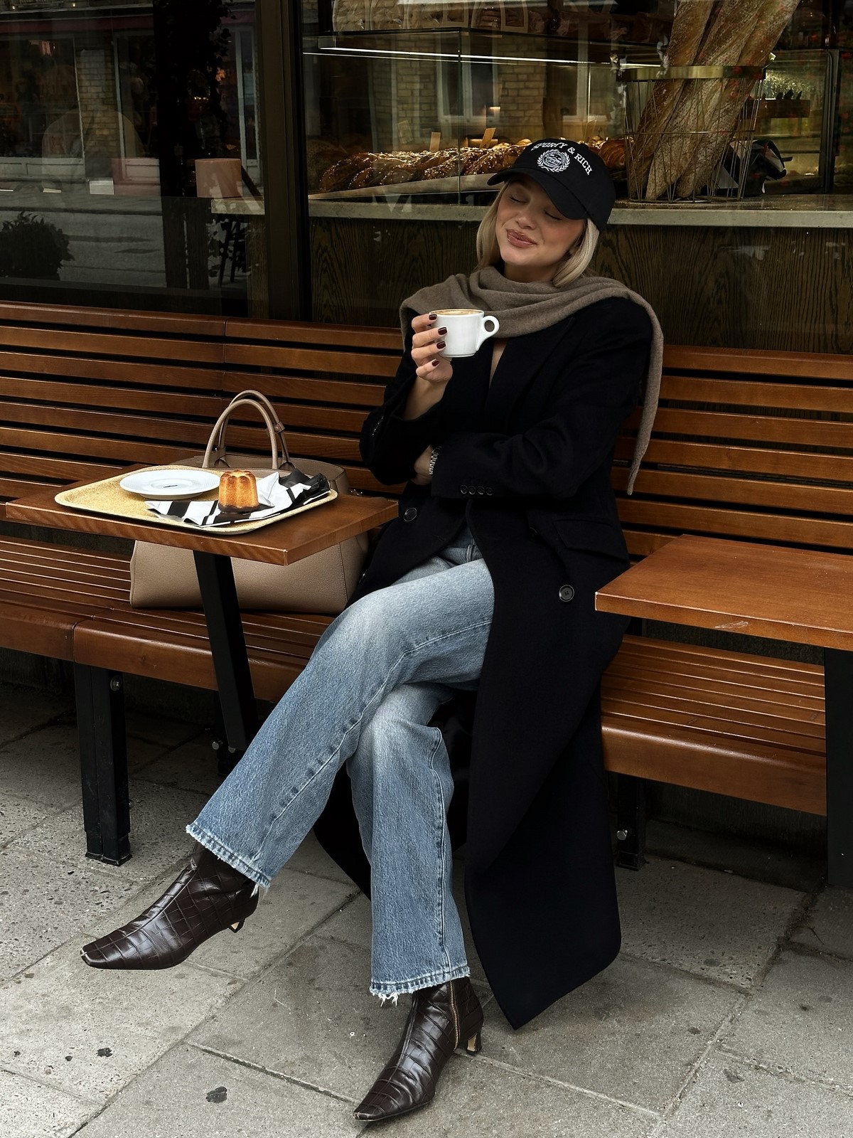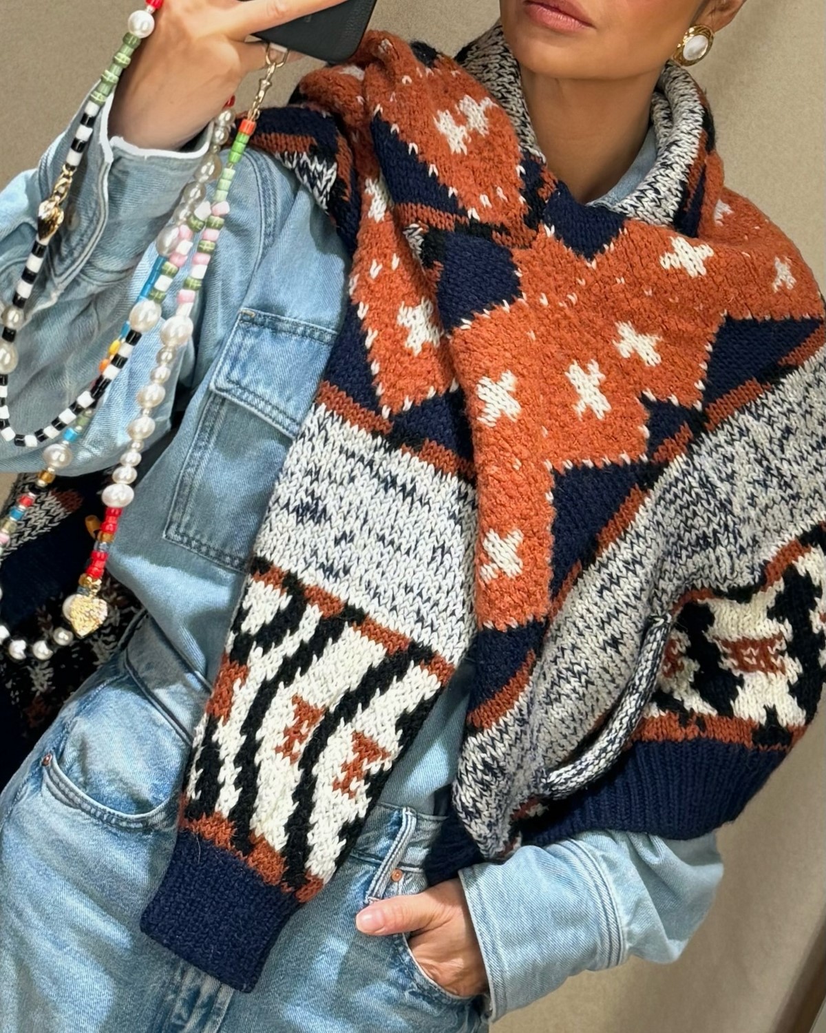 - Довгий шарф — затишний, обгорнутий кілька разів навколо шиї або просто накинутий на плечі, він додає розслабленості.