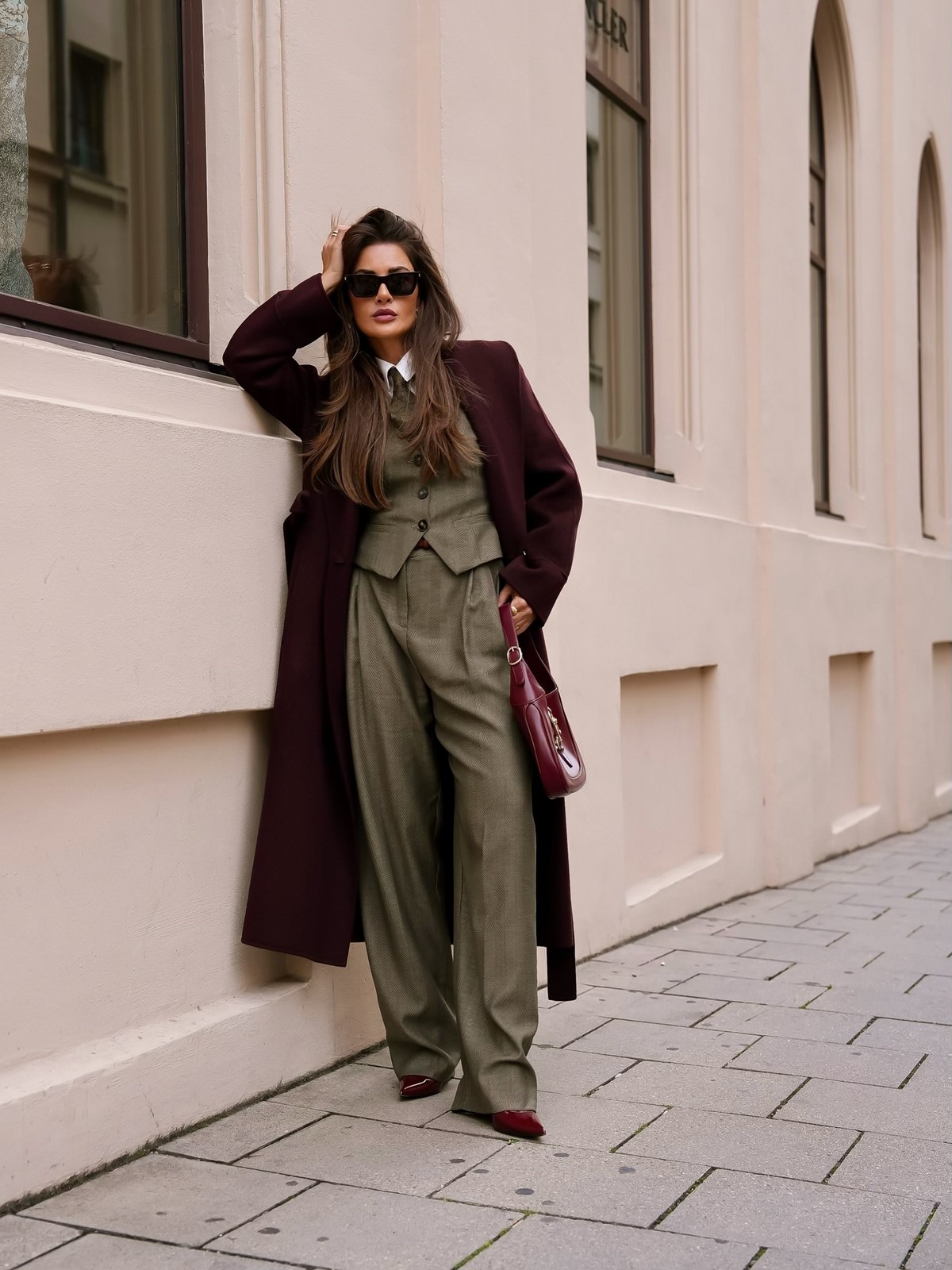 Сучасний брючний костюм — це не тільки офіс, але і повсякденний вихід. У тренді вільні силуети, м’які плечі і довгі жакети. Для ефектного образу вибирайте костюм з оксамиту або твіду, а для кежуал-стилю — моделі з щільного трикотажу. Кольори: молочний, графітовий, бордо і холодний хакі.