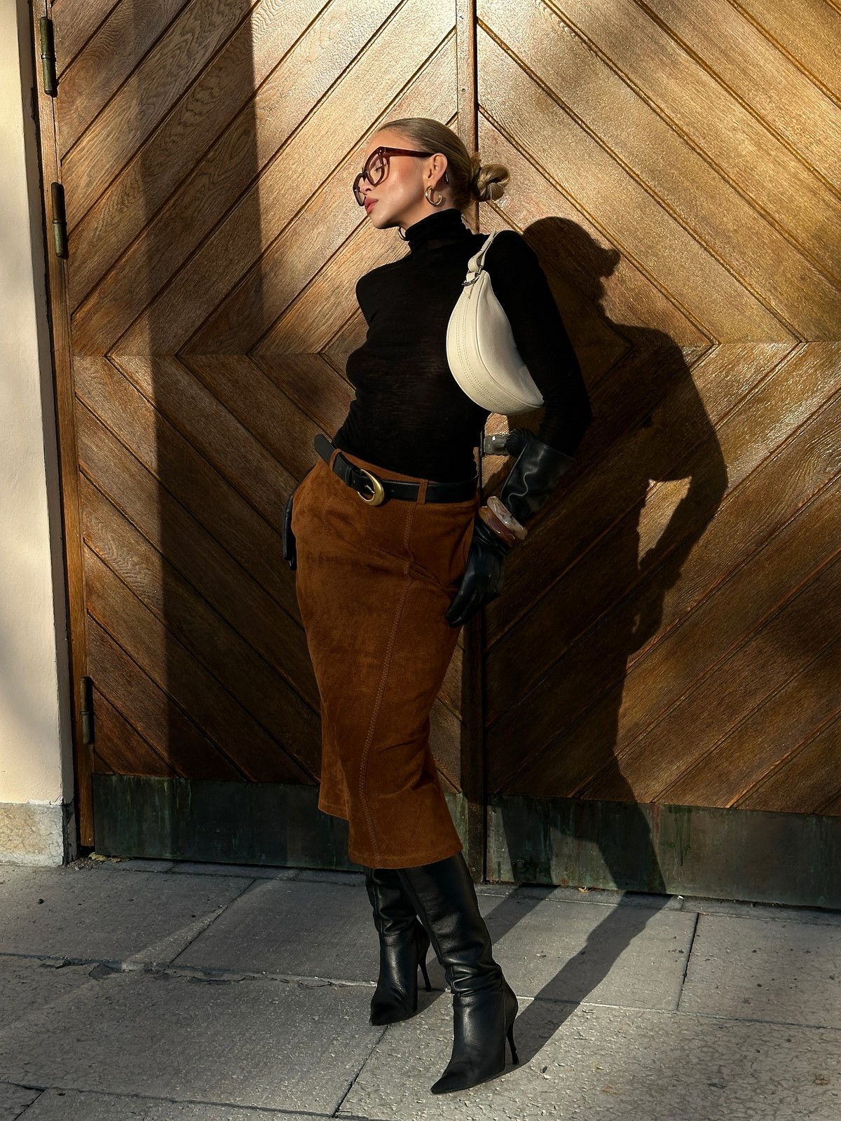 - Замшева сумка — м’яка, приємна на дотик, в приглушених тонах кави і карамелі.