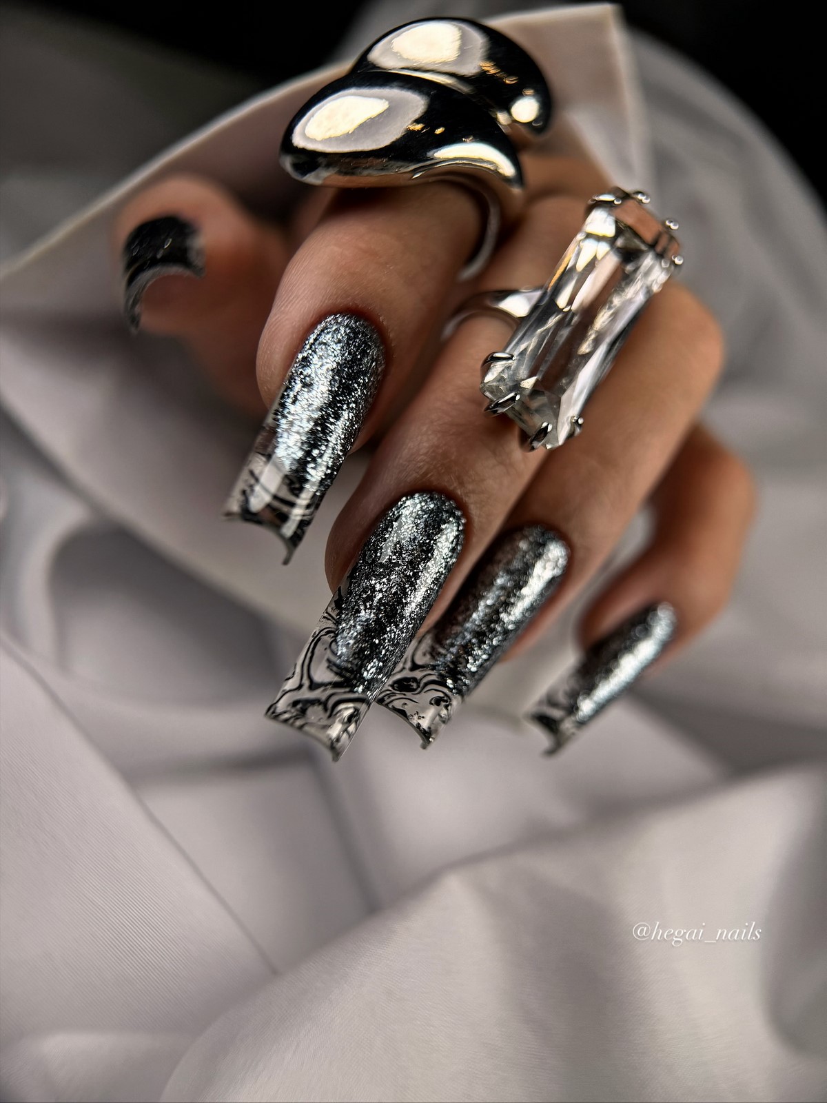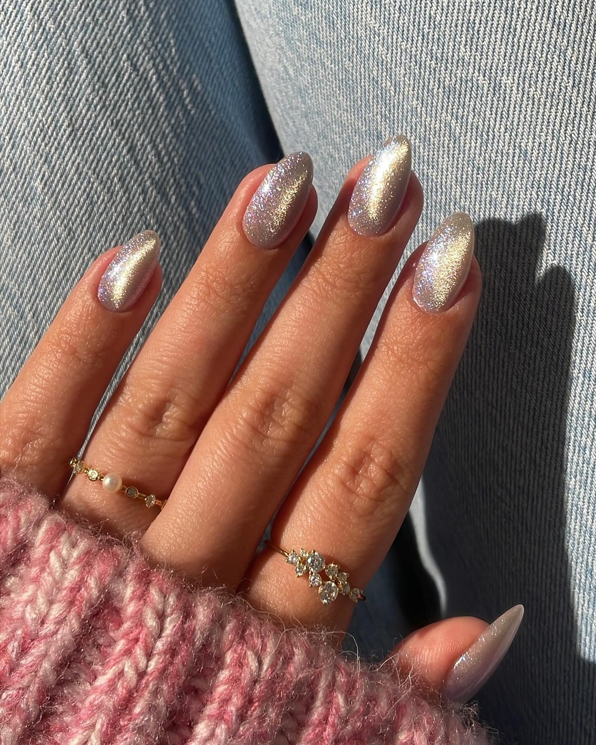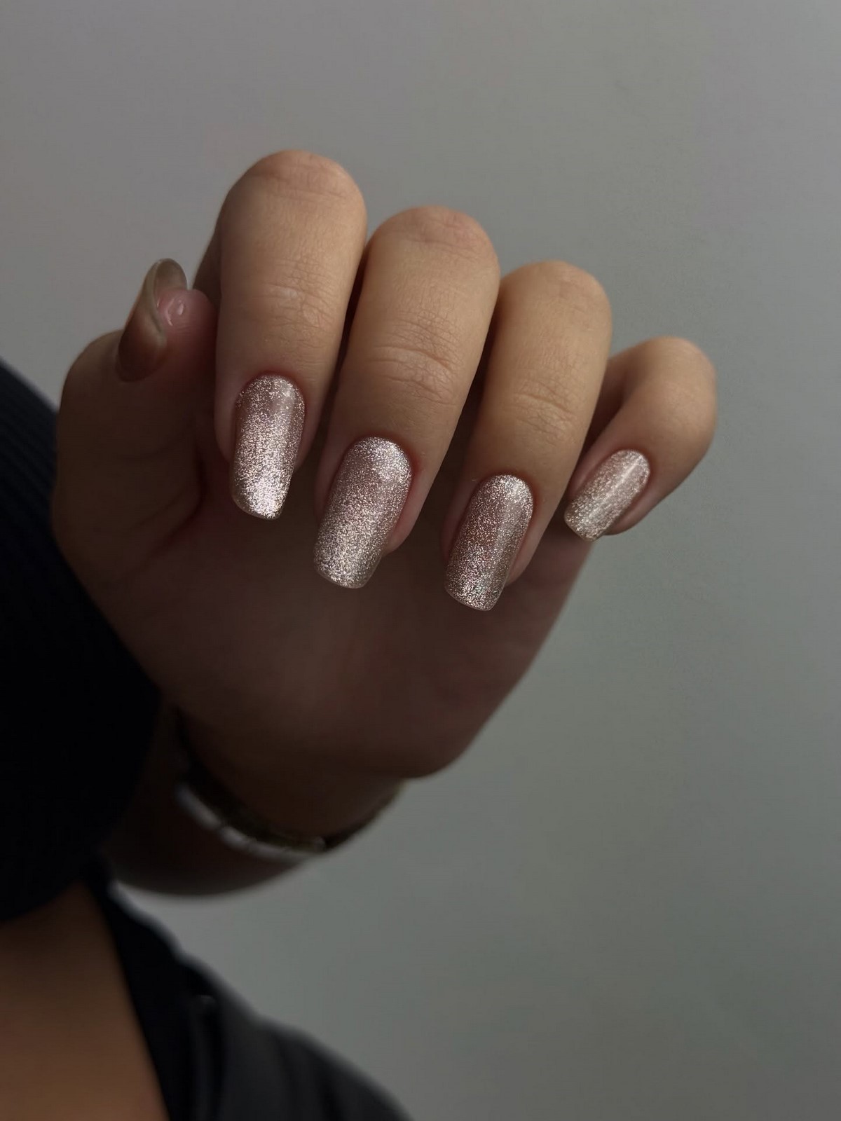 У цей час майстри по всьому світу сміливо поєднують блискучі текстури, переосмислюють зимову класику і додають в дизайн трохи магії. Манікюр грудня 2025 року продовжує традиції глітера і металіка, але робить акцент на глибині кольору, об’ємних деталях, м’якому 3D-блиску і незвичайних світлових ефектах.