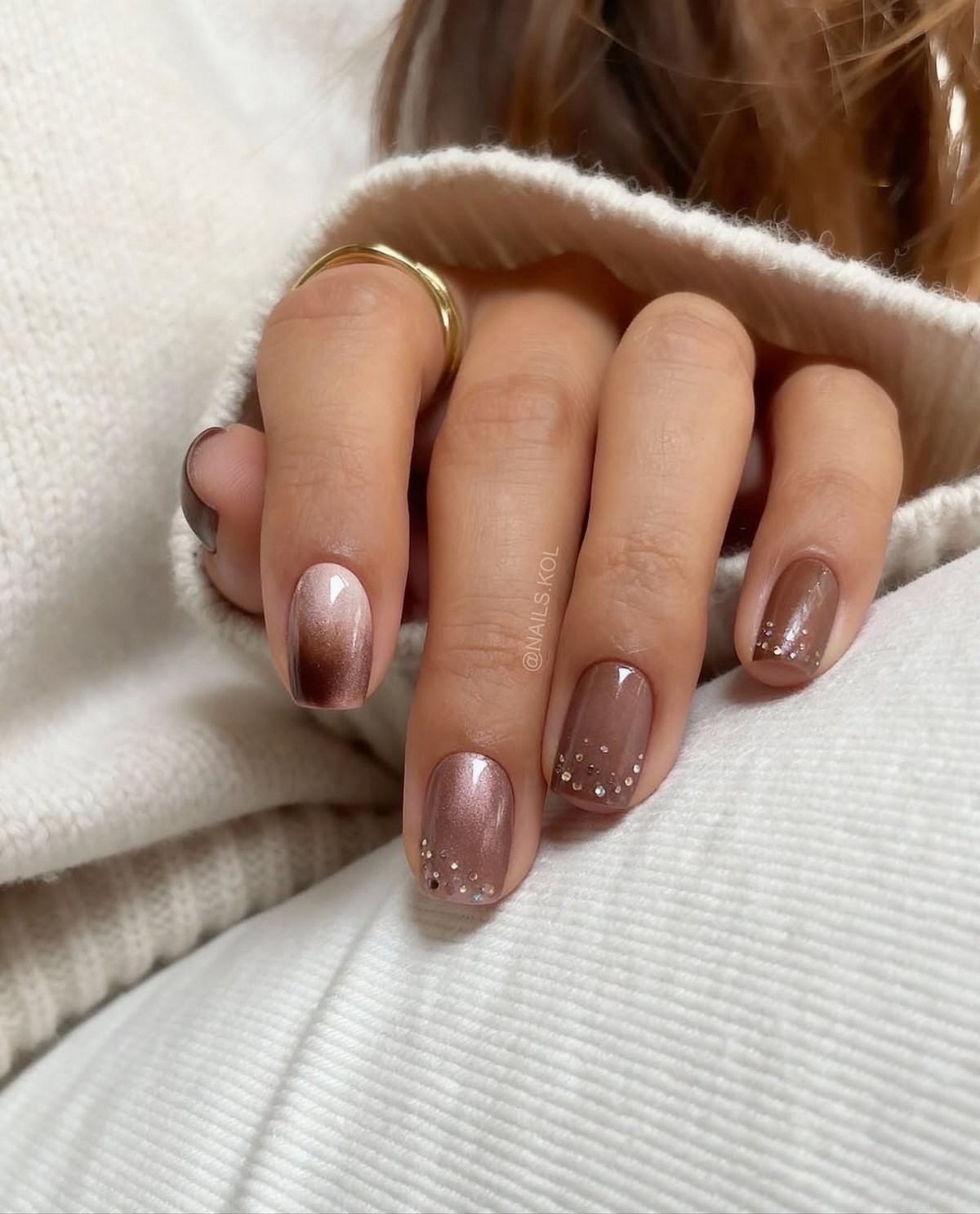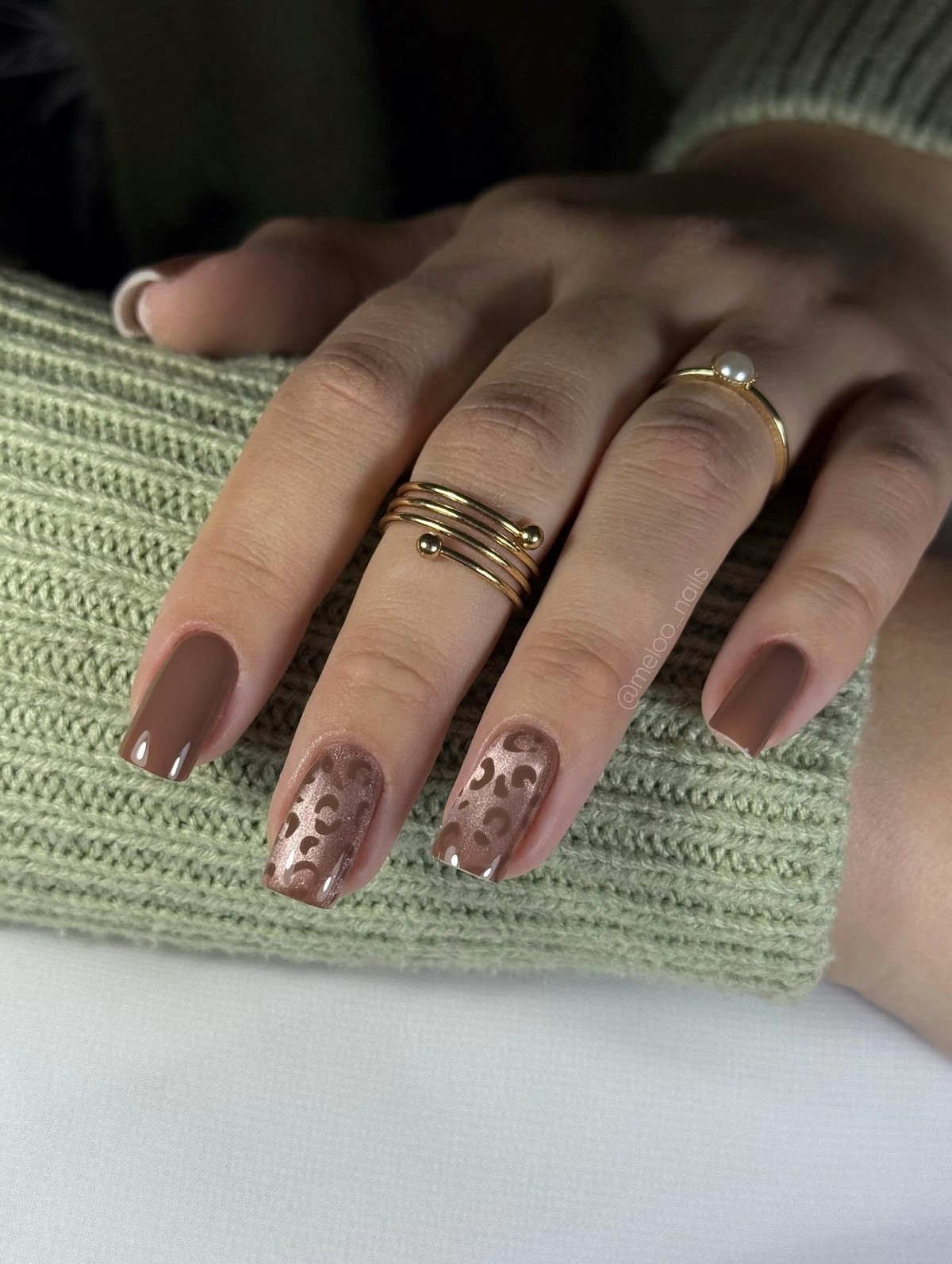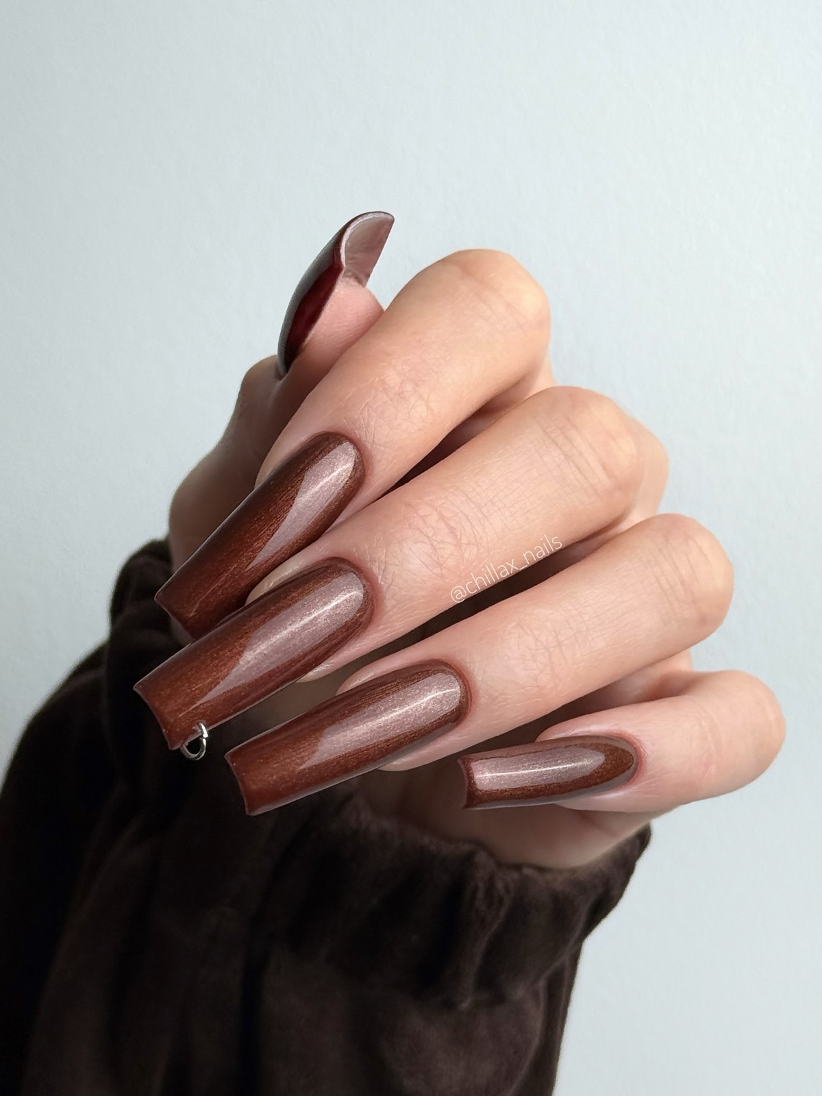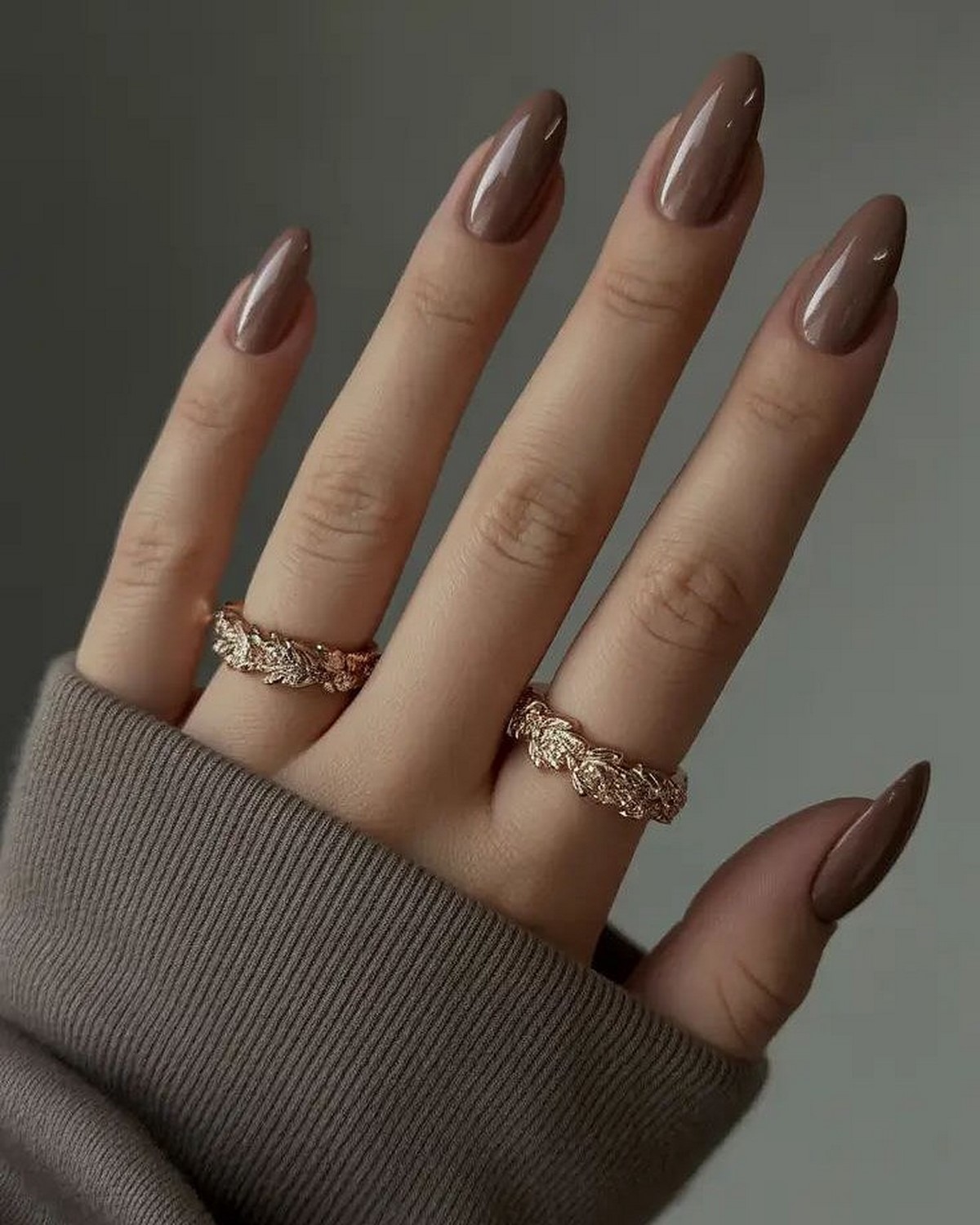 У грудні 2025 особливо популярні шоколадні дизайни з м’яким золотистим шиммером або ледь помітними світіннями по центру нігтя. Такий манікюр виглядає зі смаком і підходить для повсякденного стилю.