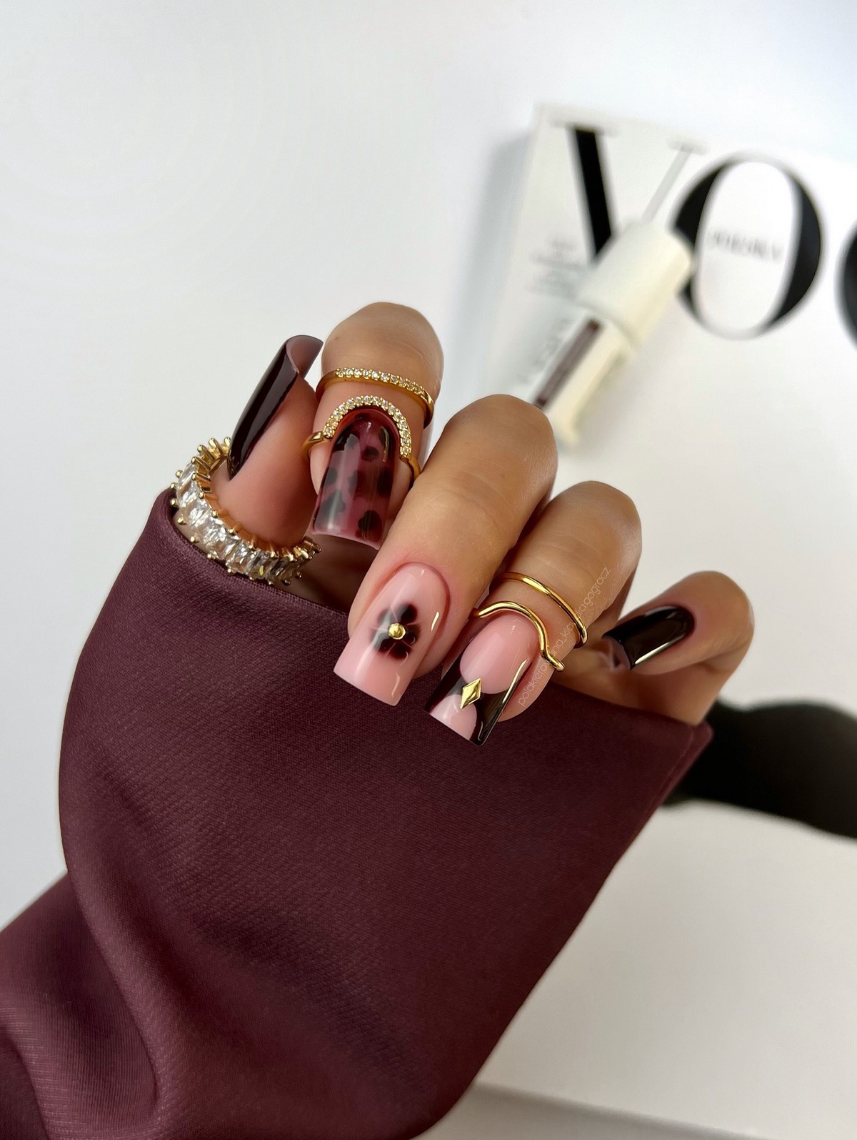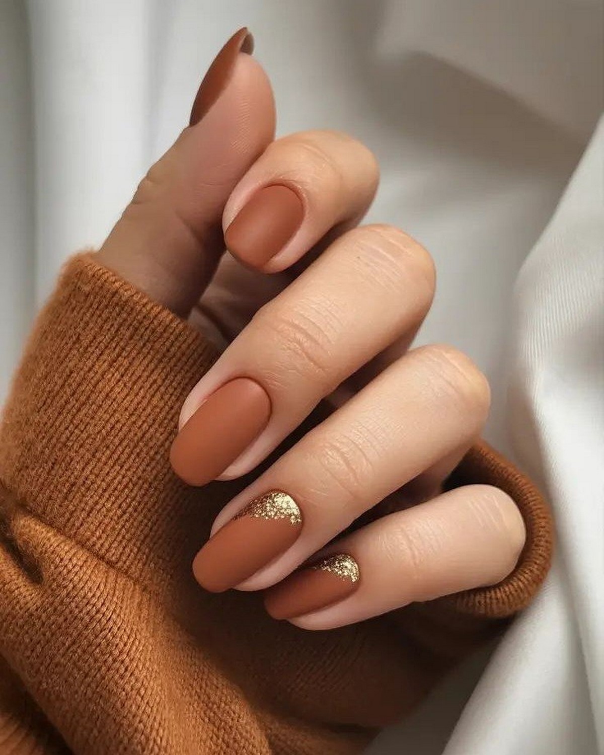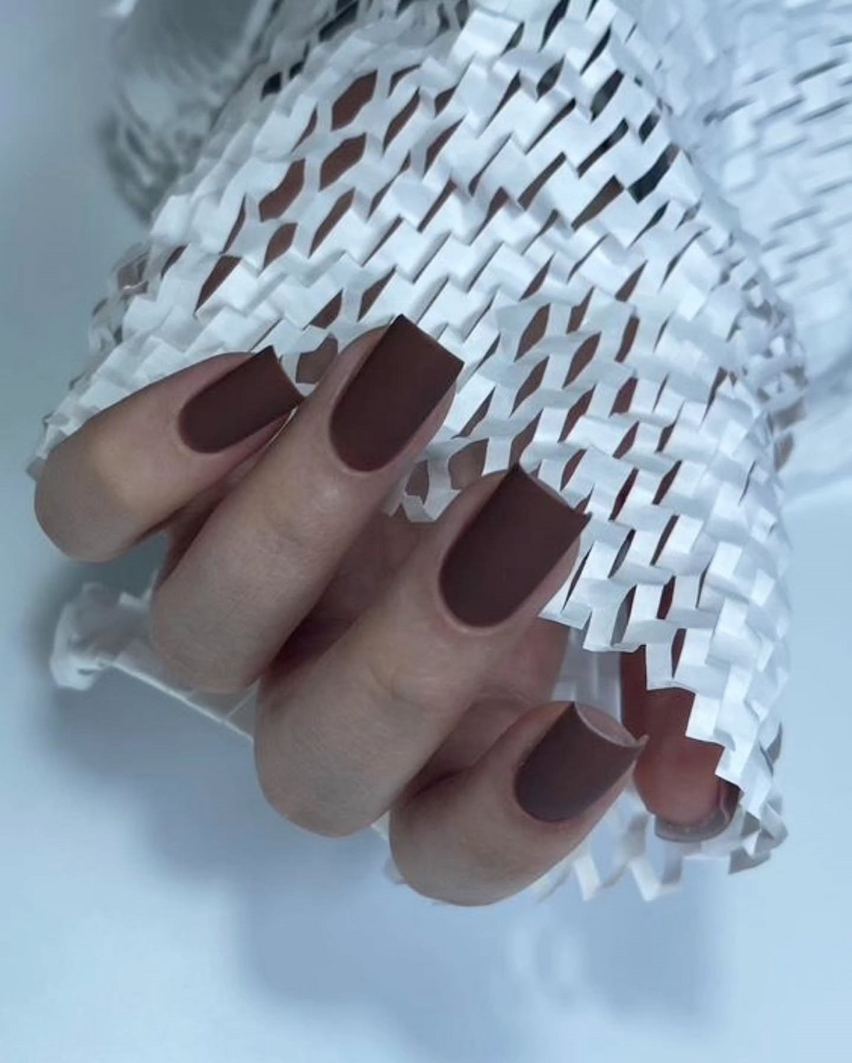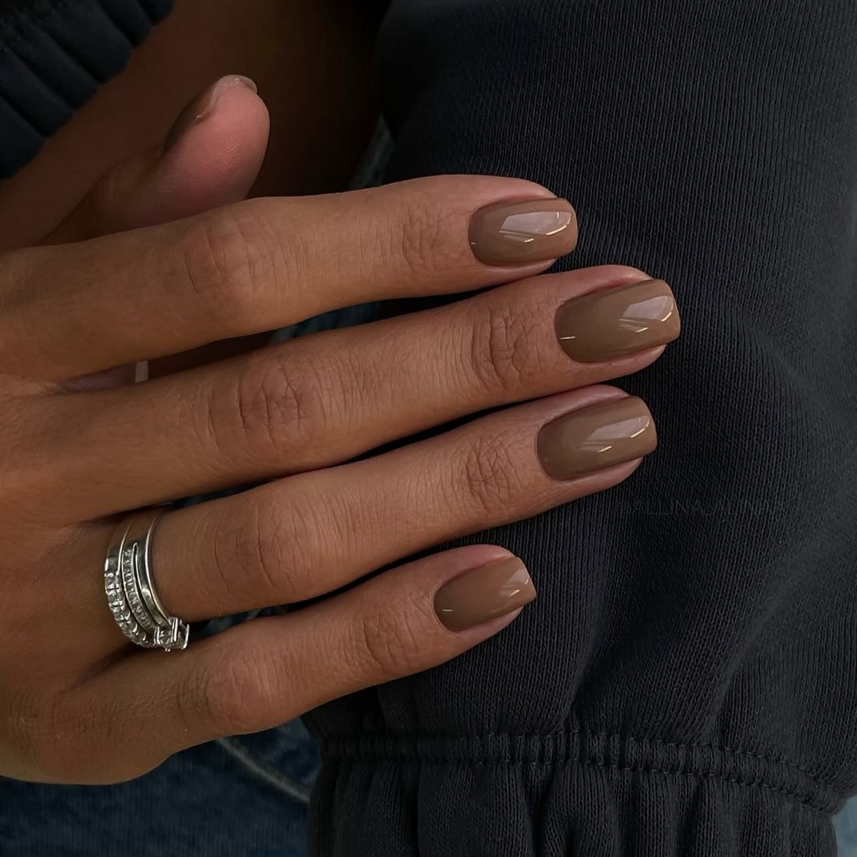 У грудні 2025 особливо популярні шоколадні дизайни з м’яким золотистим шиммером або ледь помітними світіннями по центру нігтя. Такий манікюр виглядає зі смаком і підходить для повсякденного стилю.