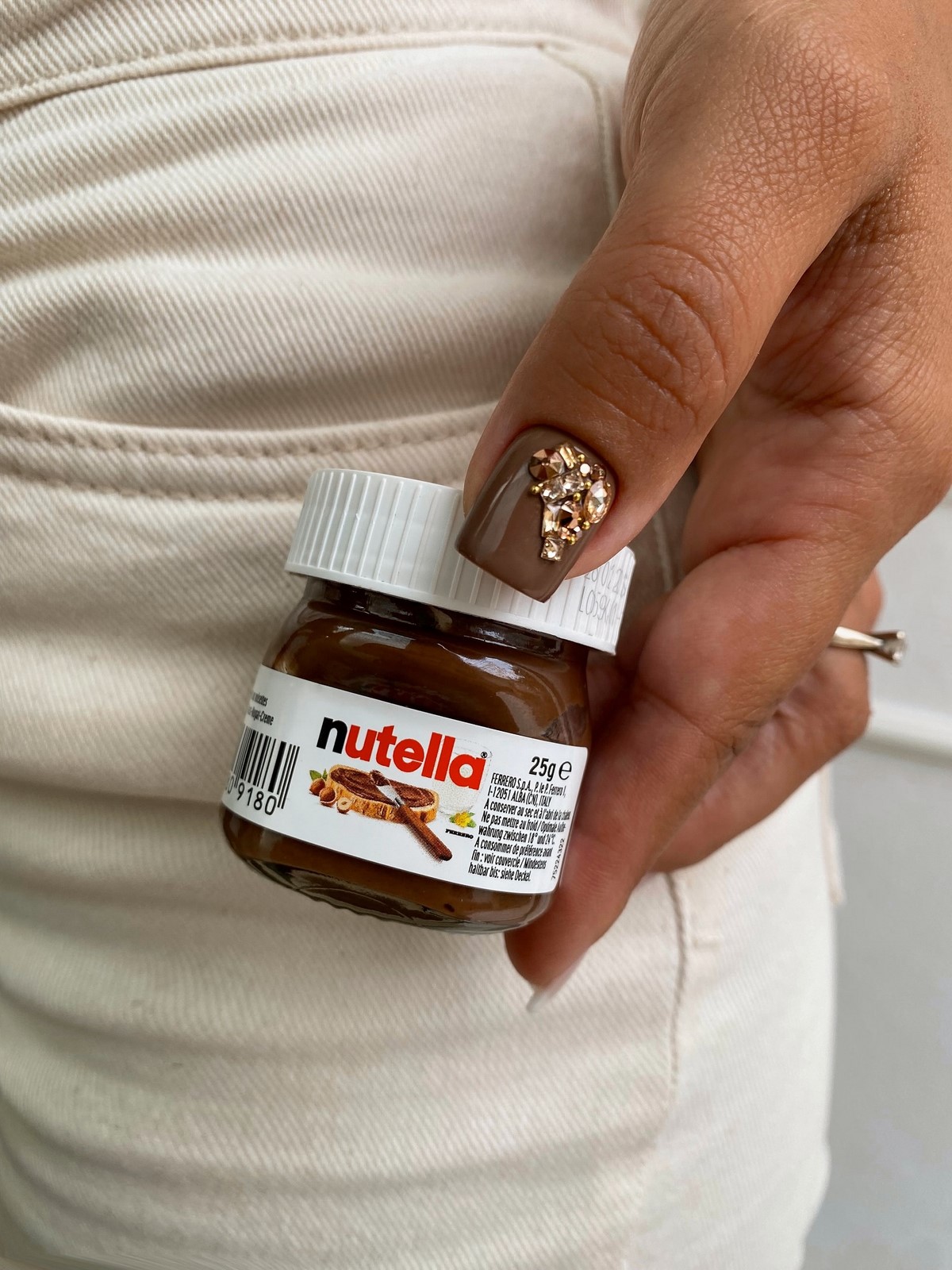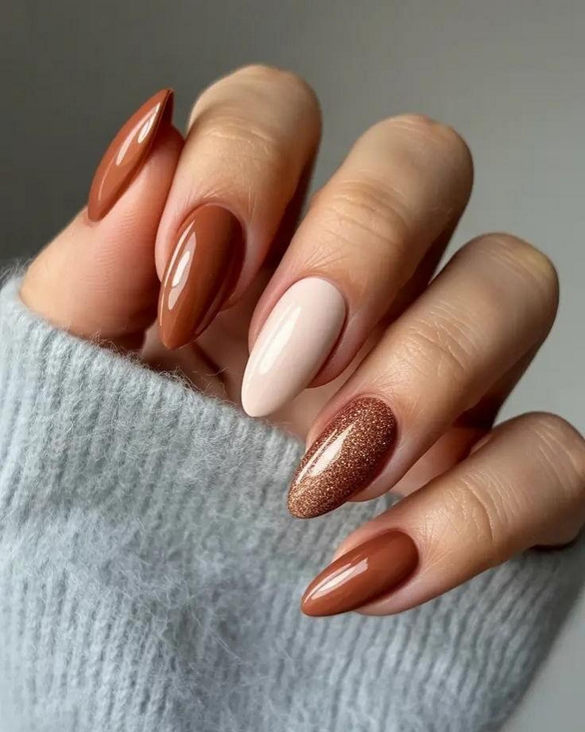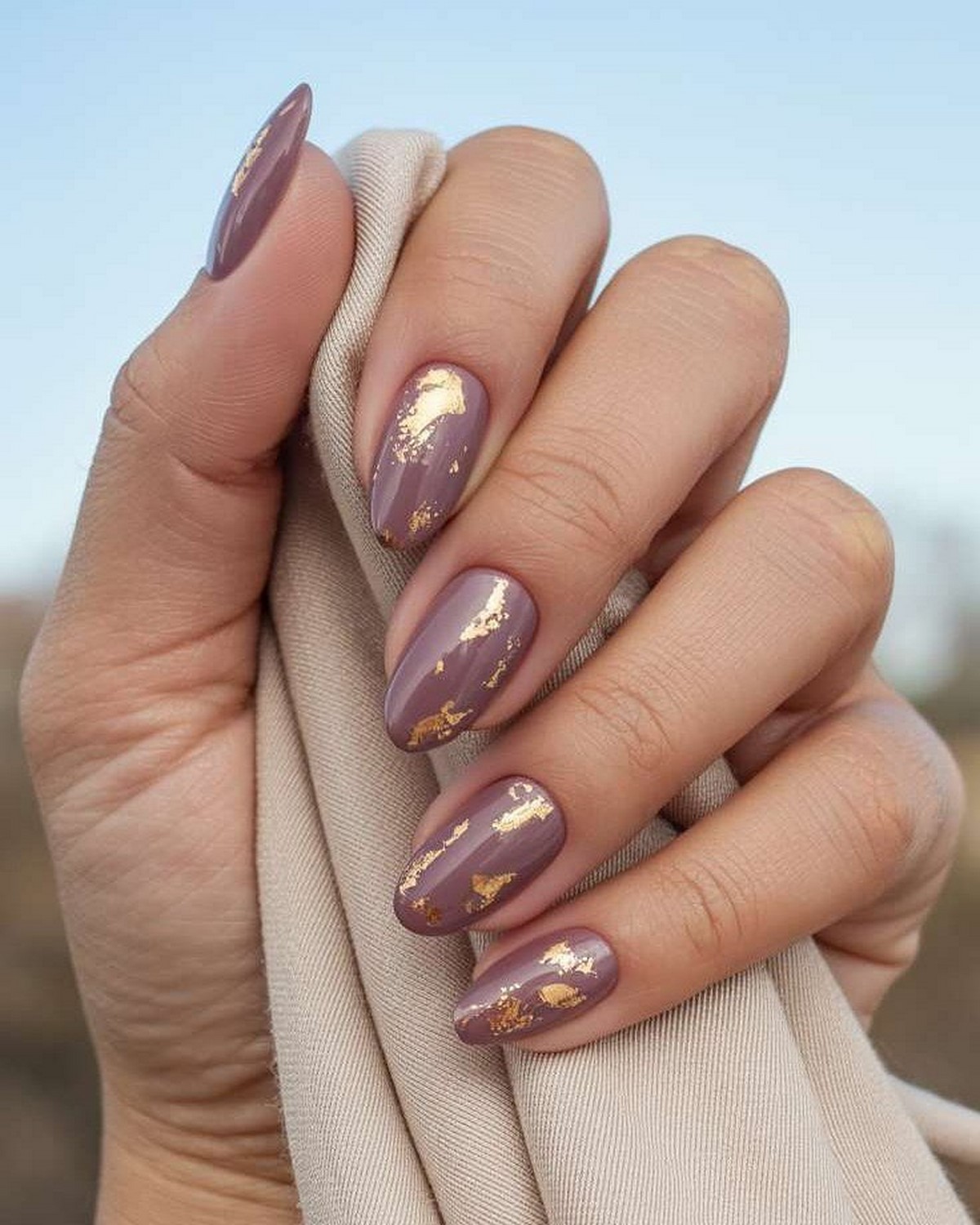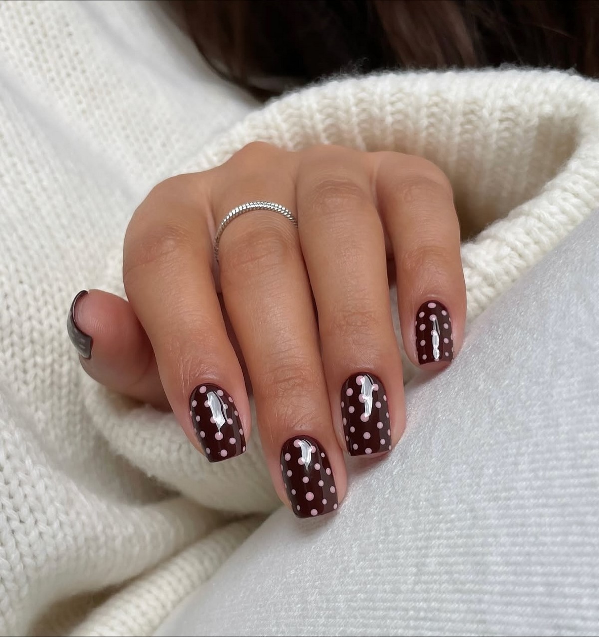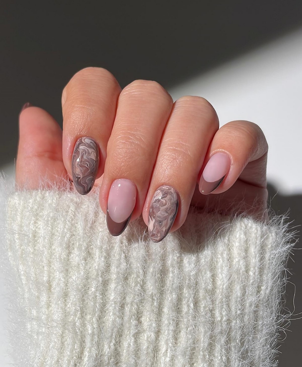 У грудні 2025 особливо популярні шоколадні дизайни з м’яким золотистим шиммером або ледь помітними світіннями по центру нігтя. Такий манікюр виглядає зі смаком і підходить для повсякденного стилю.
