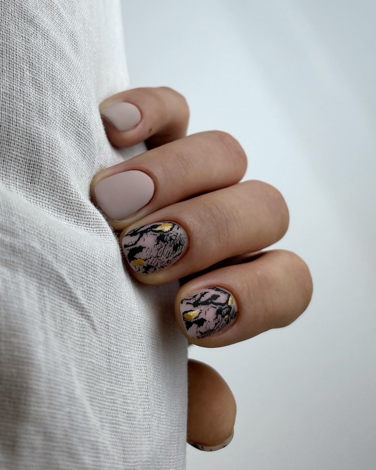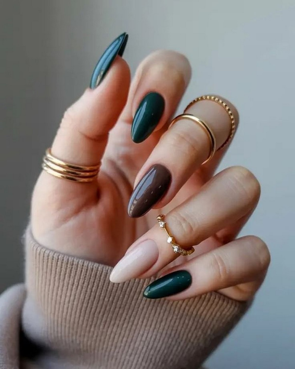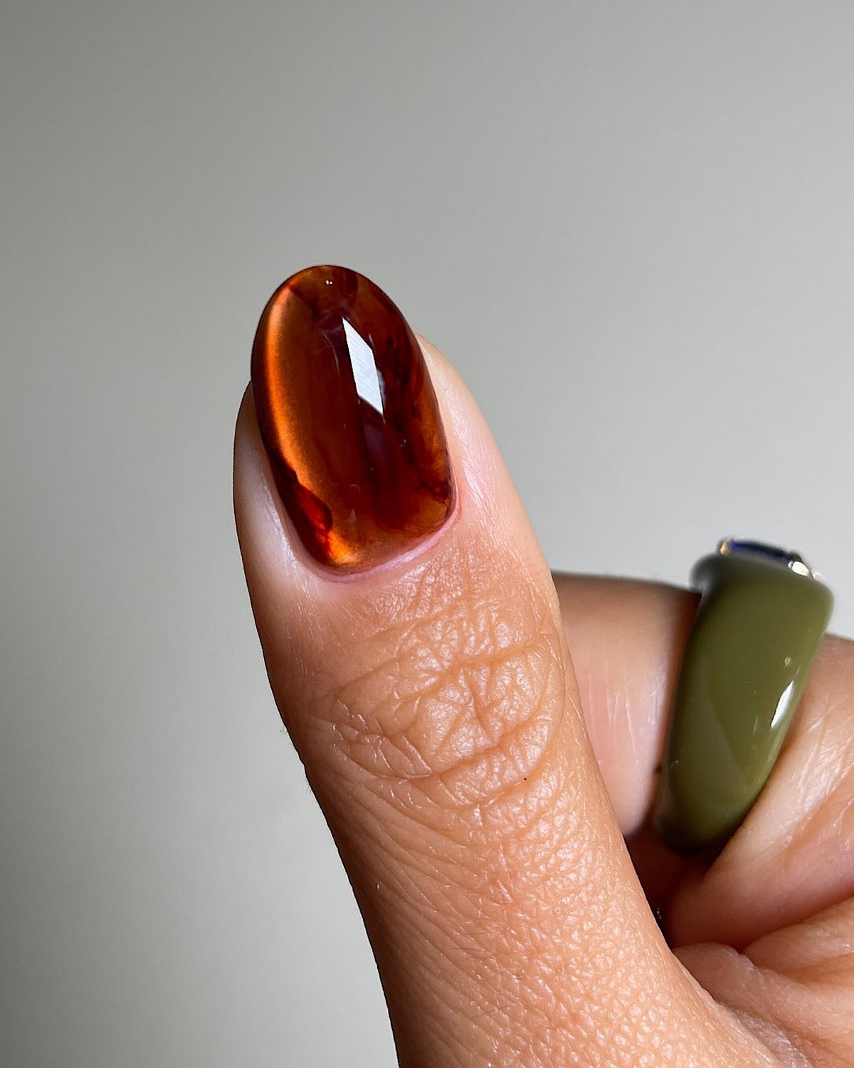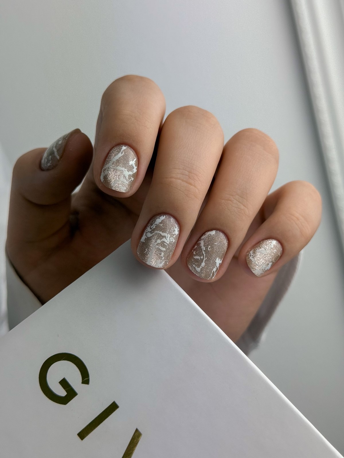 У грудні 2025 особливо популярні шоколадні дизайни з м’яким золотистим шиммером або ледь помітними світіннями по центру нігтя. Такий манікюр виглядає зі смаком і підходить для повсякденного стилю.