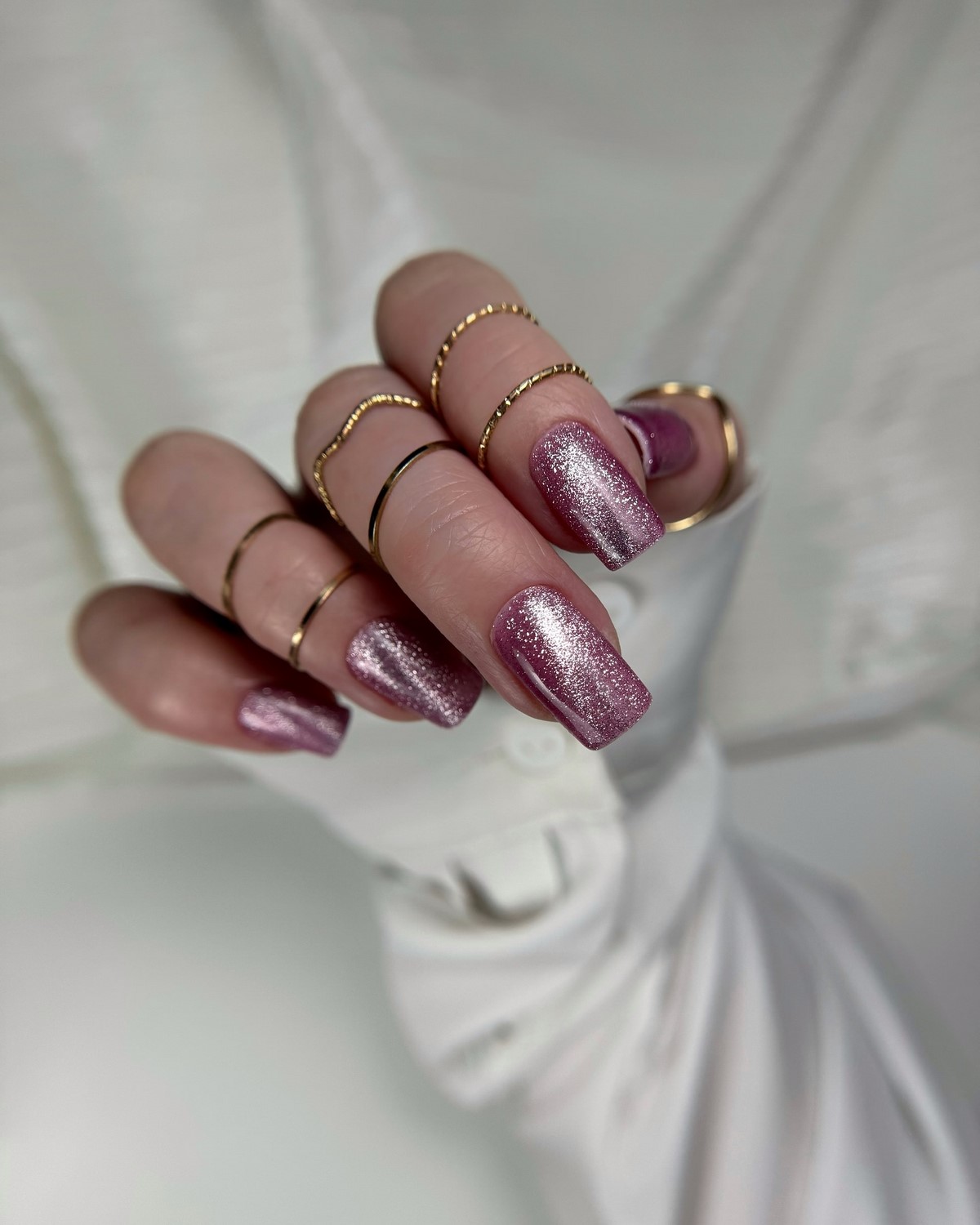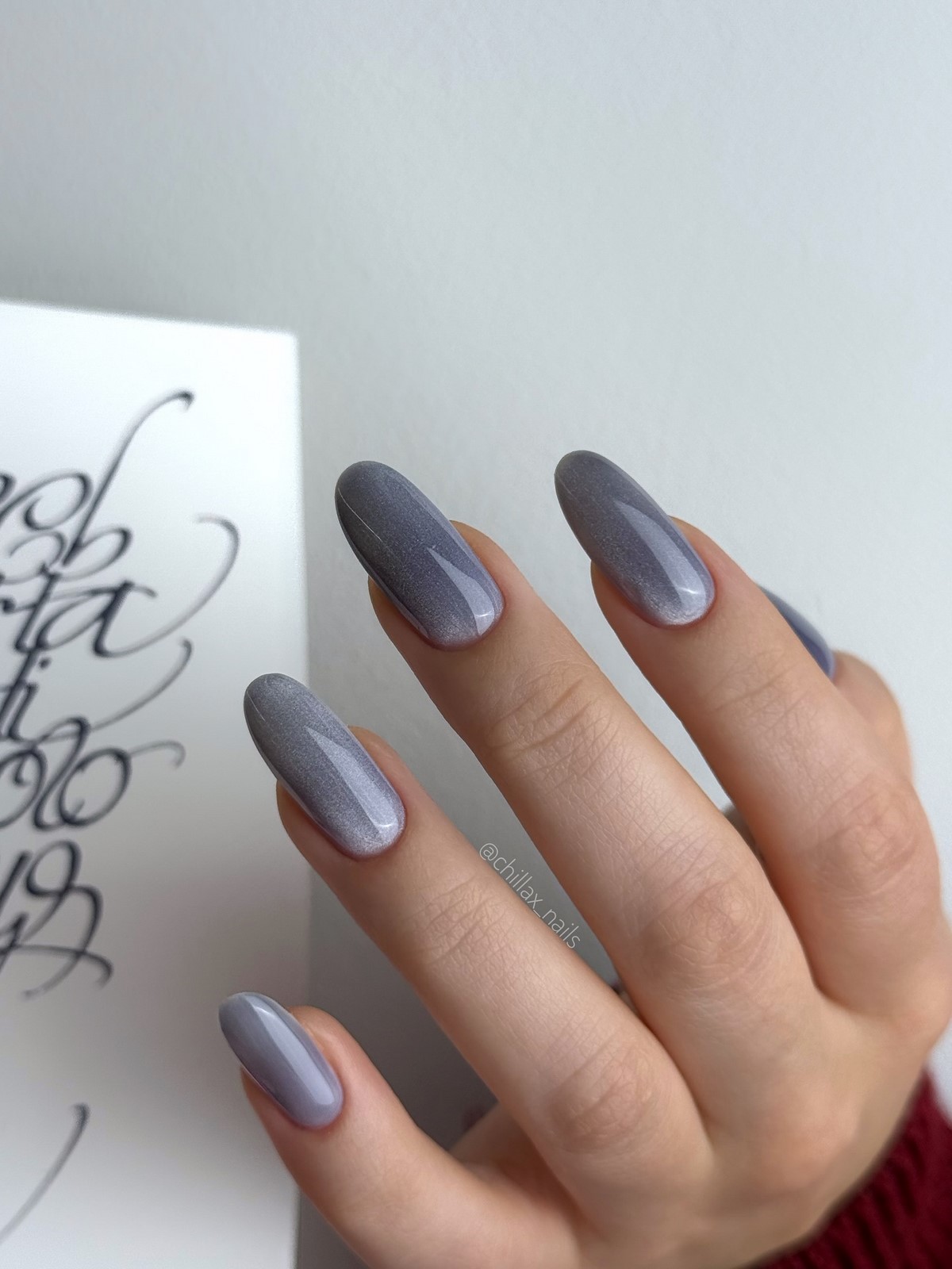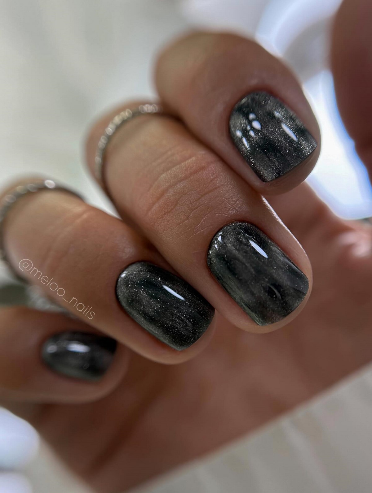 Ефект «Котяче око» переживає новий пік популярності завдяки поліпшеним магнітним гель-лакам, що створюють більш глибоке і живе сяйво. У грудні тренд тримається на холодних відтінках: синьому, сталевому, крижаному зеленому.