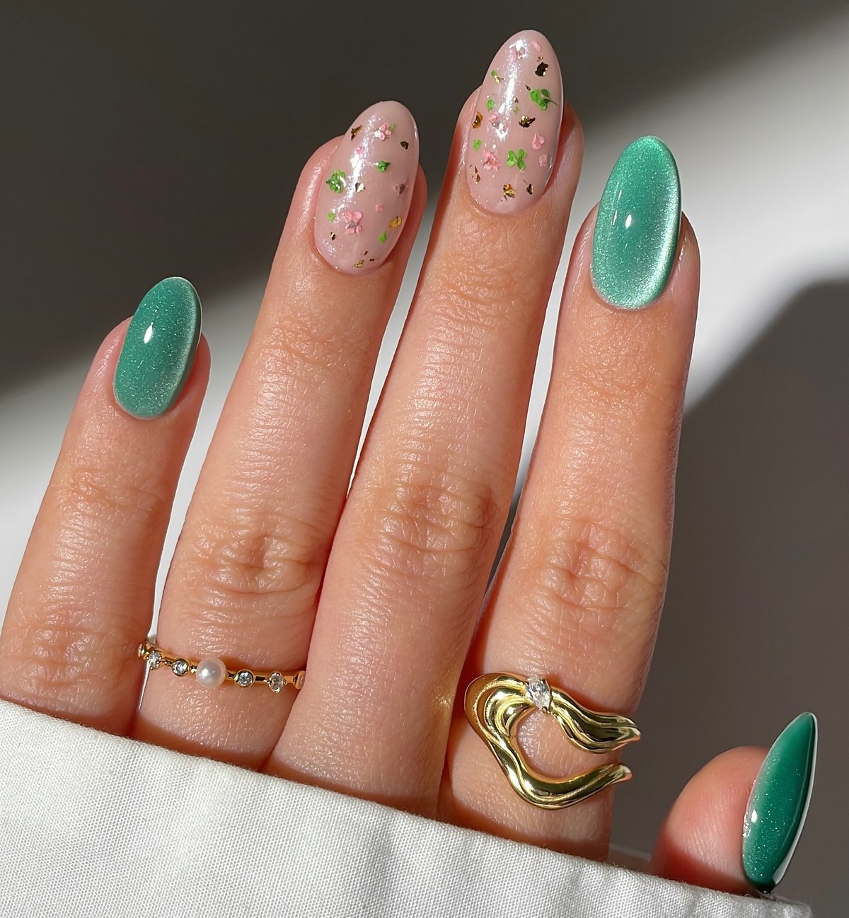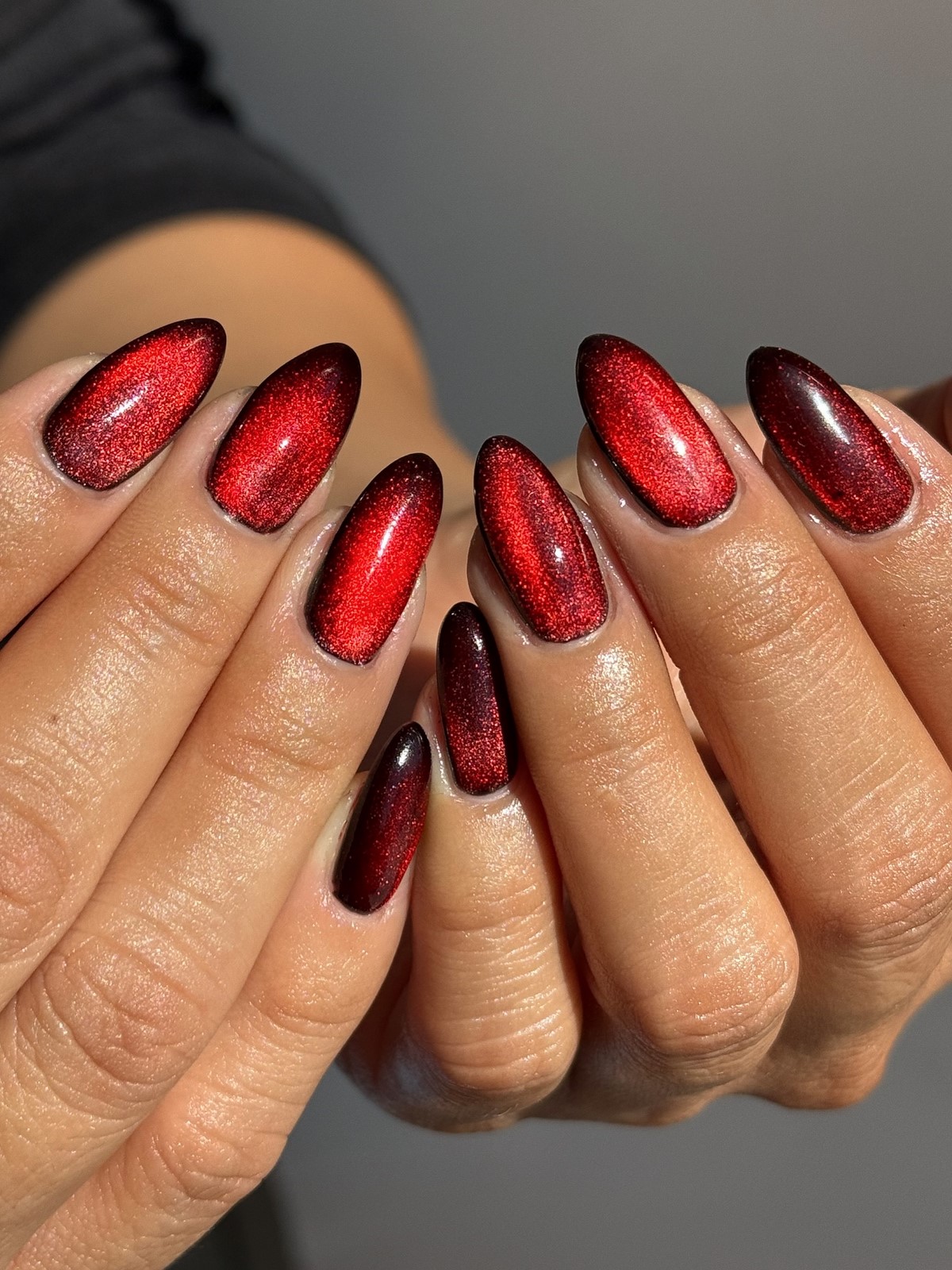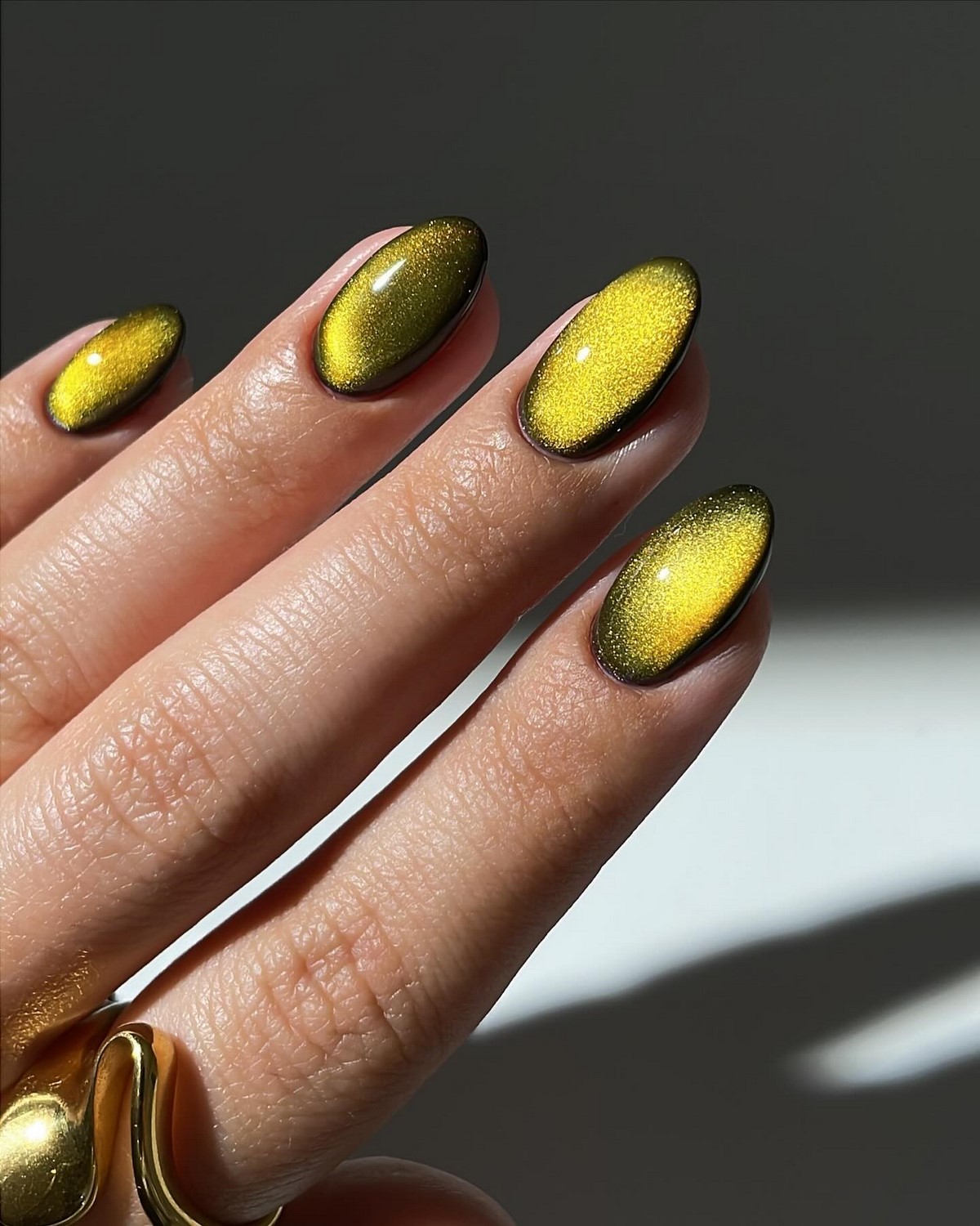 Ефект «Котяче око» переживає новий пік популярності завдяки поліпшеним магнітним гель-лакам, що створюють більш глибоке і живе сяйво. У грудні тренд тримається на холодних відтінках: синьому, сталевому, крижаному зеленому.