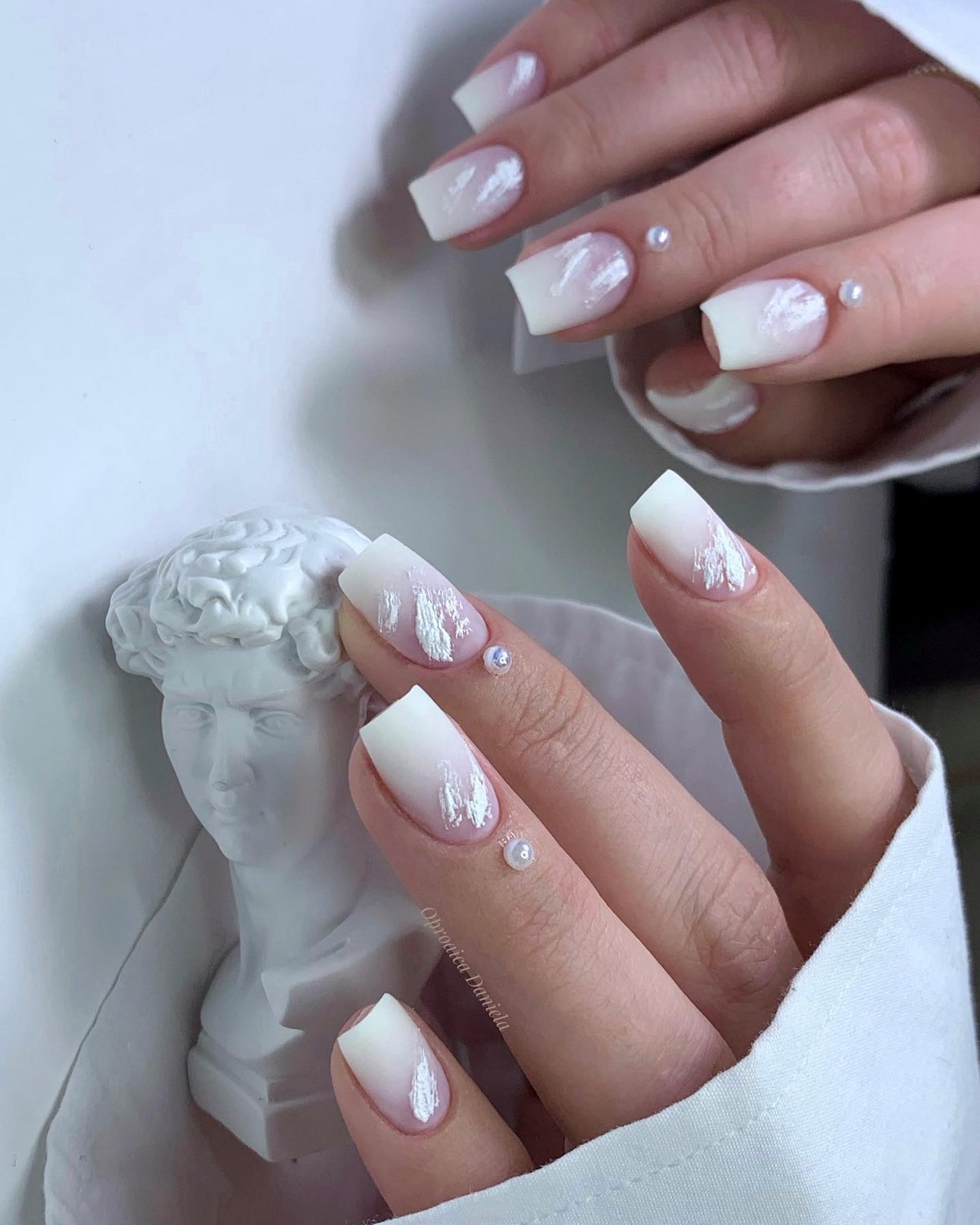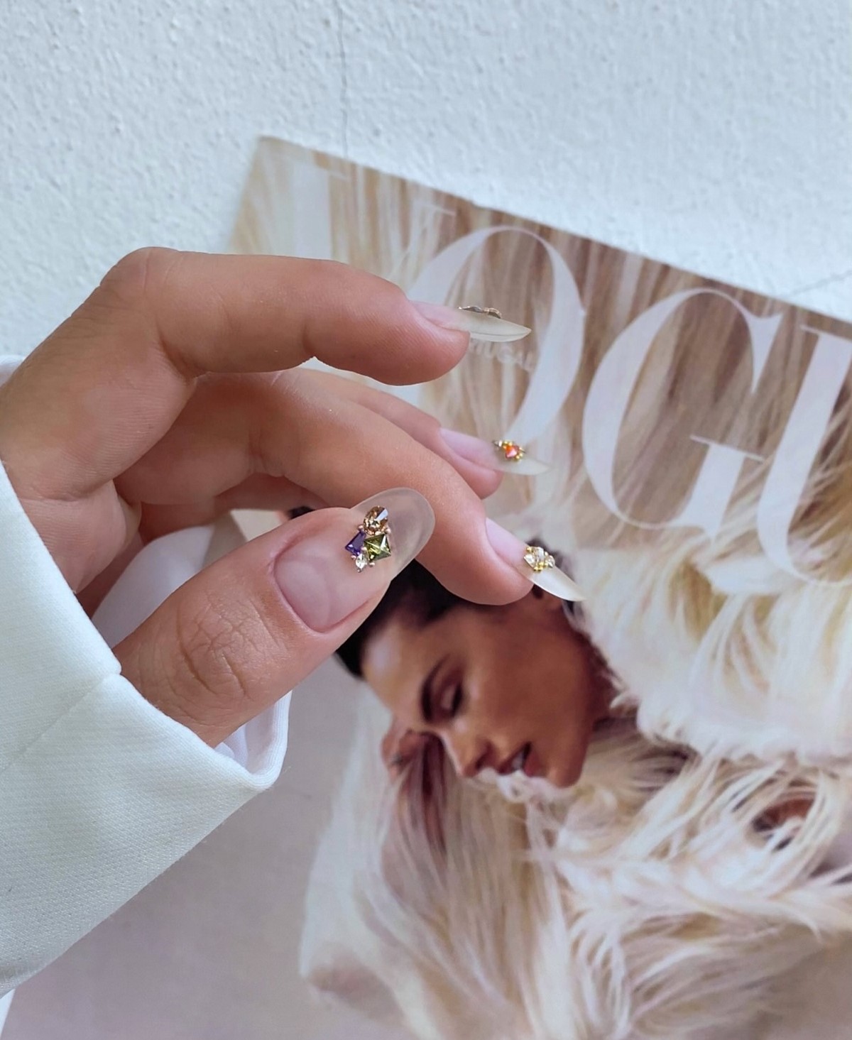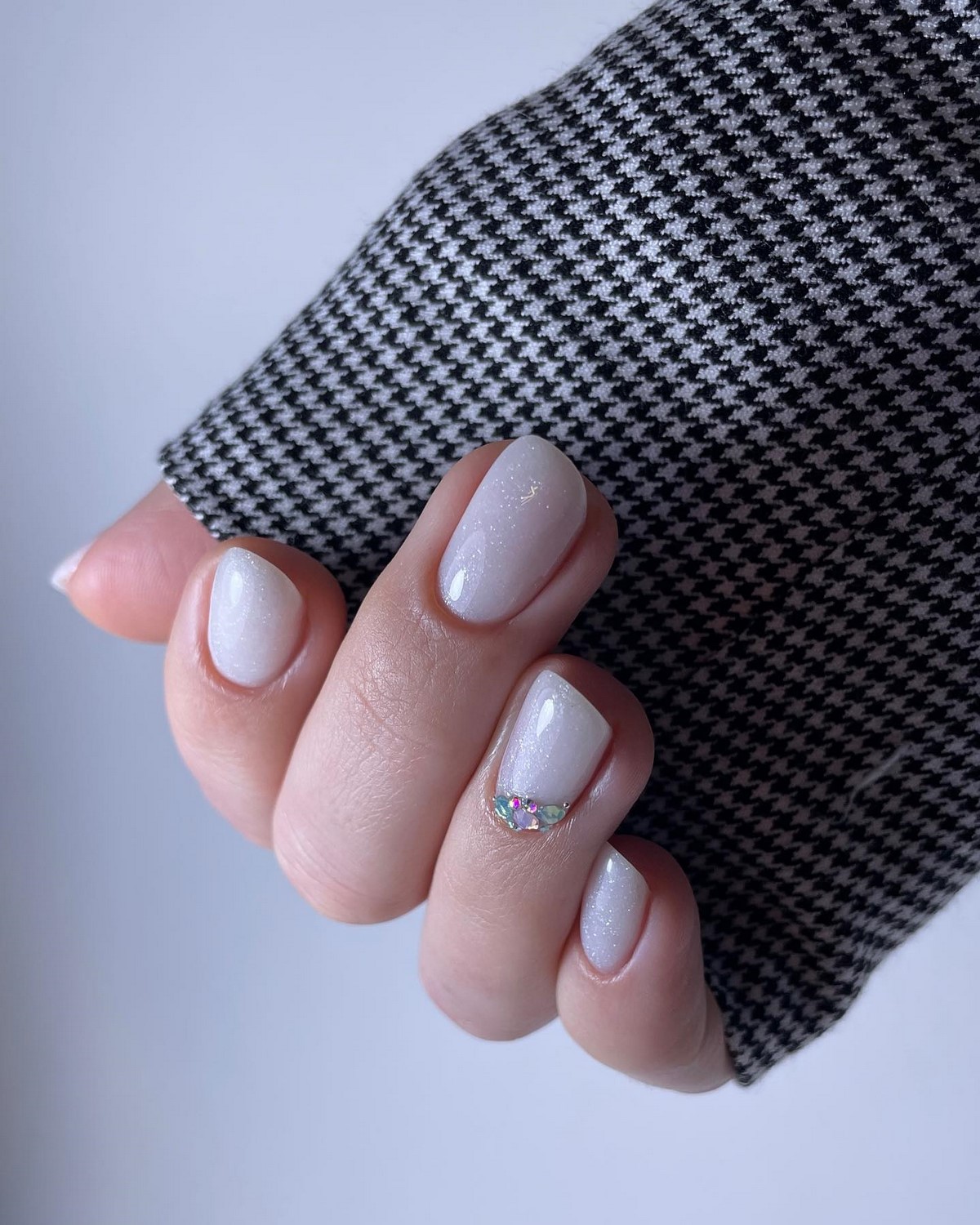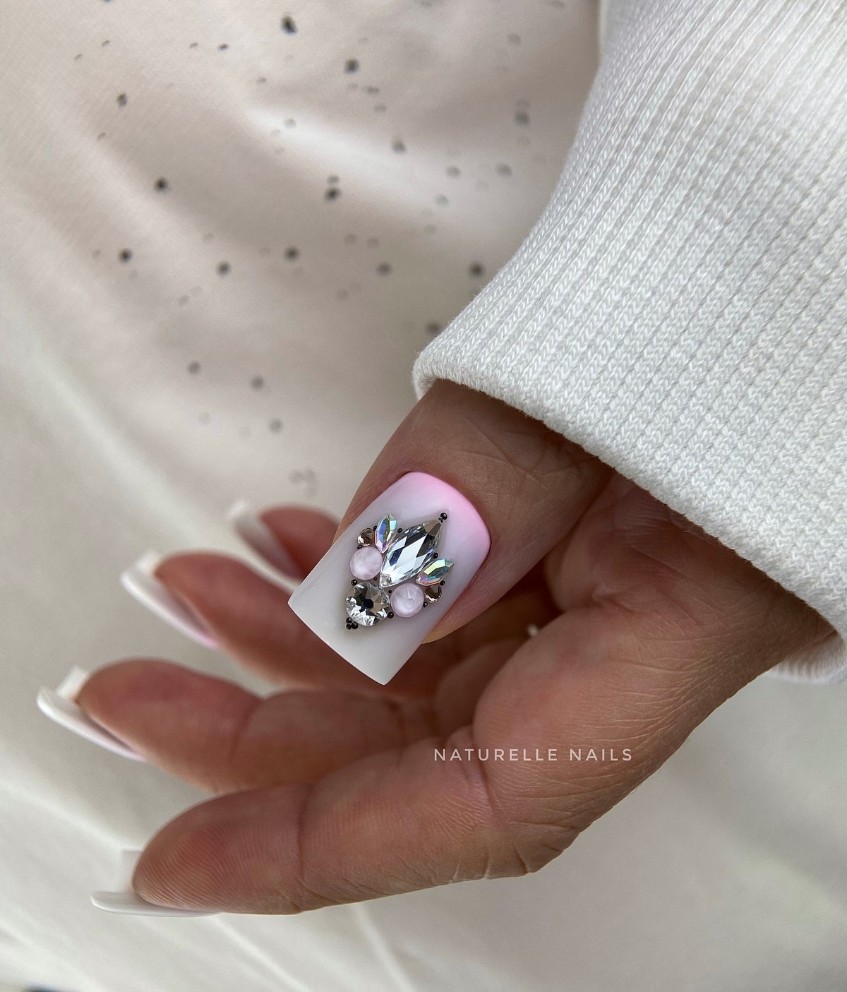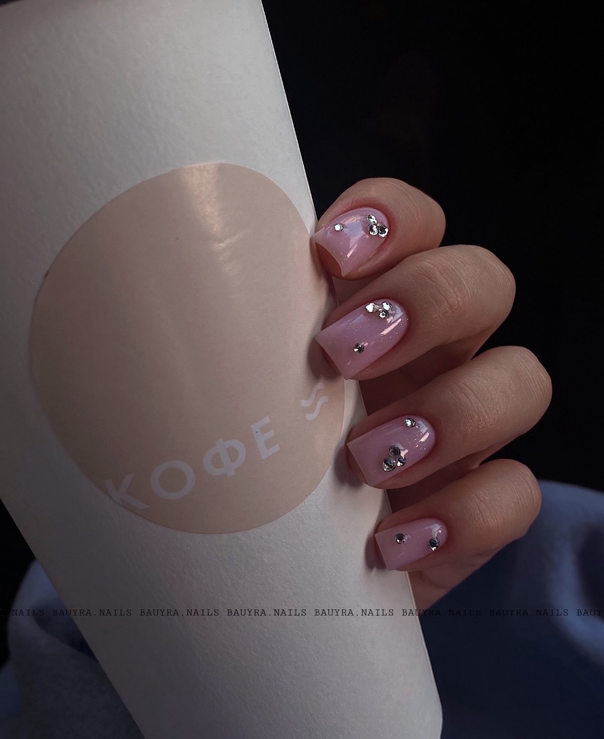 Такий підхід робить манікюр більш витонченим і елегантним — без відчуття перевантаженості. Особливо актуальні холодні відтінки стразів: срібло, крижаний блакитний, прозорий кристал.