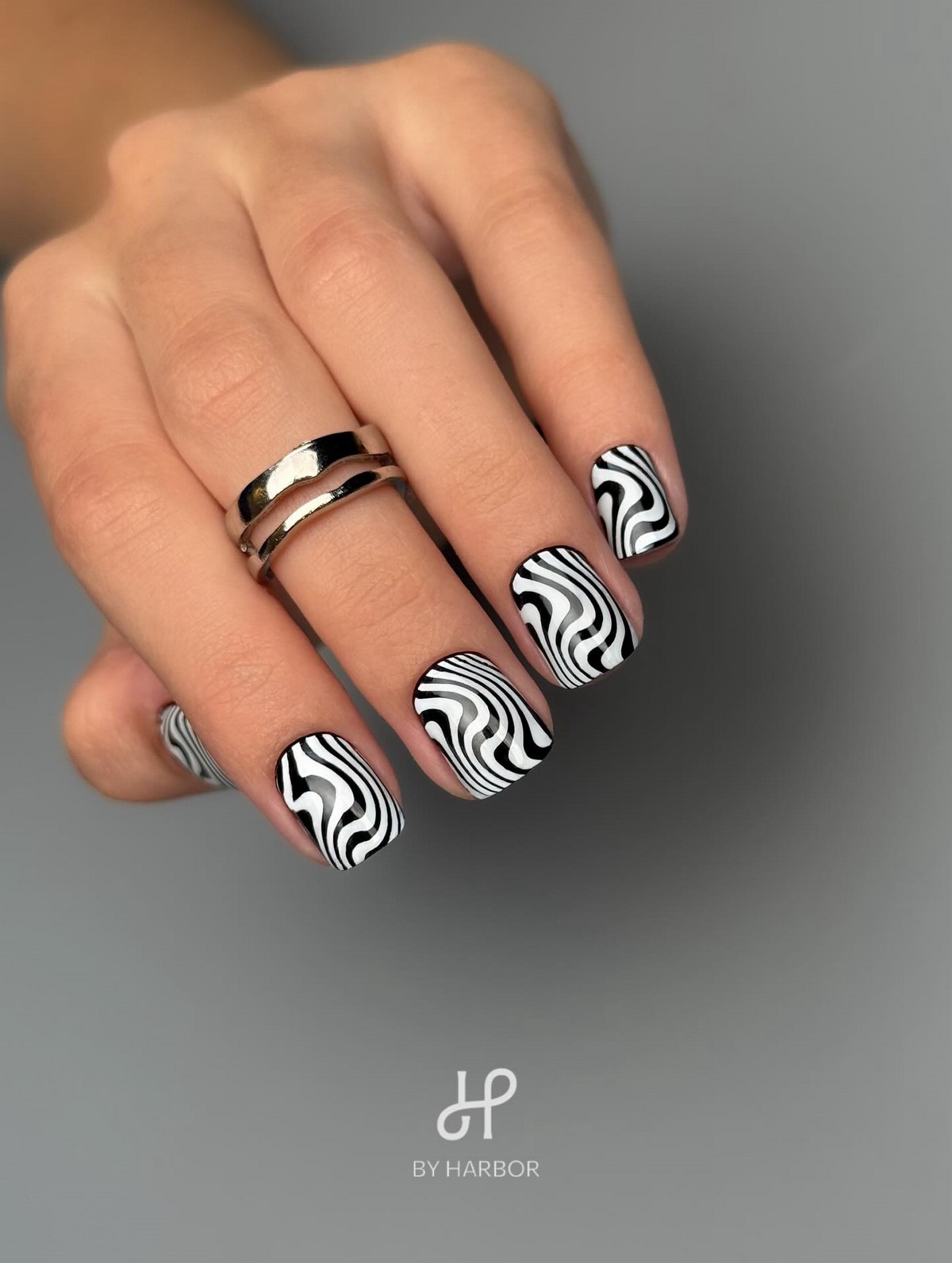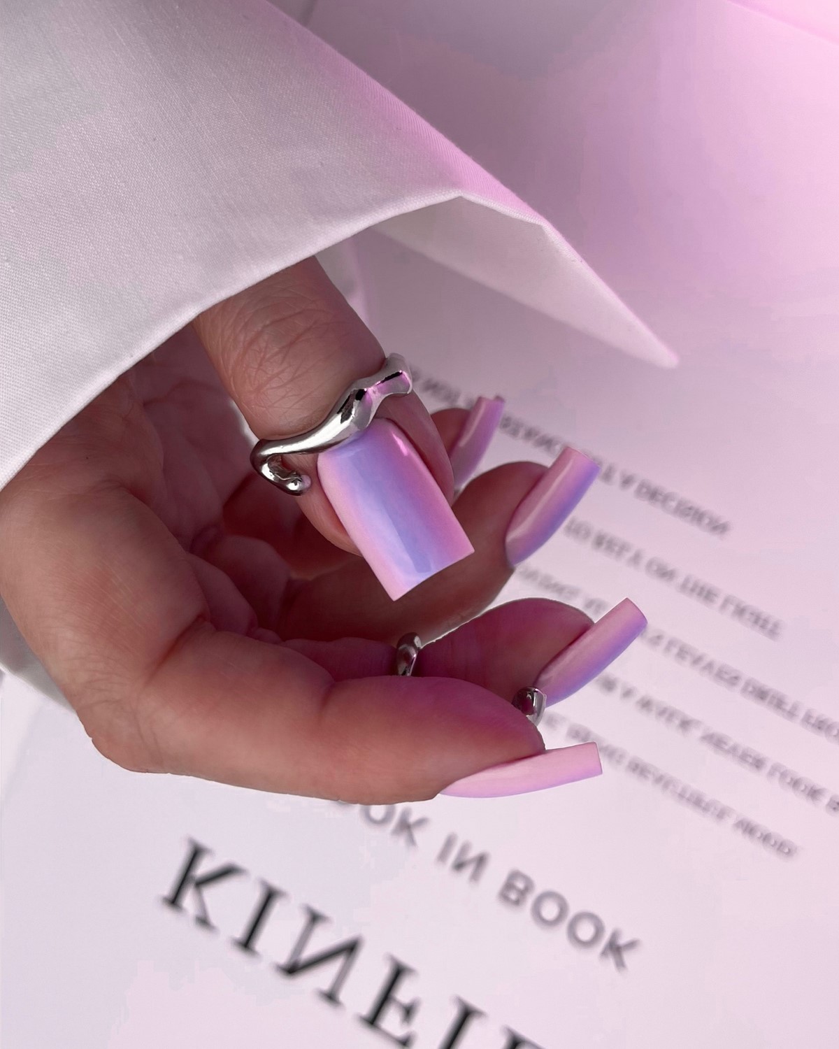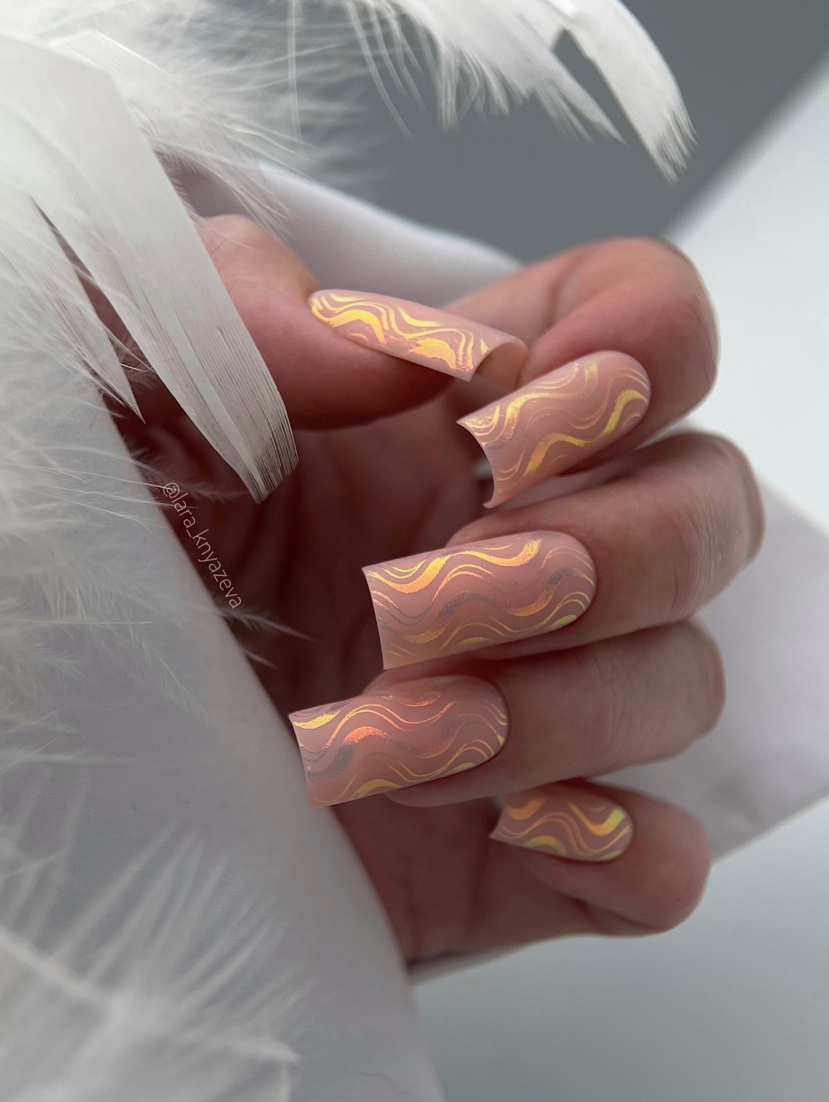 Ефект «сяючих хвиль» створює відчуття м’якого руху світла по нігтю. Цей дизайн нагадує переливи льоду або снігових кучугур, освітлених зимовим сонцем. Чудово поєднується з перловим гель-лаком, сатиновими покриттями і тонким сріблястим шиммером.