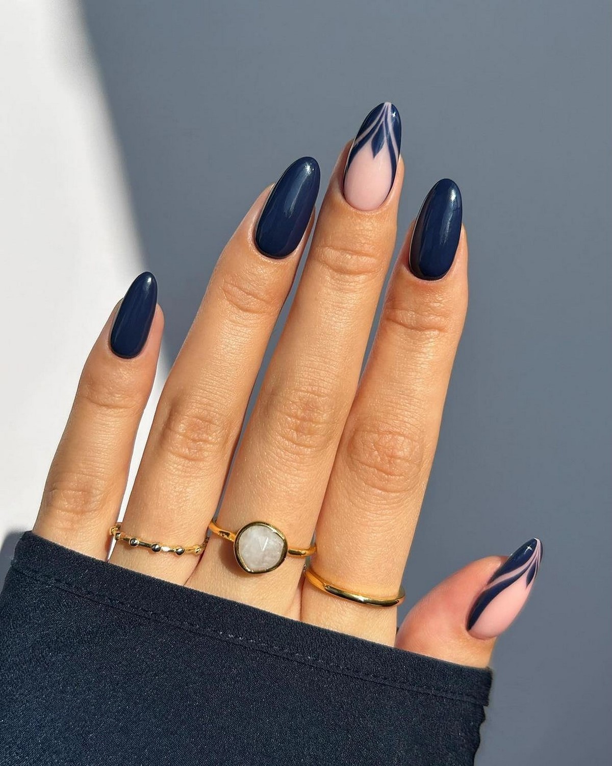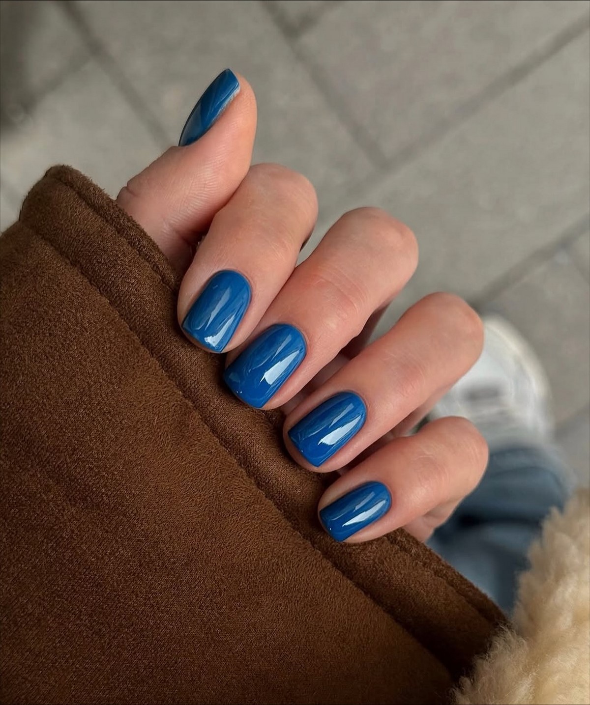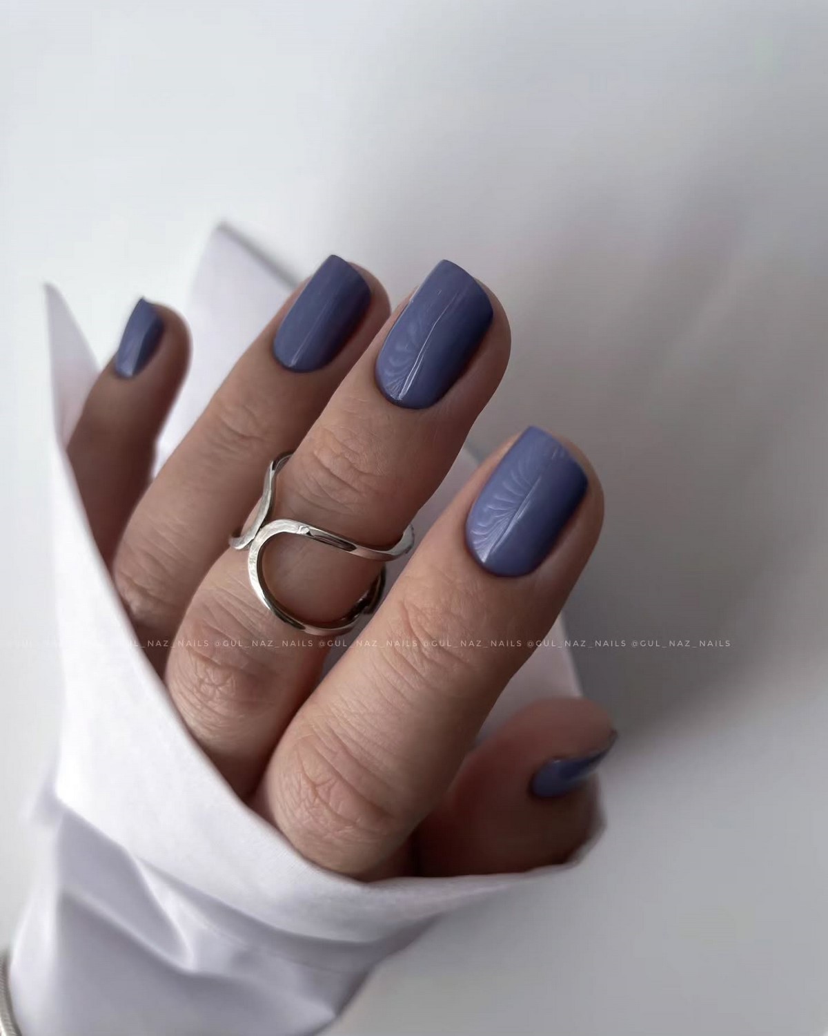 Модні варіанти — глибокий синій з ефектом «мокрого глянцю», металік, матовий ультрасиній, темна база зі сріблястим шиммером. Такий колір вигідно підкреслює форму нігтів і підходить всім відтінкам шкіри.