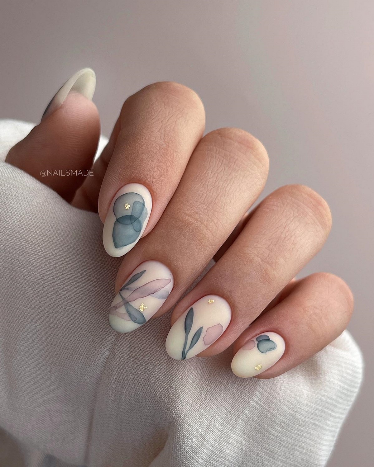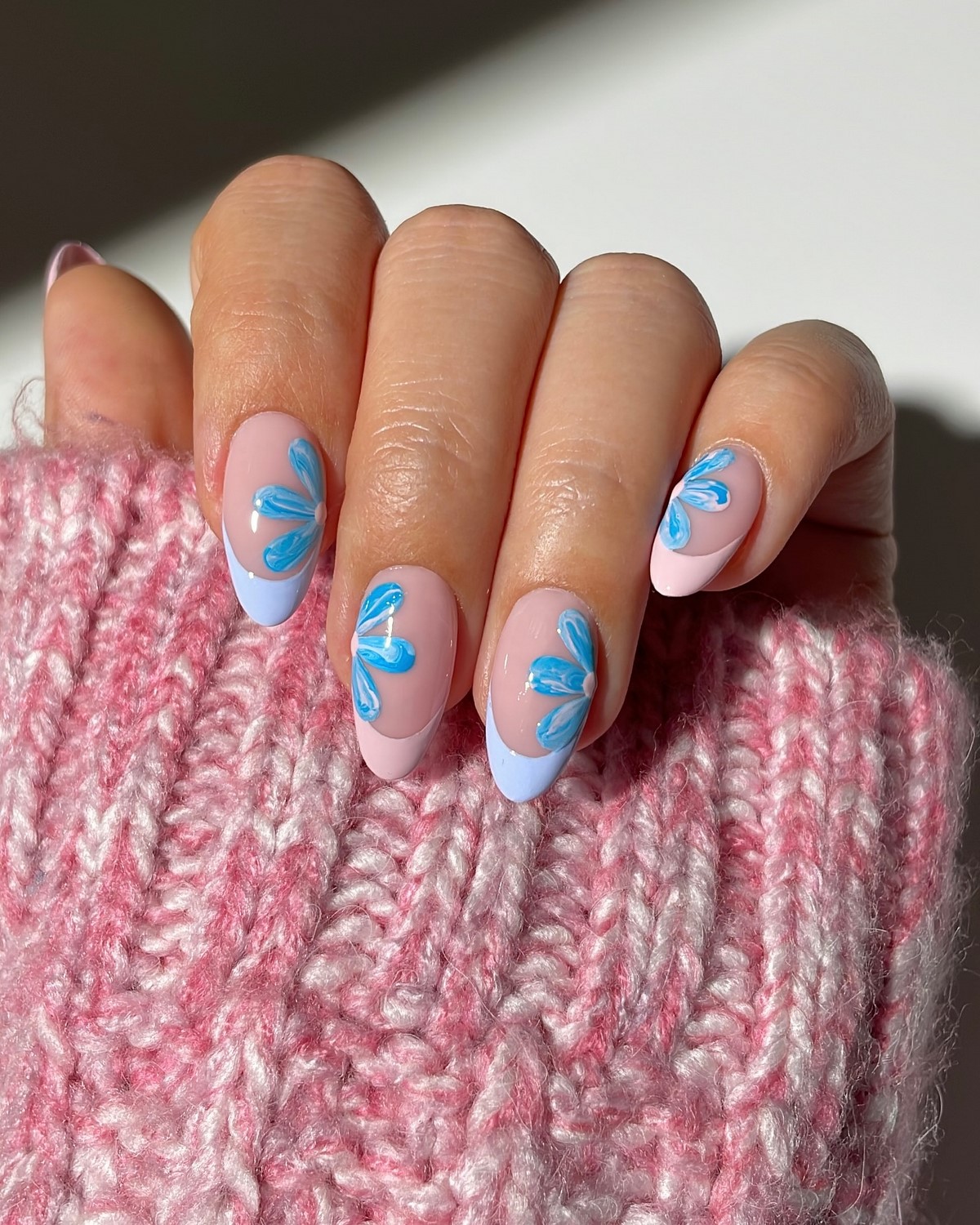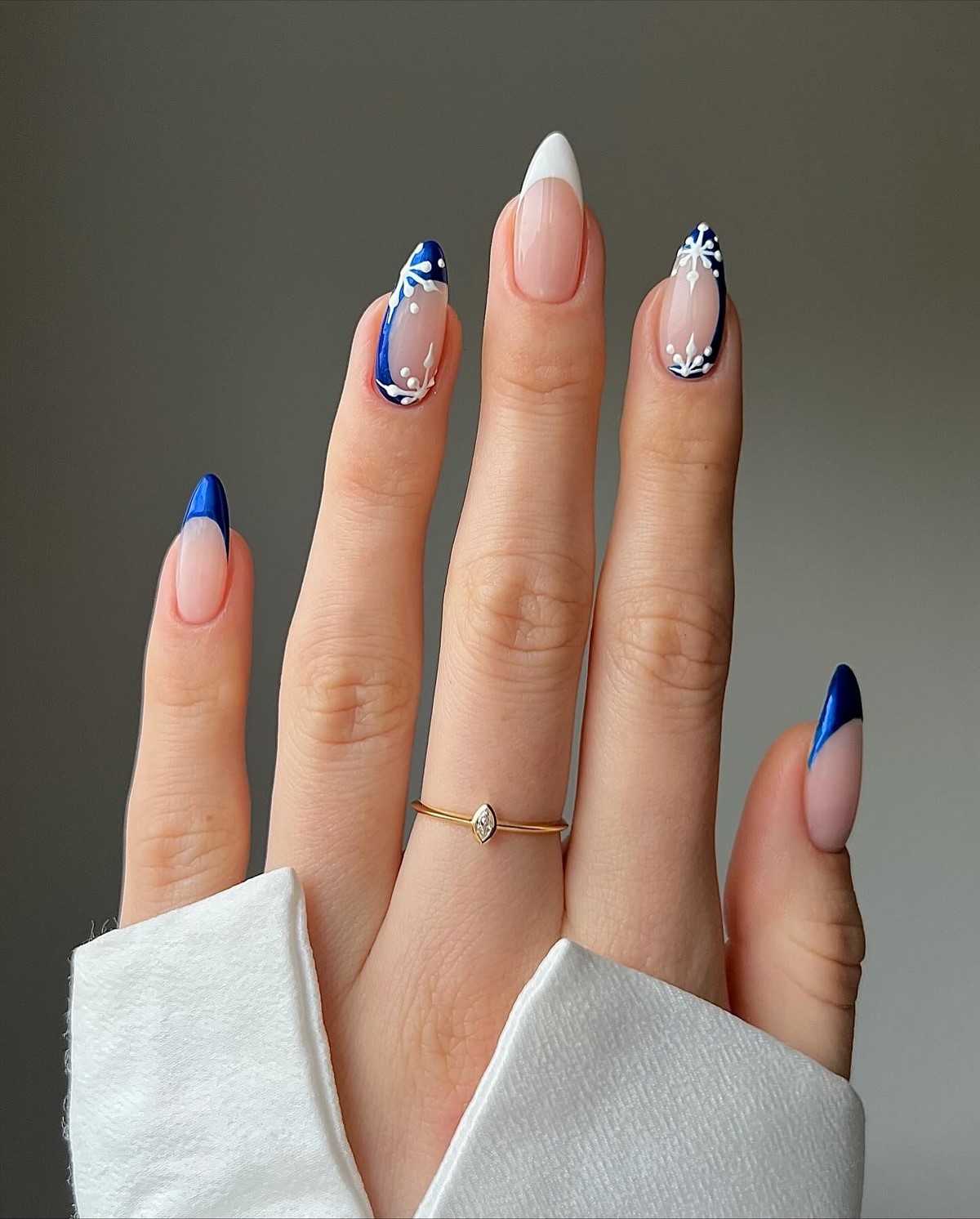 Модні варіанти — глибокий синій з ефектом «мокрого глянцю», металік, матовий ультрасиній, темна база зі сріблястим шиммером. Такий колір вигідно підкреслює форму нігтів і підходить всім відтінкам шкіри.