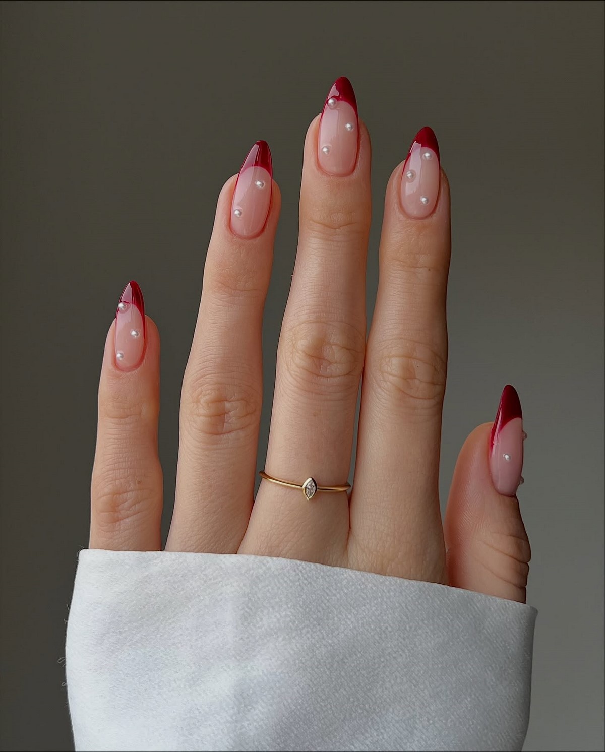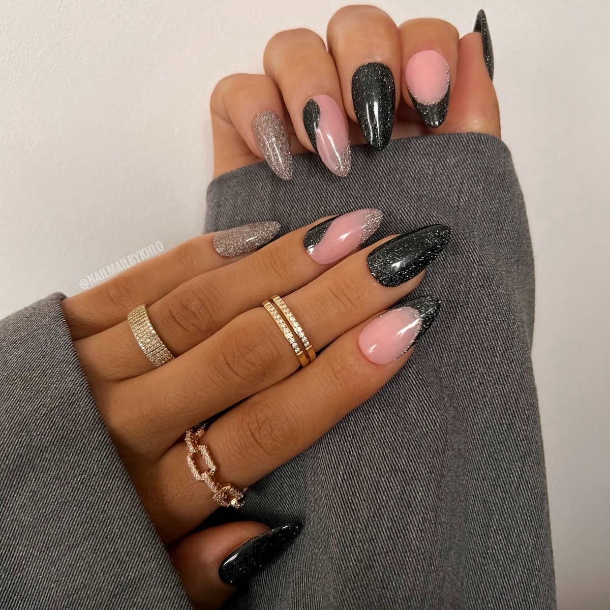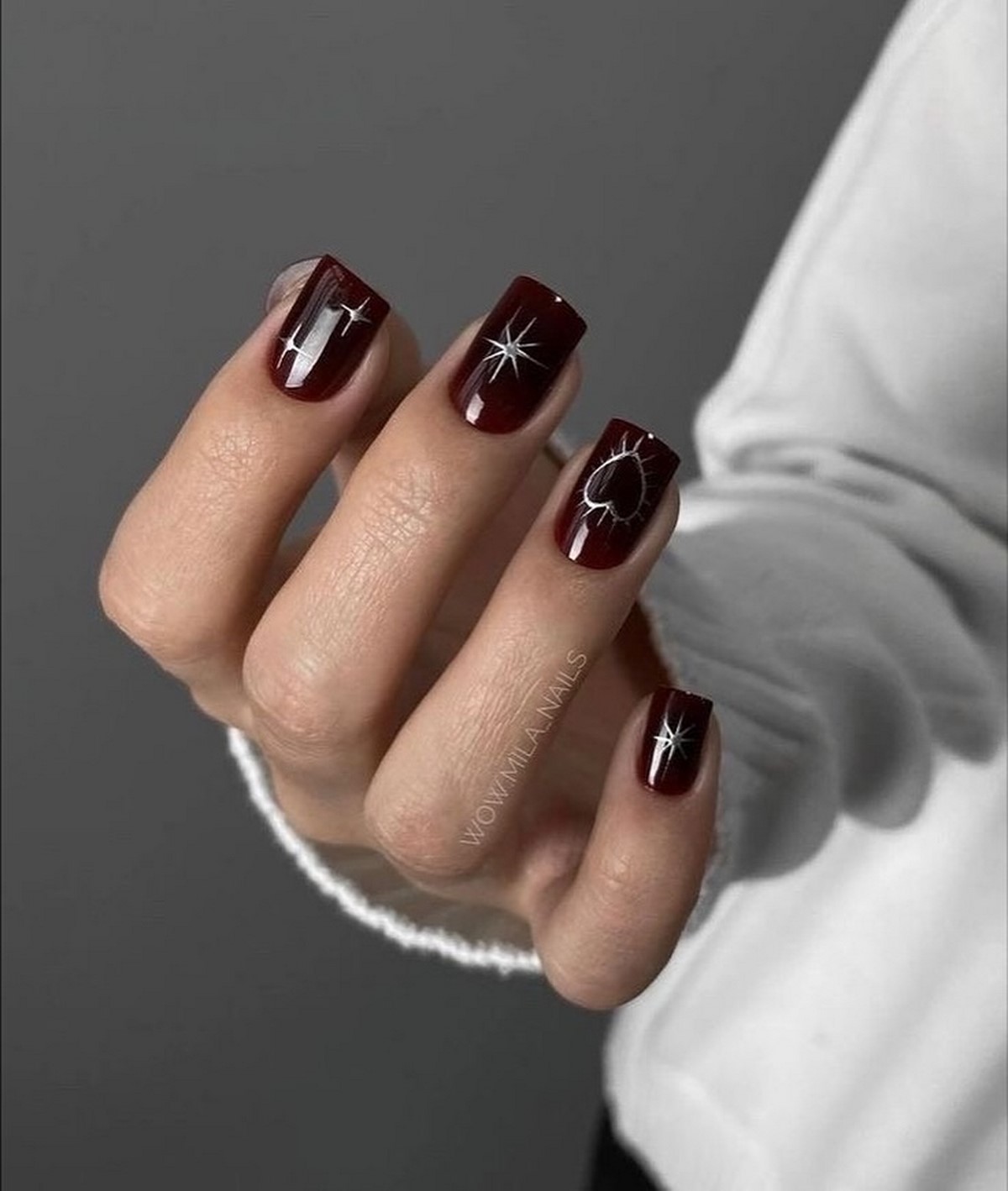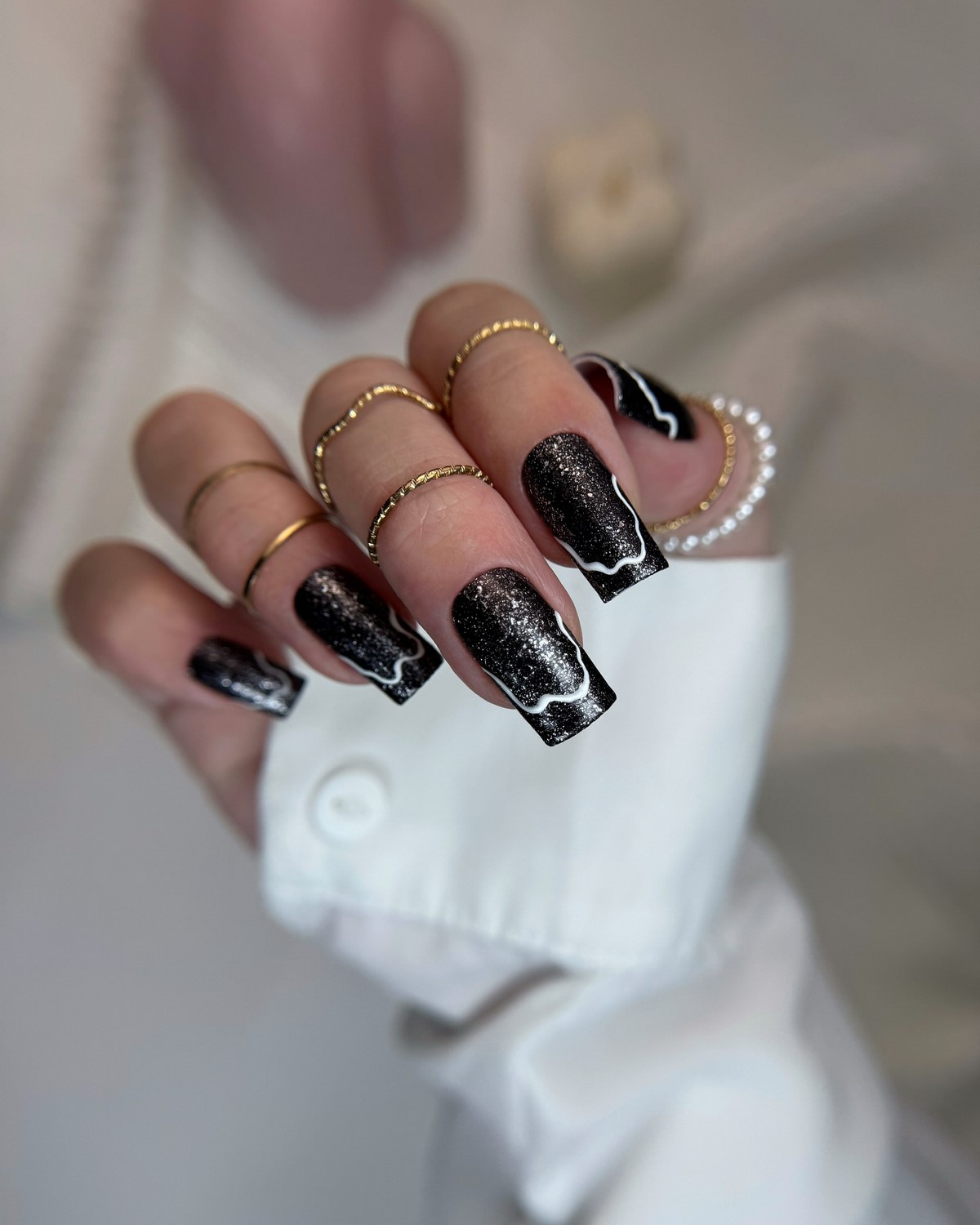 Найпопулярніші рішення — скляний блиск, сріблястий френч, глибокі темні відтінки з сяючою вуаллю і прозорі дизайни з мінімалістичними символами свята.