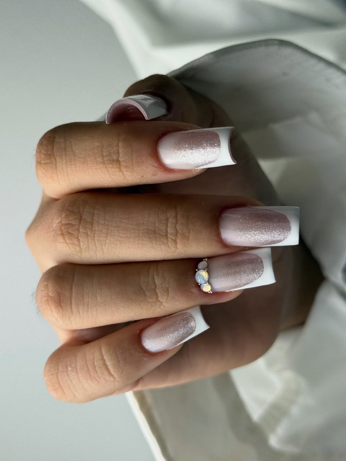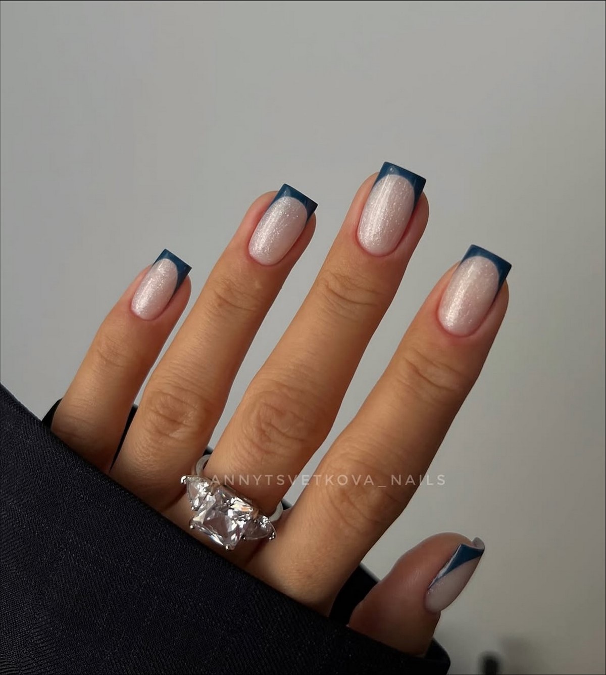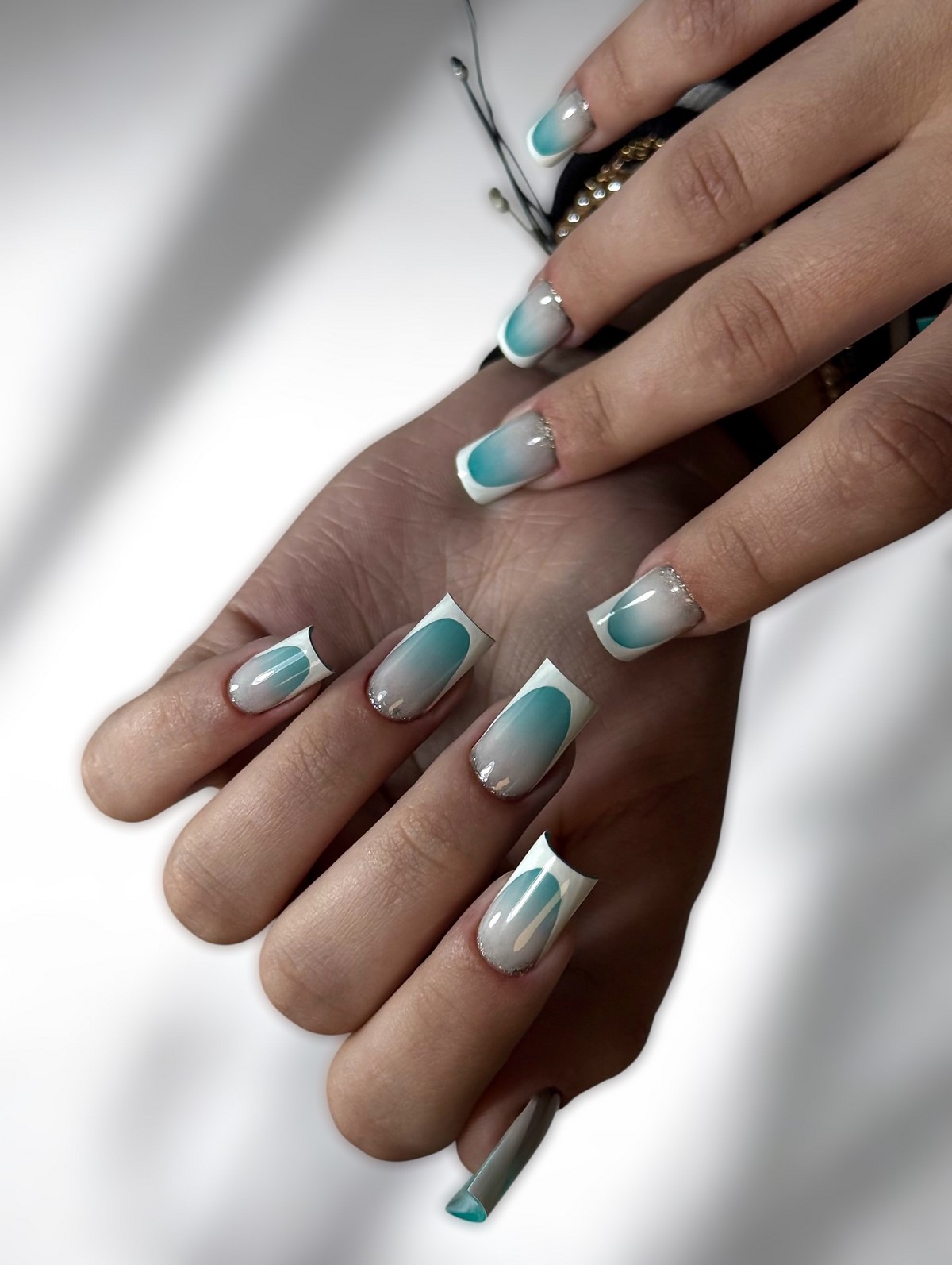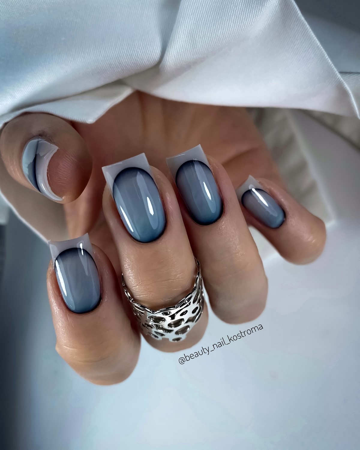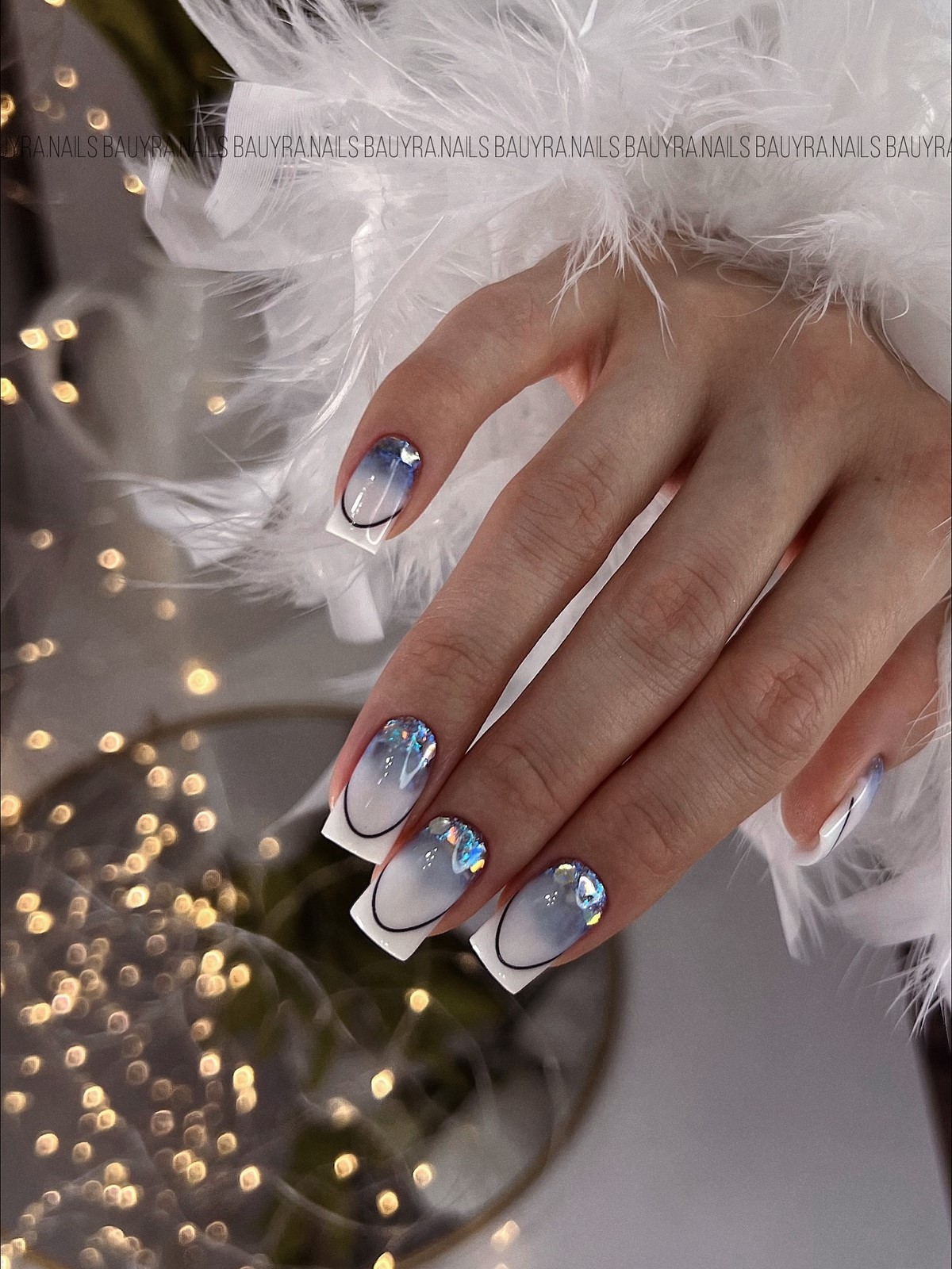 Градієнтний френч – це втілення плавності і гармонії в дизайні нігтів. Техніка передбачає м’який перехід від одного відтінку до іншого, створюючи ефект омбре на вільному краї. Зимові варіації градієнта особливо виграшно виглядають в холодній палітрі: від ніжно-блакитного до глибокого синього, від перламутрового до сріблястого, від нюдового до темно-фіолетового. Цей дизайн додає манікюру об’ємності і глибини, створюючи візуальний ефект акварельного живопису на нігтях.