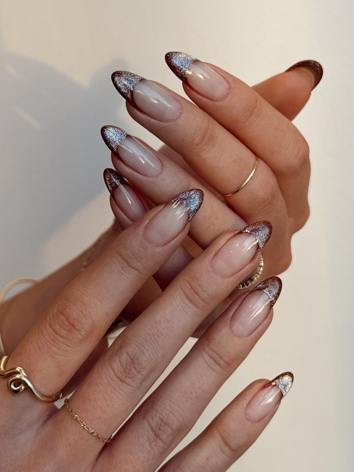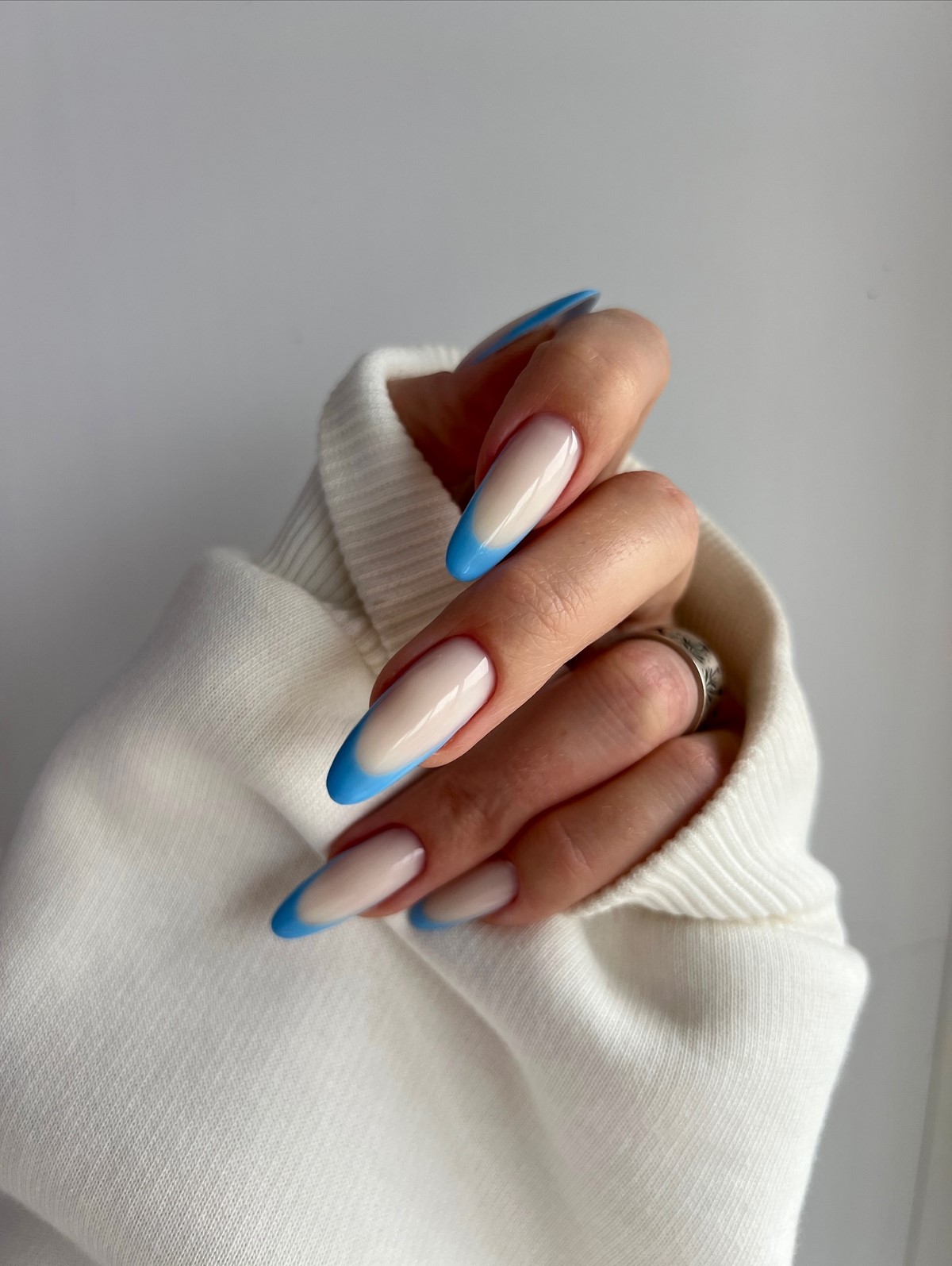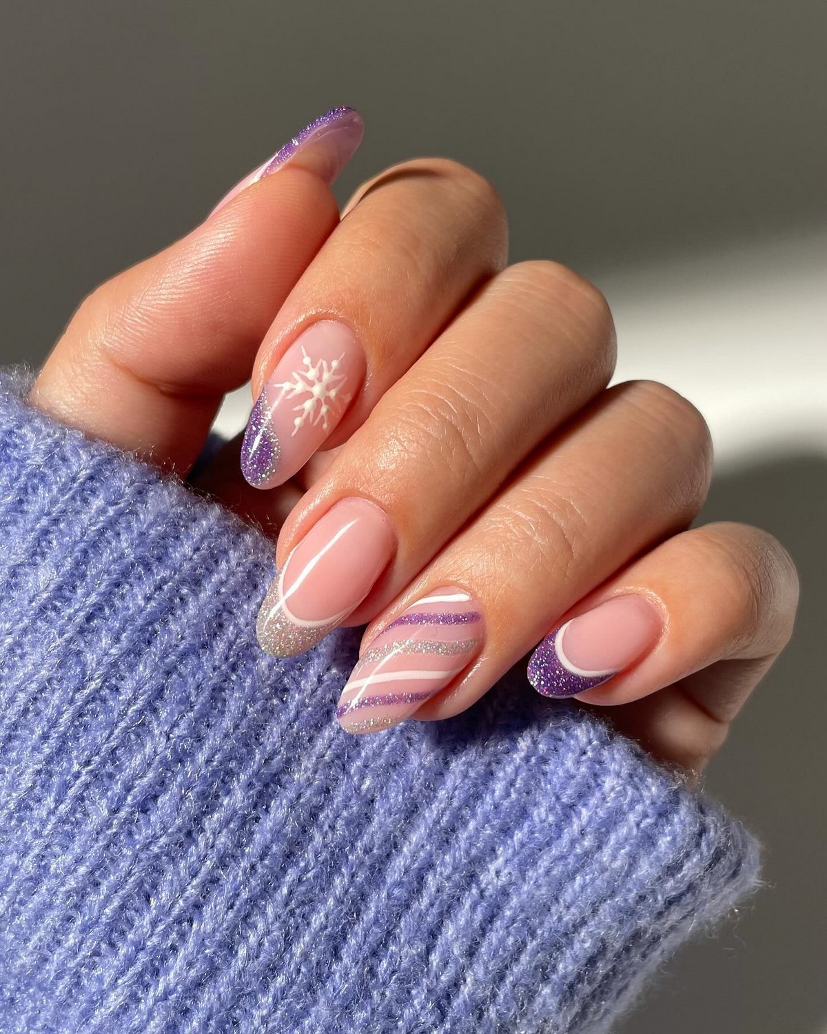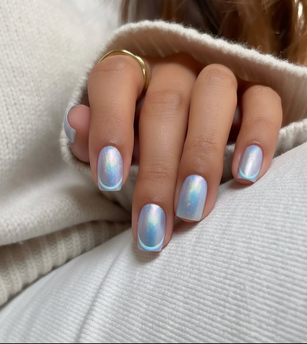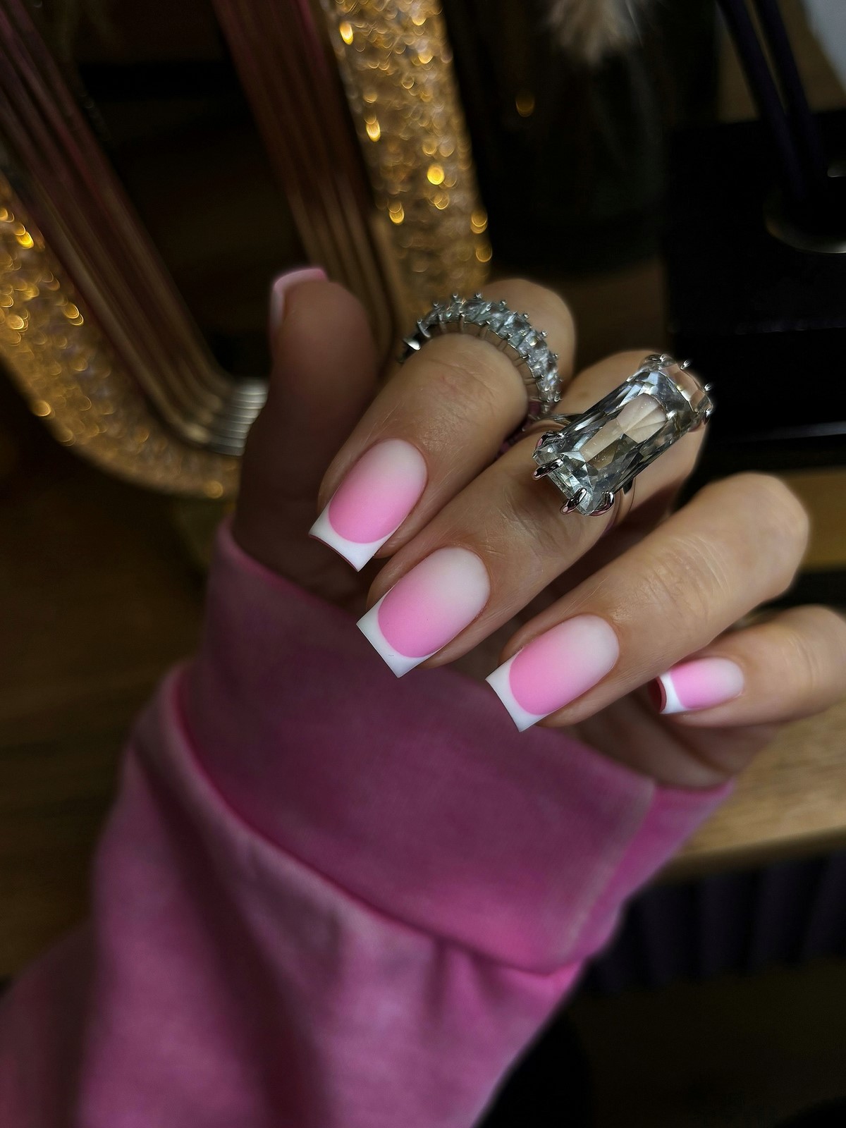 Градієнтний френч – це втілення плавності і гармонії в дизайні нігтів. Техніка передбачає м’який перехід від одного відтінку до іншого, створюючи ефект омбре на вільному краї. Зимові варіації градієнта особливо виграшно виглядають в холодній палітрі: від ніжно-блакитного до глибокого синього, від перламутрового до сріблястого, від нюдового до темно-фіолетового. Цей дизайн додає манікюру об’ємності і глибини, створюючи візуальний ефект акварельного живопису на нігтях.