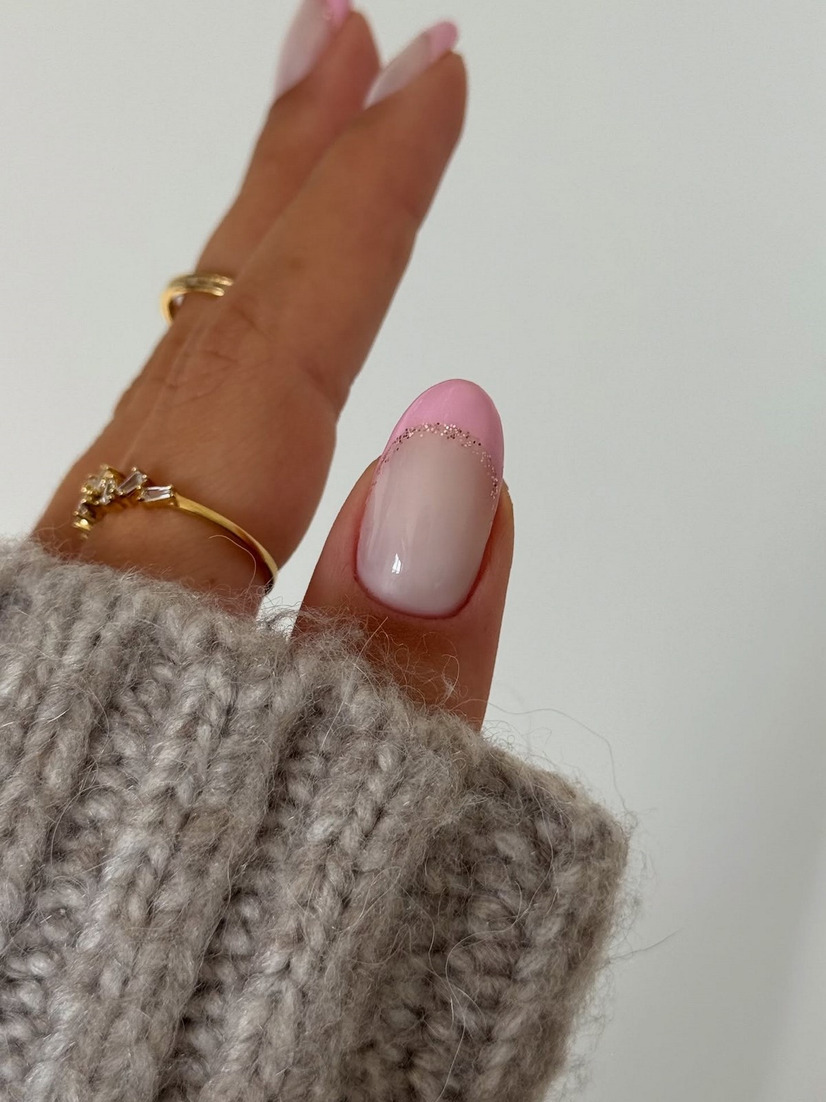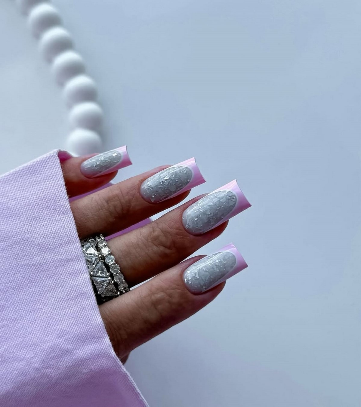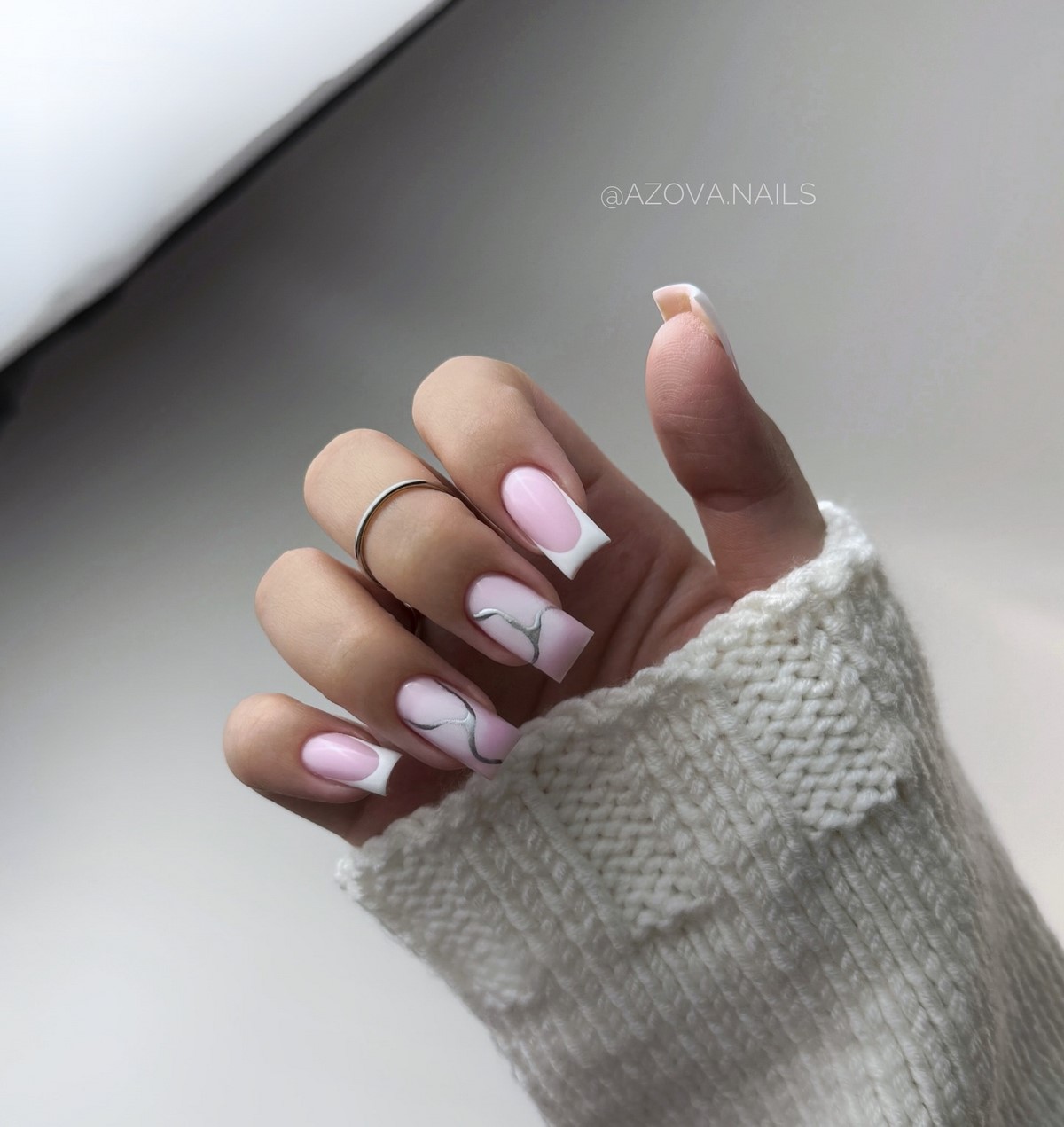Для прихильниць мінімалізму і витонченої елегантності дизайнери пропонують ніжний варіант зимового френча. Основа виконується в ніжно-рожевому або персиковому відтінку, створюючи ефект природної нігтьової пластини. Родзинка дизайну – найтонша срібляста смужка, яка делікатно відокремлює вільний край, додаючи манікюру вишуканості. Цей варіант ідеально підходить для офісного дрес-коду і повсякденного носіння, залишаючись при цьому актуальним і стильним рішенням.