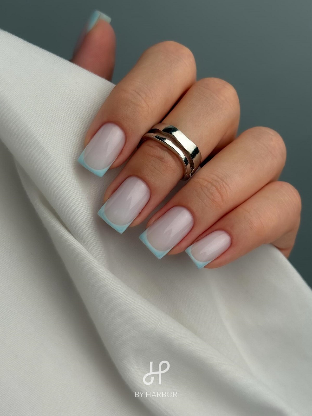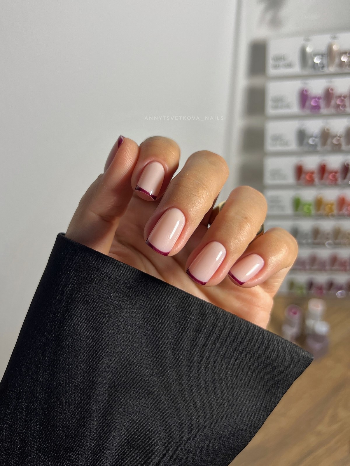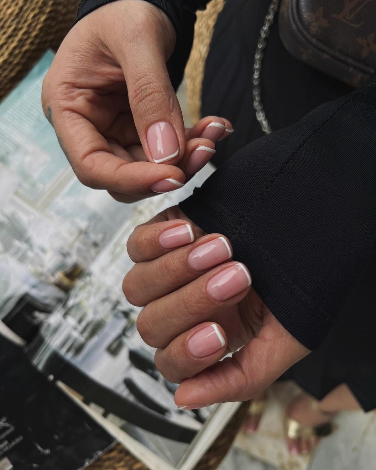 Для прихильниць мінімалізму і витонченої елегантності дизайнери пропонують ніжний варіант зимового френча. Основа виконується в ніжно-рожевому або персиковому відтінку, створюючи ефект природної нігтьової пластини. Родзинка дизайну – найтонша срібляста смужка, яка делікатно відокремлює вільний край, додаючи манікюру вишуканості. Цей варіант ідеально підходить для офісного дрес-коду і повсякденного носіння, залишаючись при цьому актуальним і стильним рішенням.