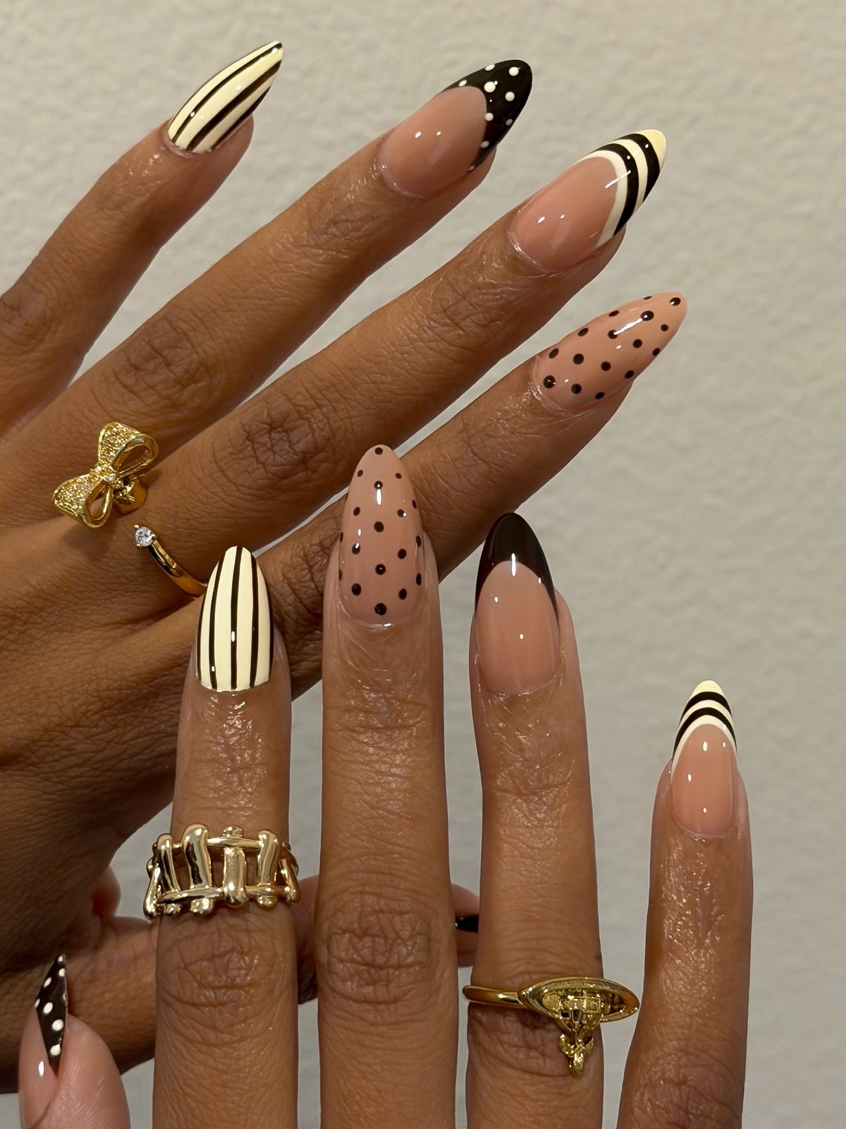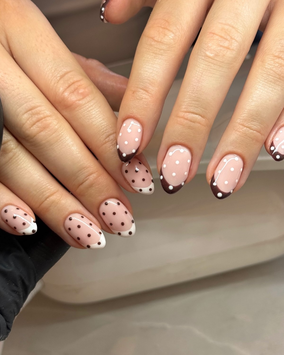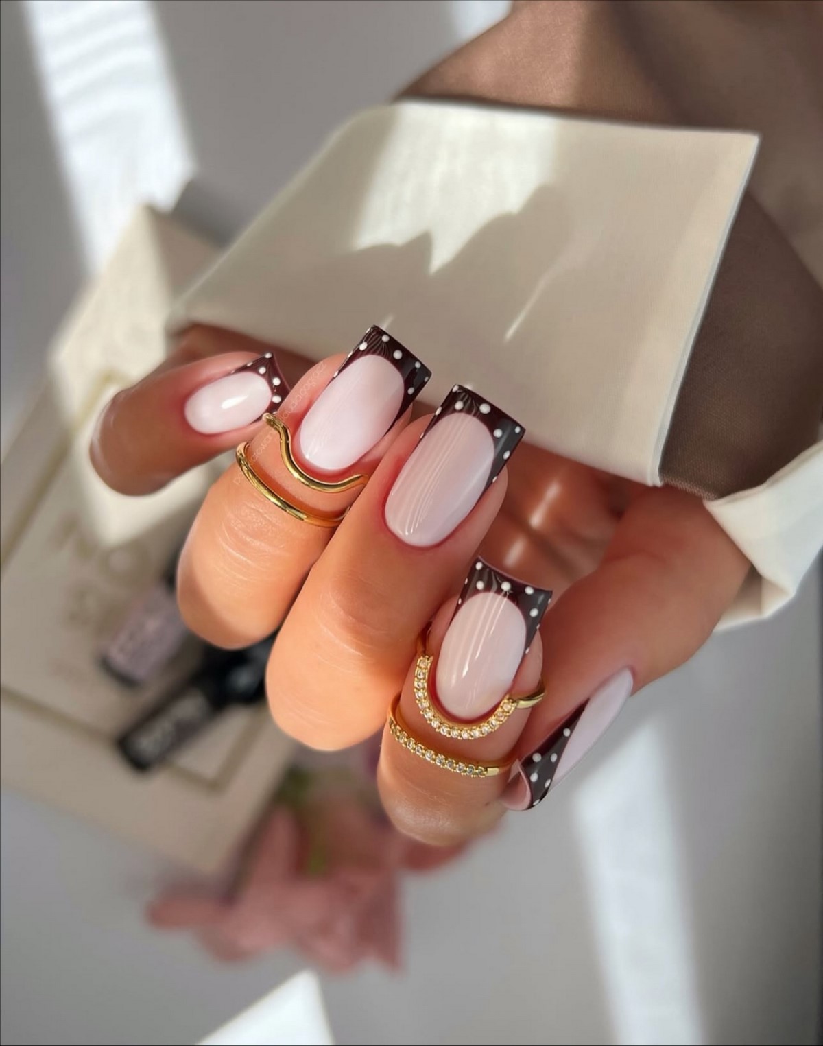 Грайливий горошок повертається у світ nail-арту в новому прочитанні. Зимова версія цього дизайну передбачає темний, насичений вільний край – глибокий синій, бургунді або чорний – прикрашений акуратними світлими крапками. Контраст між темною основою і яскравими горошинами створює графічний, сучасний образ. Такий френч прекрасно поєднується із зимовими нарядами в стилі ретро і додає образу французького шику.