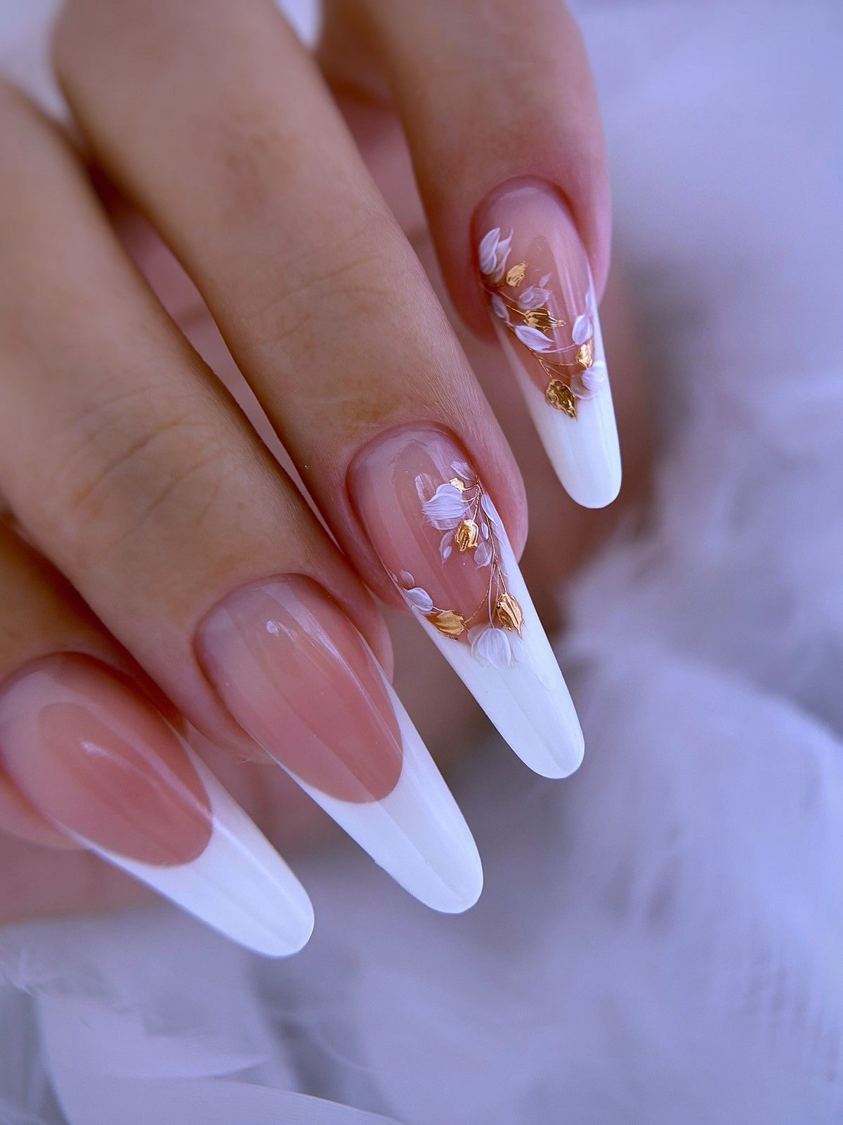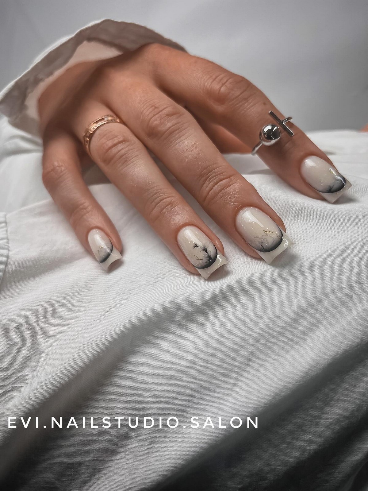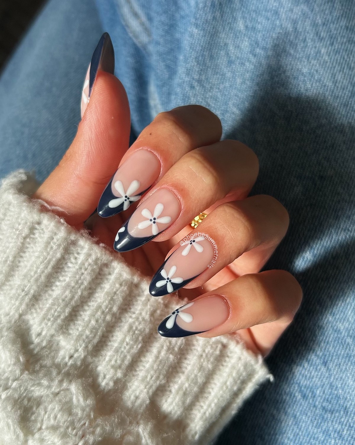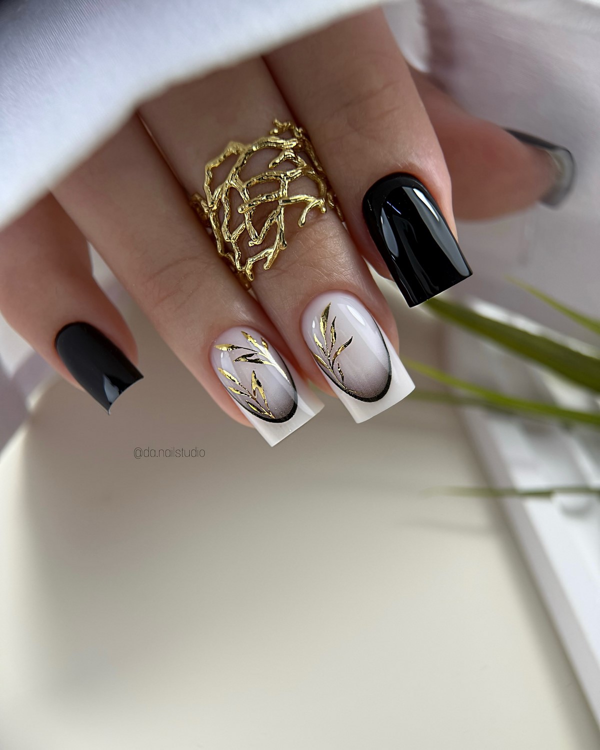 Флористичні мотиви не виходять з моди навіть взимку, просто трансформуються в більш стримані варіанти. Темний вільний край – чорний, темно-синій або смарагдовий – стає фоном для мініатюрних білих квітів, намальованих тонким пензлем. Це можуть бути абстрактні квіткові візерунки, що нагадують морозні візерунки на вікнах, або детально промальовані бутони. Такий дизайн поєднує в собі зимову строгість і ніжну жіночність, створюючи унікальний баланс.