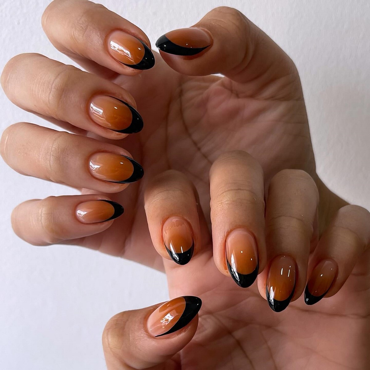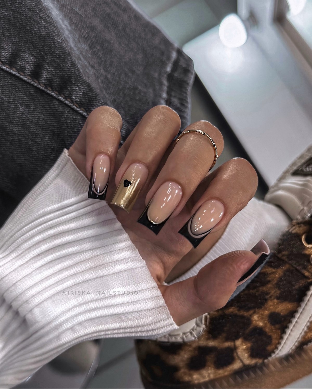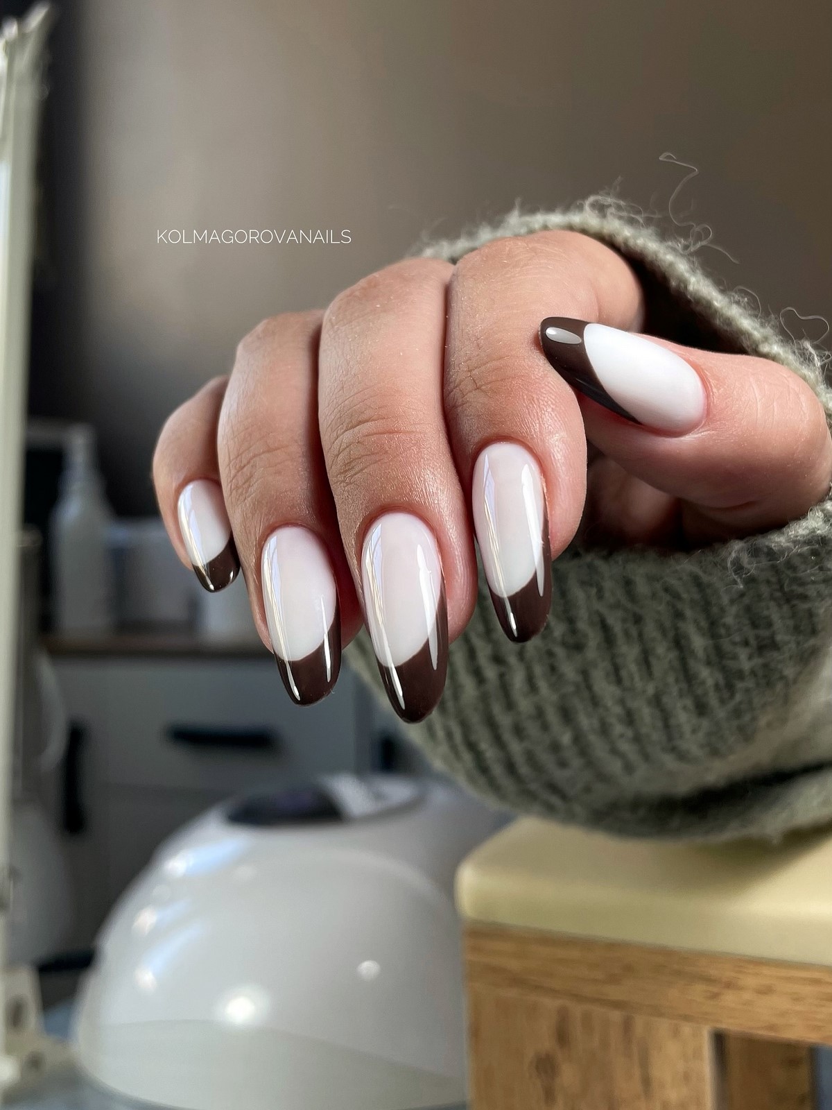 Інверсія класичного френча – один з головних трендів сезону. Замість світлої основи і білого кінчика тут використовується темна, насичена база і яскравий контрастний вільний край. Це може бути чорна основа з білосніжним краєм, темно-синя з золотим, смарагдова з перловим. Такий підхід створює драматичний, незабутній образ, який ідеально вписується в зимову естетику. Контраст додає манікюру графічності і робить руки центром тяжіння поглядів.