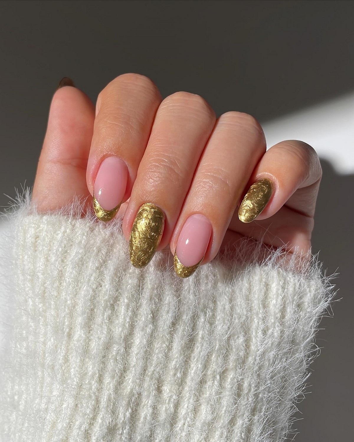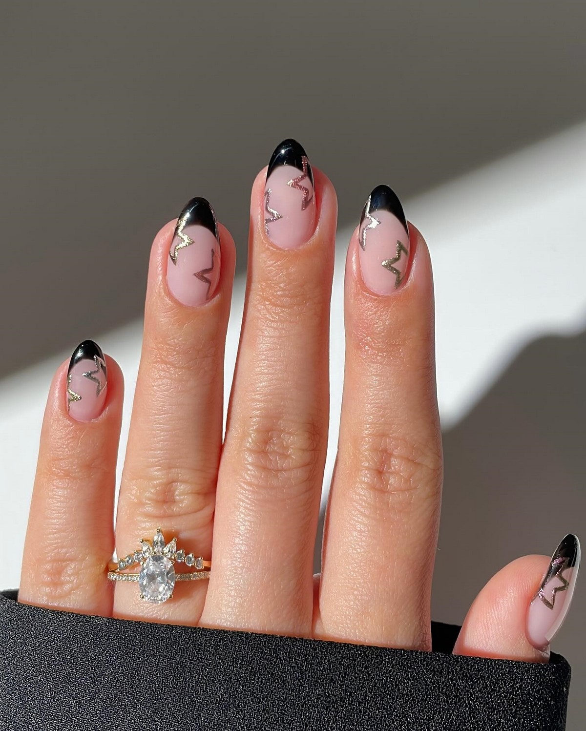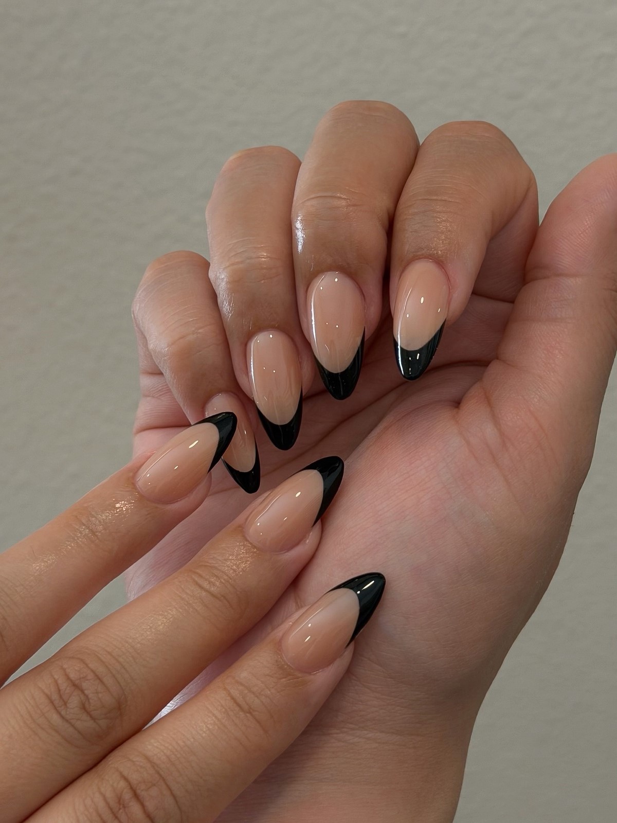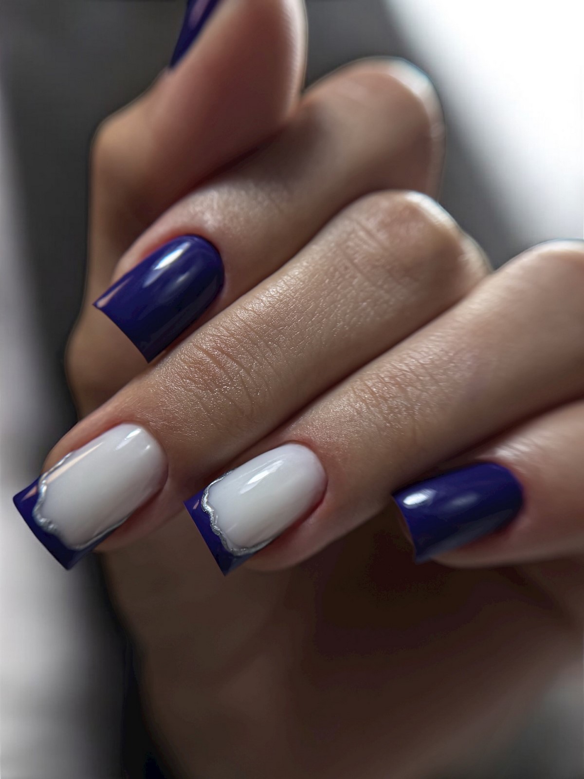 Інверсія класичного френча – один з головних трендів сезону. Замість світлої основи і білого кінчика тут використовується темна, насичена база і яскравий контрастний вільний край. Це може бути чорна основа з білосніжним краєм, темно-синя з золотим, смарагдова з перловим. Такий підхід створює драматичний, незабутній образ, який ідеально вписується в зимову естетику. Контраст додає манікюру графічності і робить руки центром тяжіння поглядів.