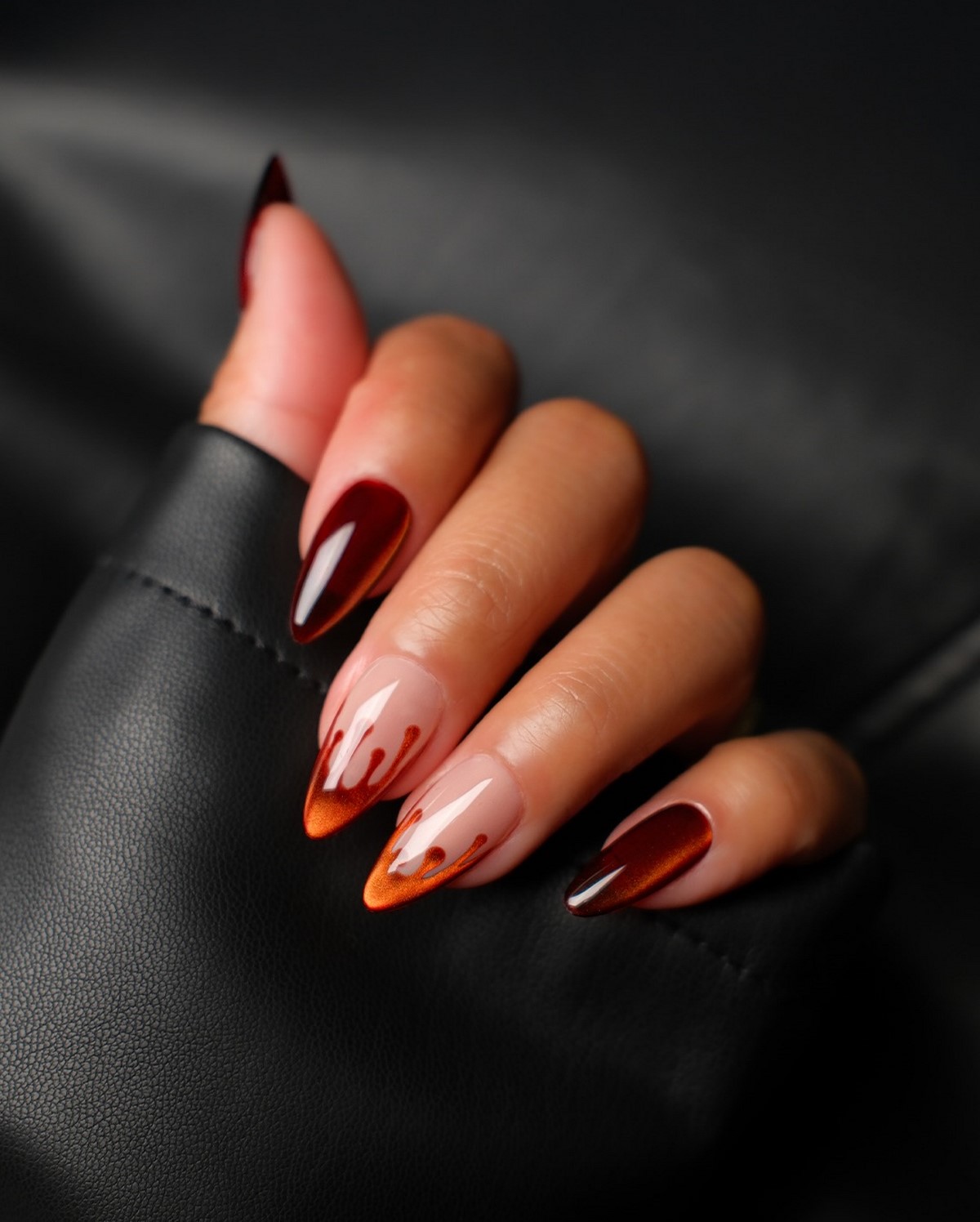 Ефект «котяче око» перетворює звичайний френч на справжній витвір мистецтва з магнетичним сяйвом. Спеціальний магнітний гель-лак створює на вільному краї переливчасту смугу світла, що нагадує відблиск на дорогоцінному камені. Цей дизайн ідеально підходить для вечірніх виходів і святкових заходів, так як нігті буквально світяться при будь-якому освітленні. Особливо ефектно «котяче око» виглядає в смарагдових, сапфірових і аметистових відтінках, які прекрасно доповнюють зимовий гардероб.