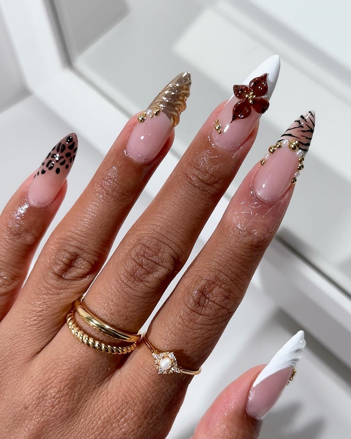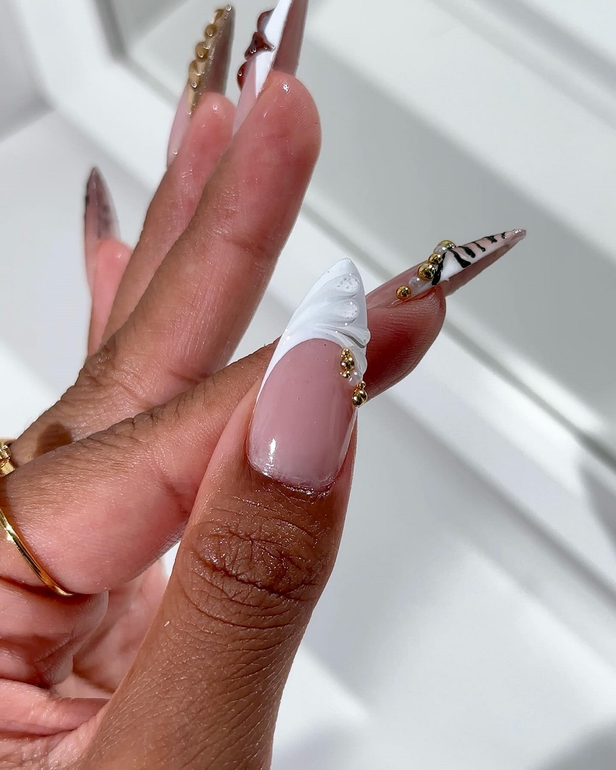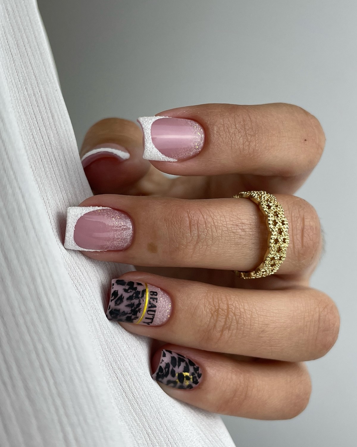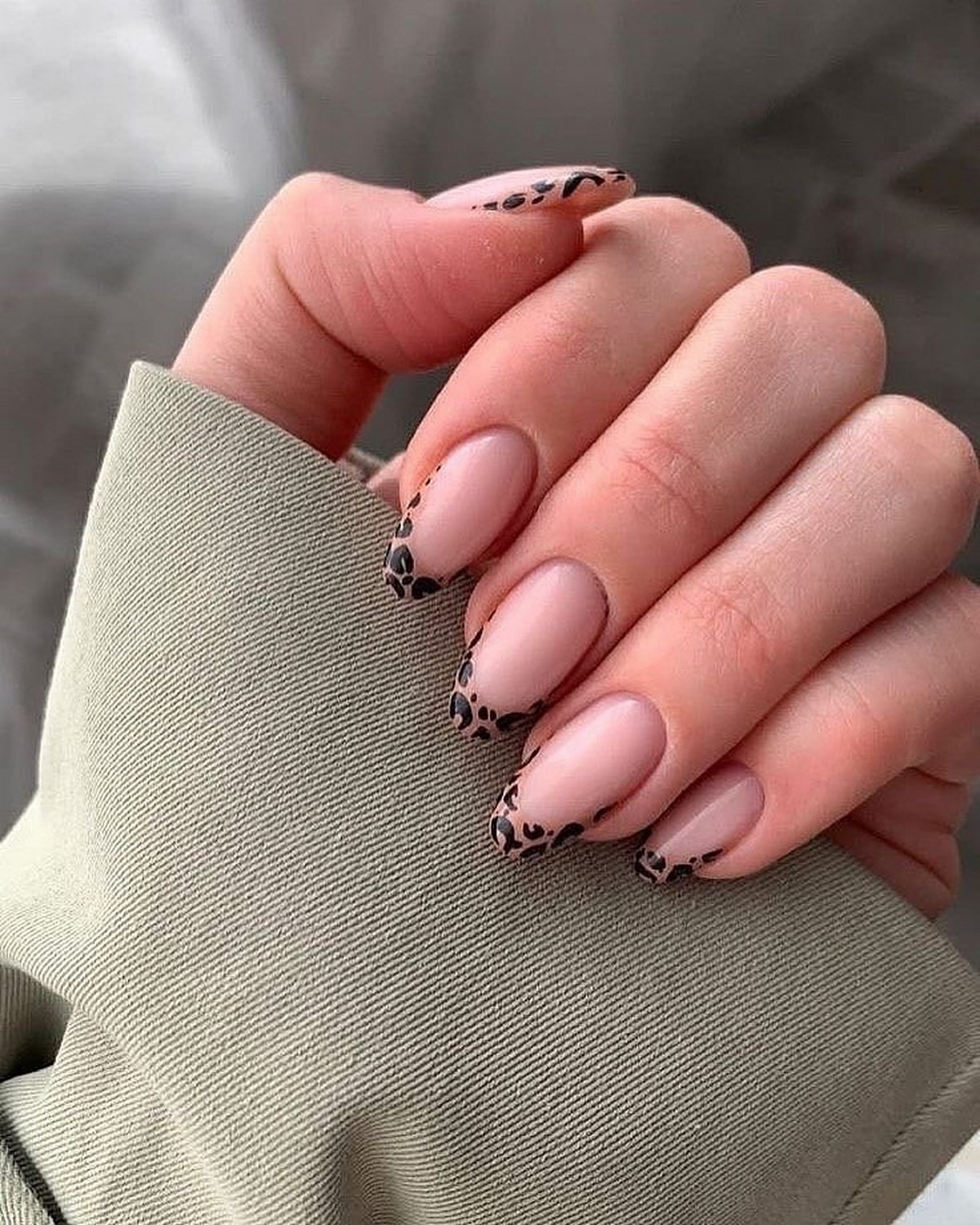 Анімалістичні мотиви продовжують панувати у світі моди, і nail-індустрія не залишилася осторонь цього тренду. Особливість зимового френча з анімал-принтами полягає в тому, що кожен ніготь може бути оформлений унікальним візерунком – на одному пальці леопардовий принт, на іншому зебра, на третьому зміїна шкіра. Така різноманітність створює динамічний, грайливий образ, який точно не залишиться непоміченим. Вільний край при цьому виконується в класичній техніці, а ось основа нігтя стає полотном для диких орнаментів.