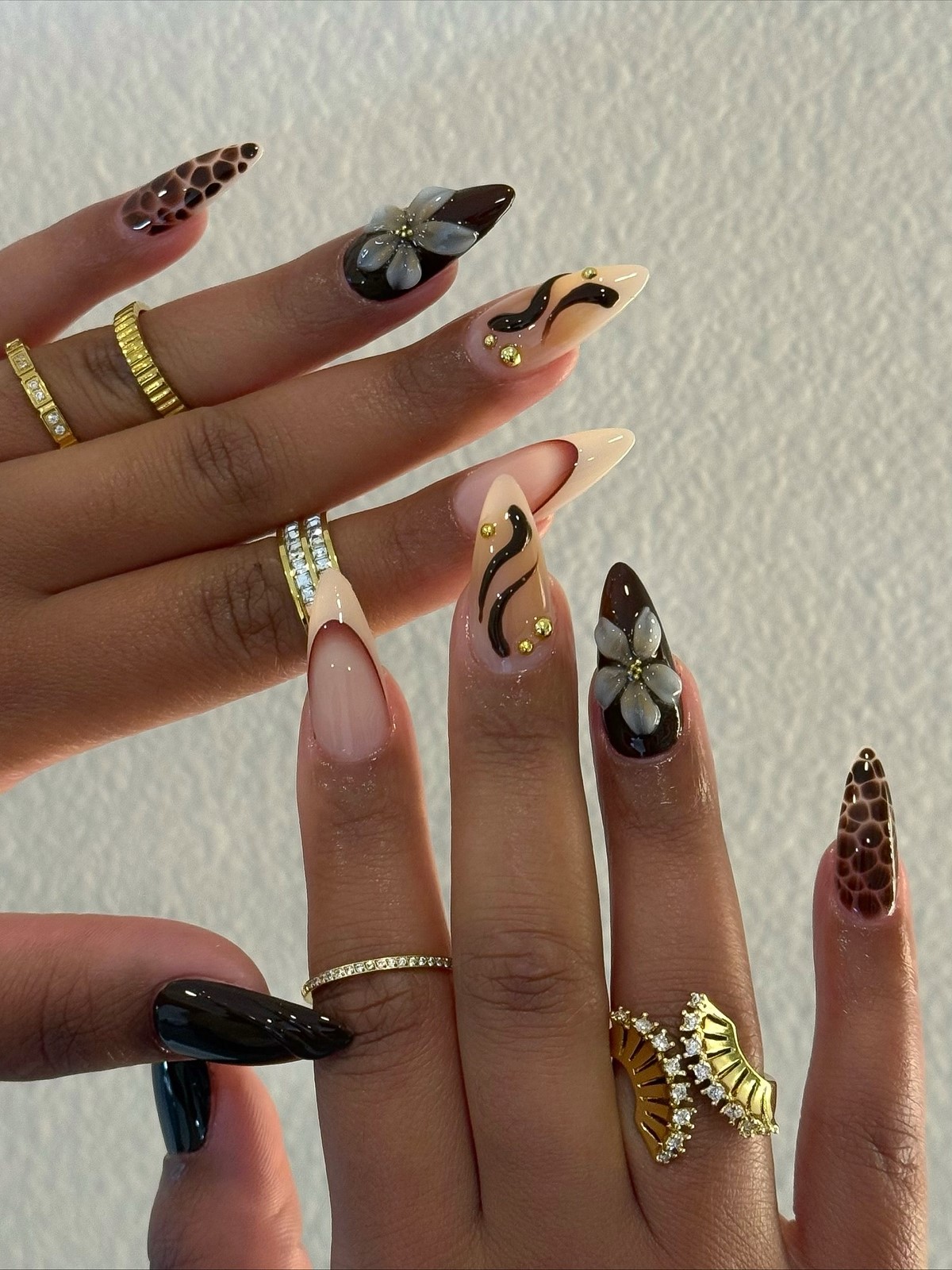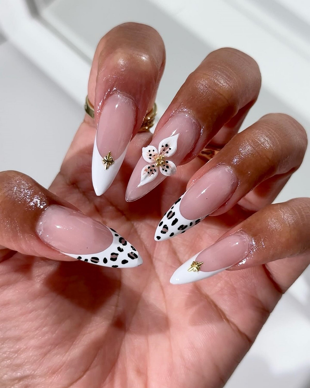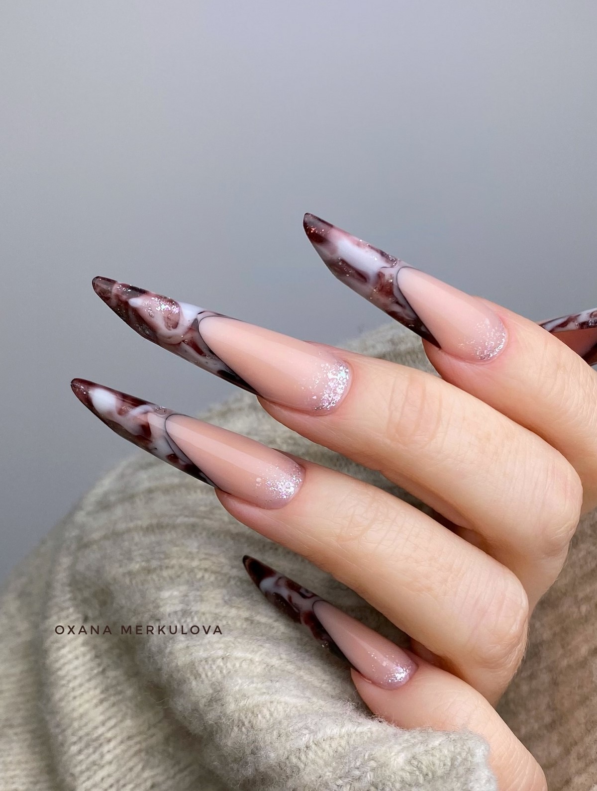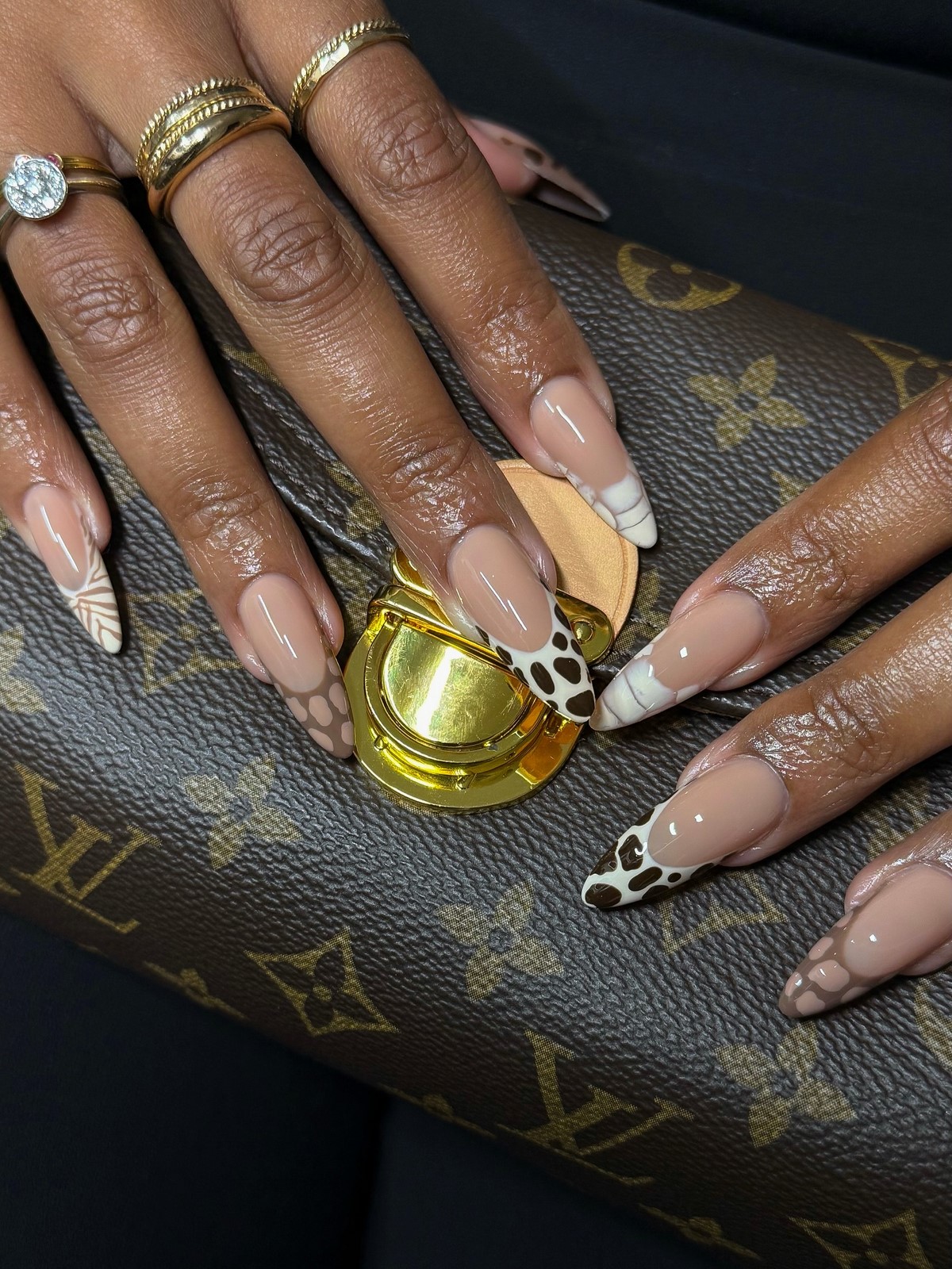 Анімалістичні мотиви продовжують панувати у світі моди, і nail-індустрія не залишилася осторонь цього тренду. Особливість зимового френча з анімал-принтами полягає в тому, що кожен ніготь може бути оформлений унікальним візерунком – на одному пальці леопардовий принт, на іншому зебра, на третьому зміїна шкіра. Така різноманітність створює динамічний, грайливий образ, який точно не залишиться непоміченим. Вільний край при цьому виконується в класичній техніці, а ось основа нігтя стає полотном для диких орнаментів.
