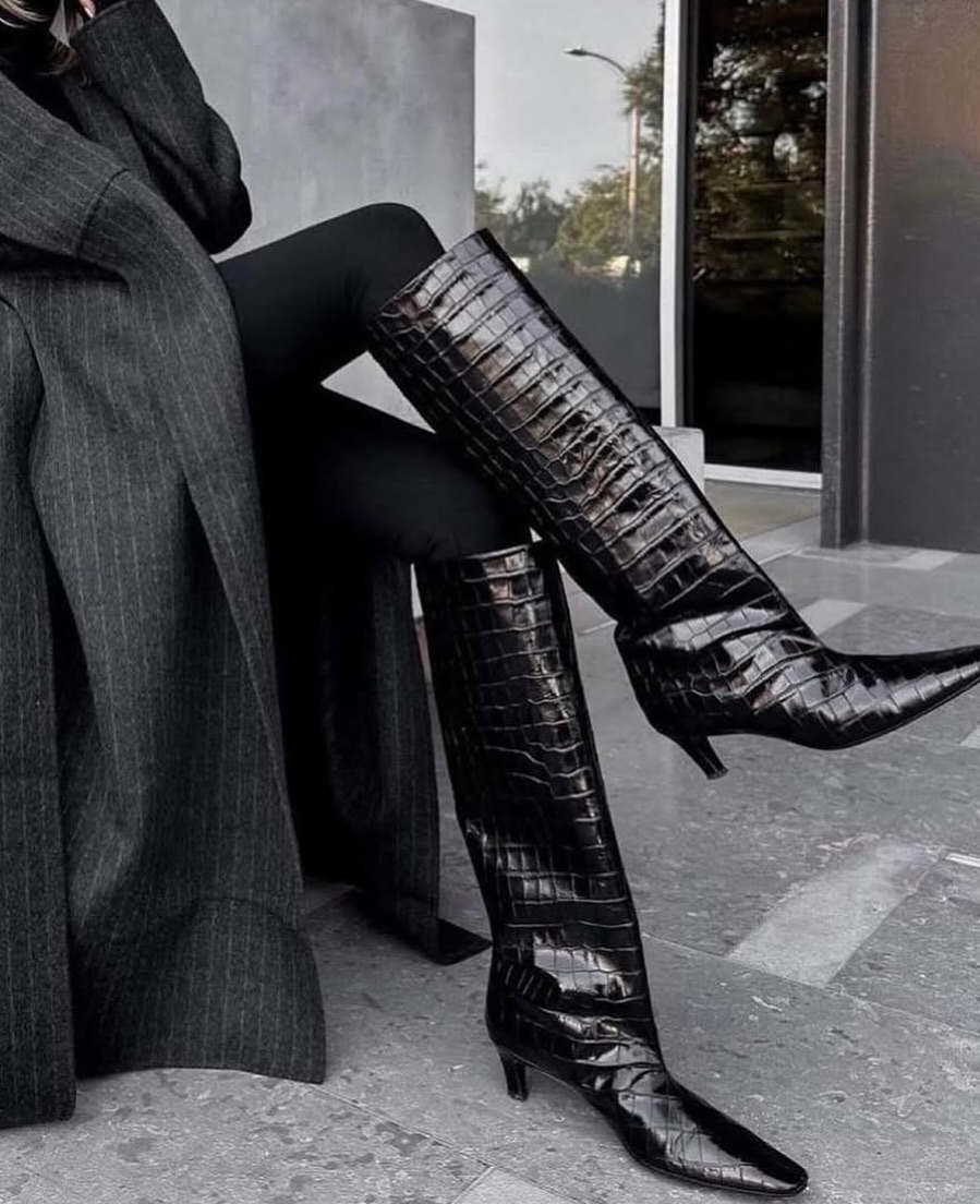 Ботфорти на підборах тріумфально повертаються в модні гардероби, пропонуючи ефектне поєднання зухвалості та жіночності. Моделі вище коліна на шпильці або стійкому каблуці візуально подовжують силует і стають центром будь-якого образу. Сучасні інтерпретації відрізняються різноманітністю матеріалів — від лакованої шкіри до матової замші, що дозволяє створювати образи різного ступеня формальності.