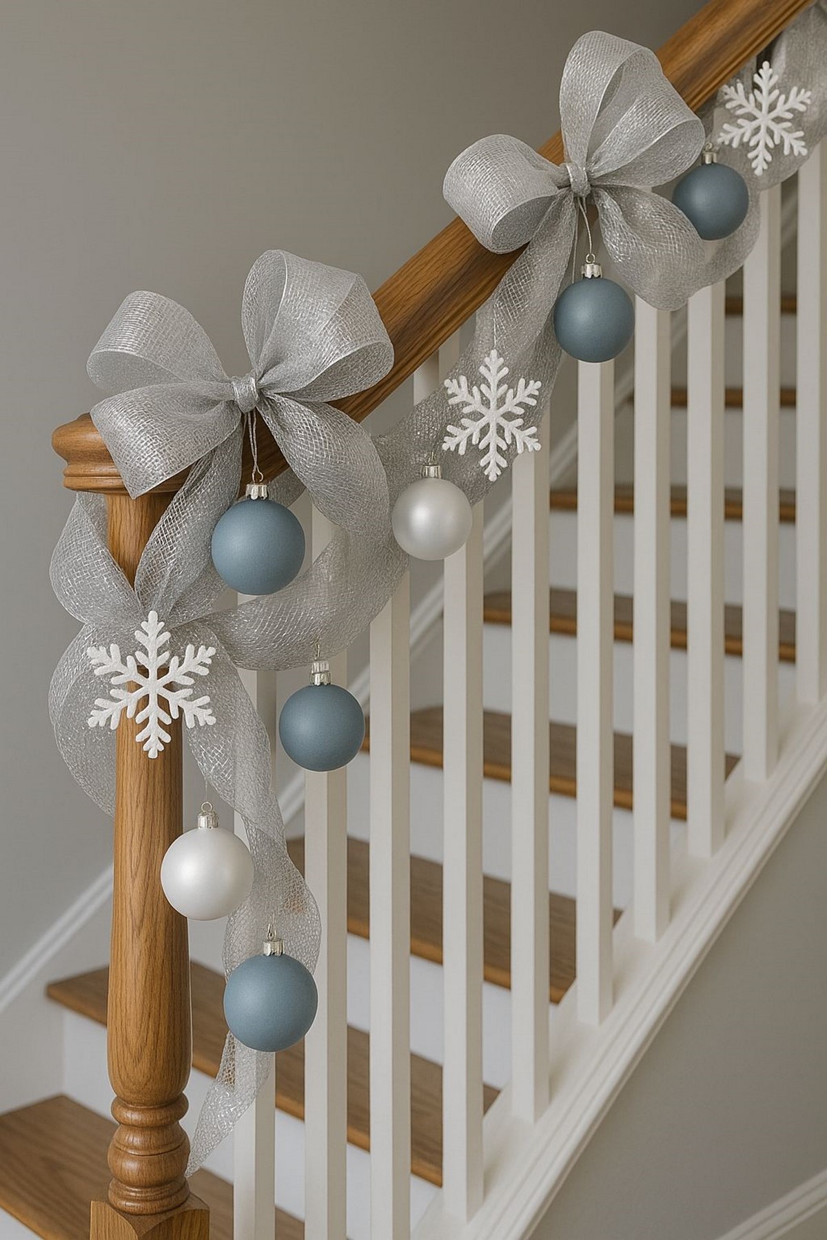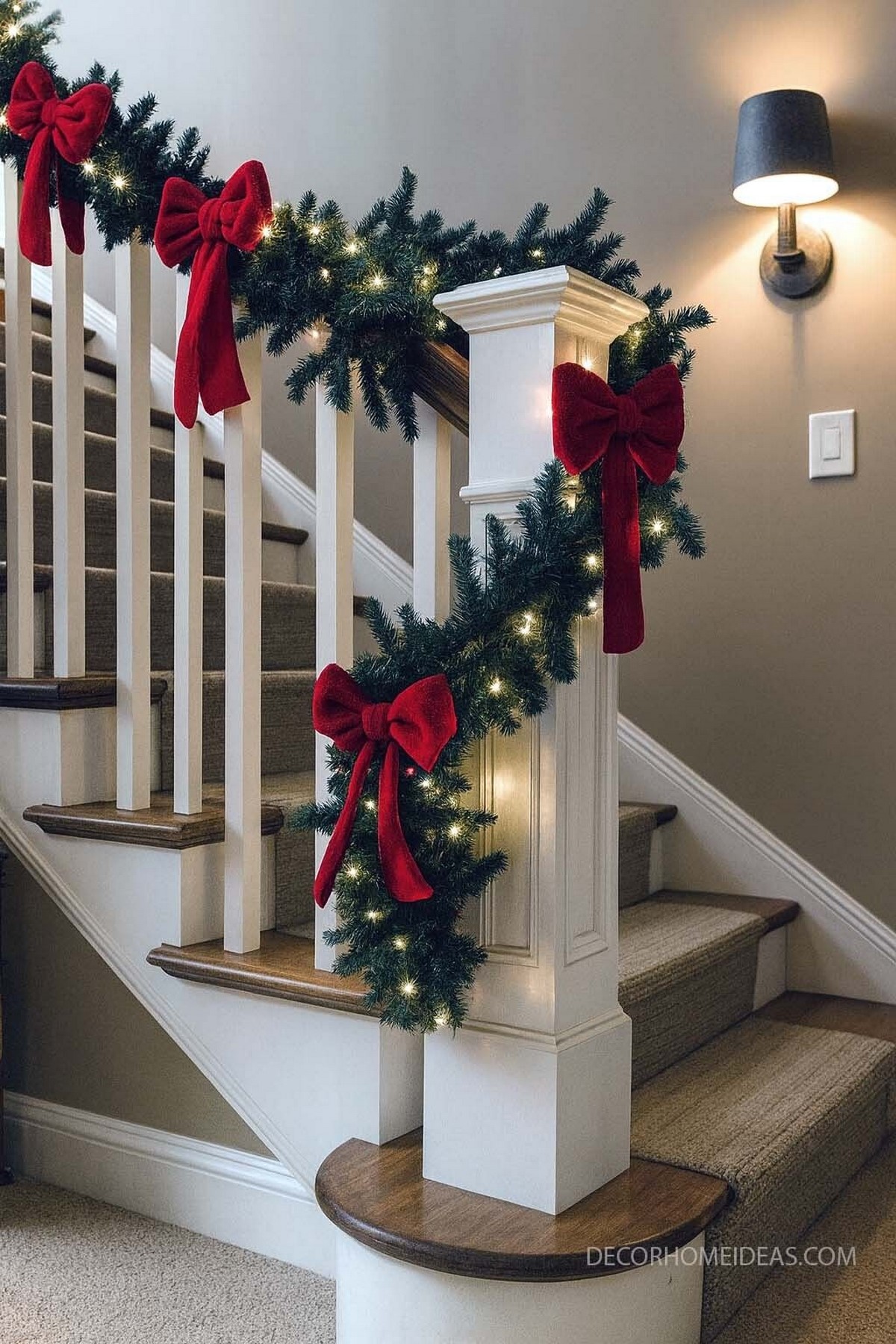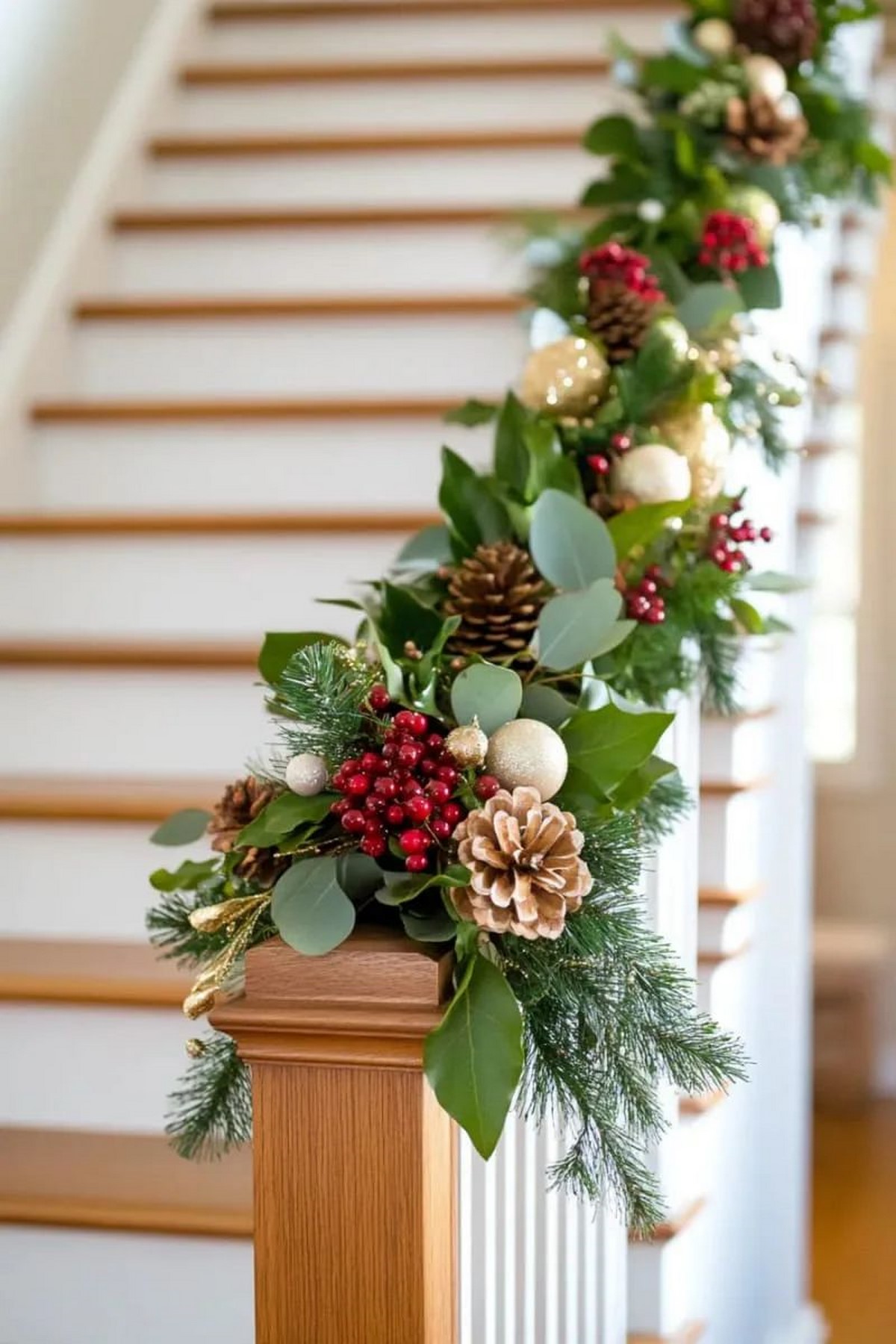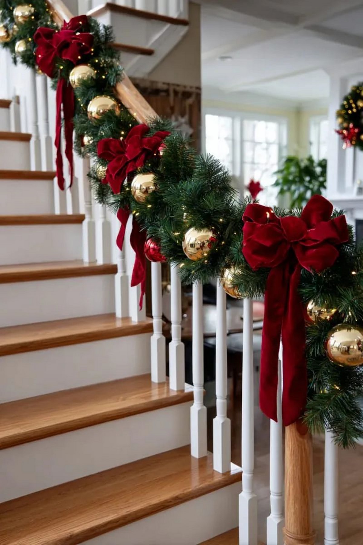 Сходи прикрашають живими хвойними гірляндами, довгими оксамитовими стрічками і м’яким теплим світлом. Тренд — «натуральна елегантність»: мінімум пластику, максимум хвої і тканини.