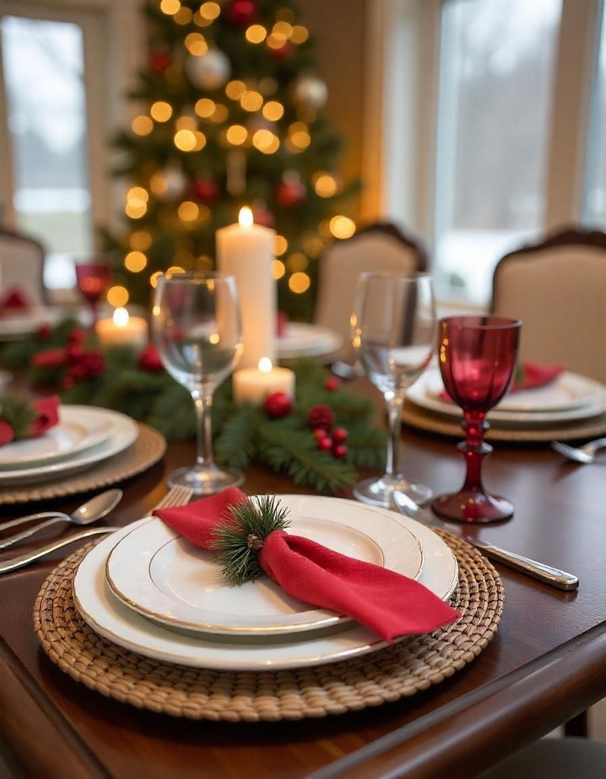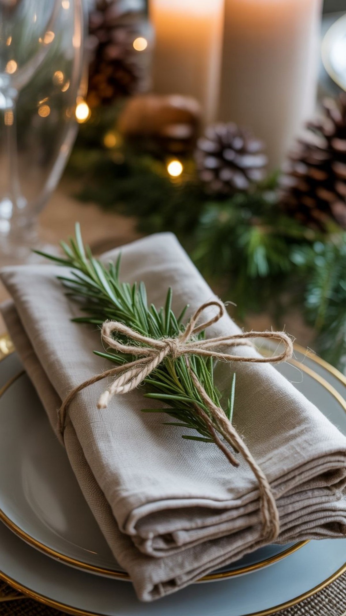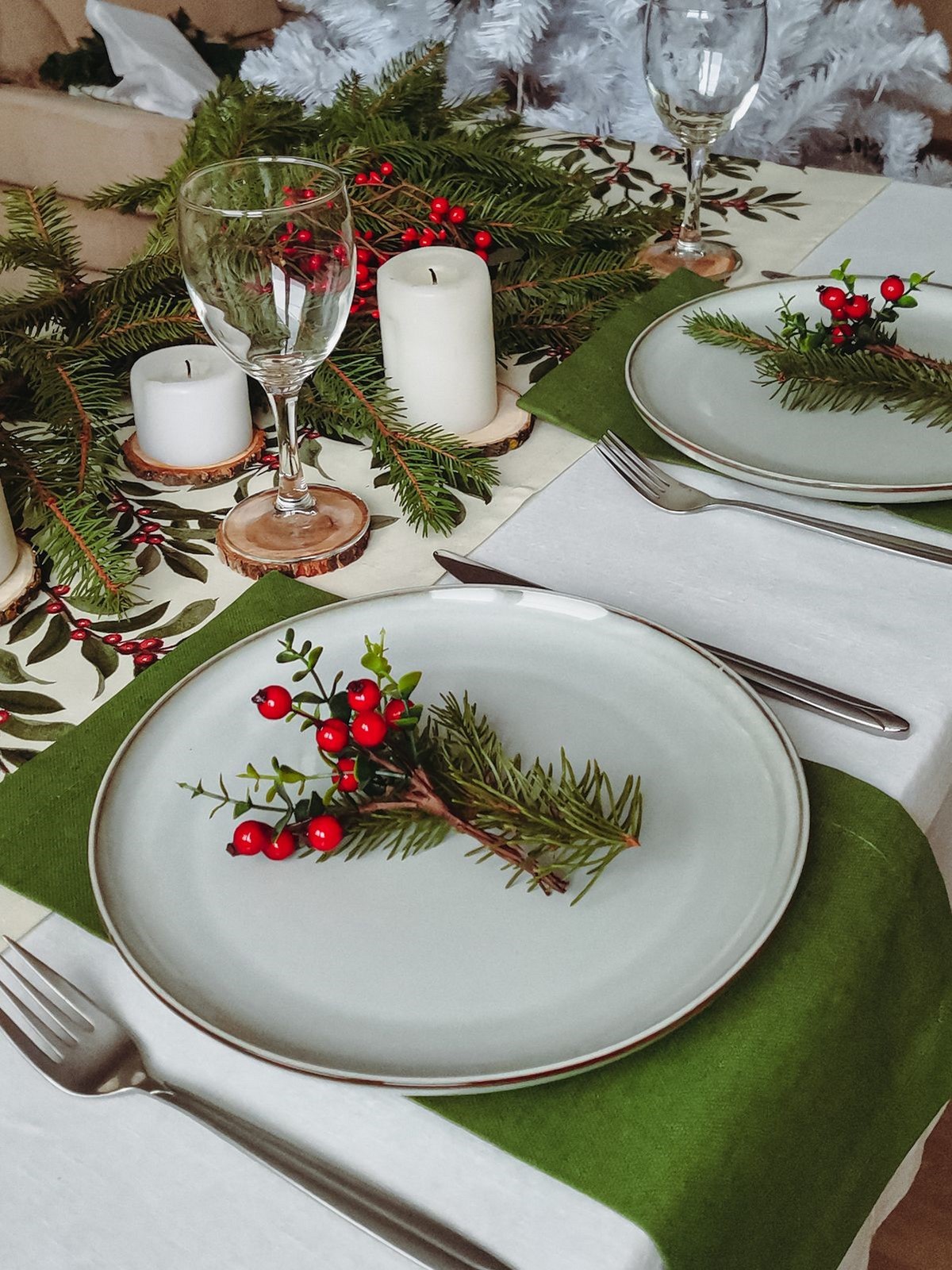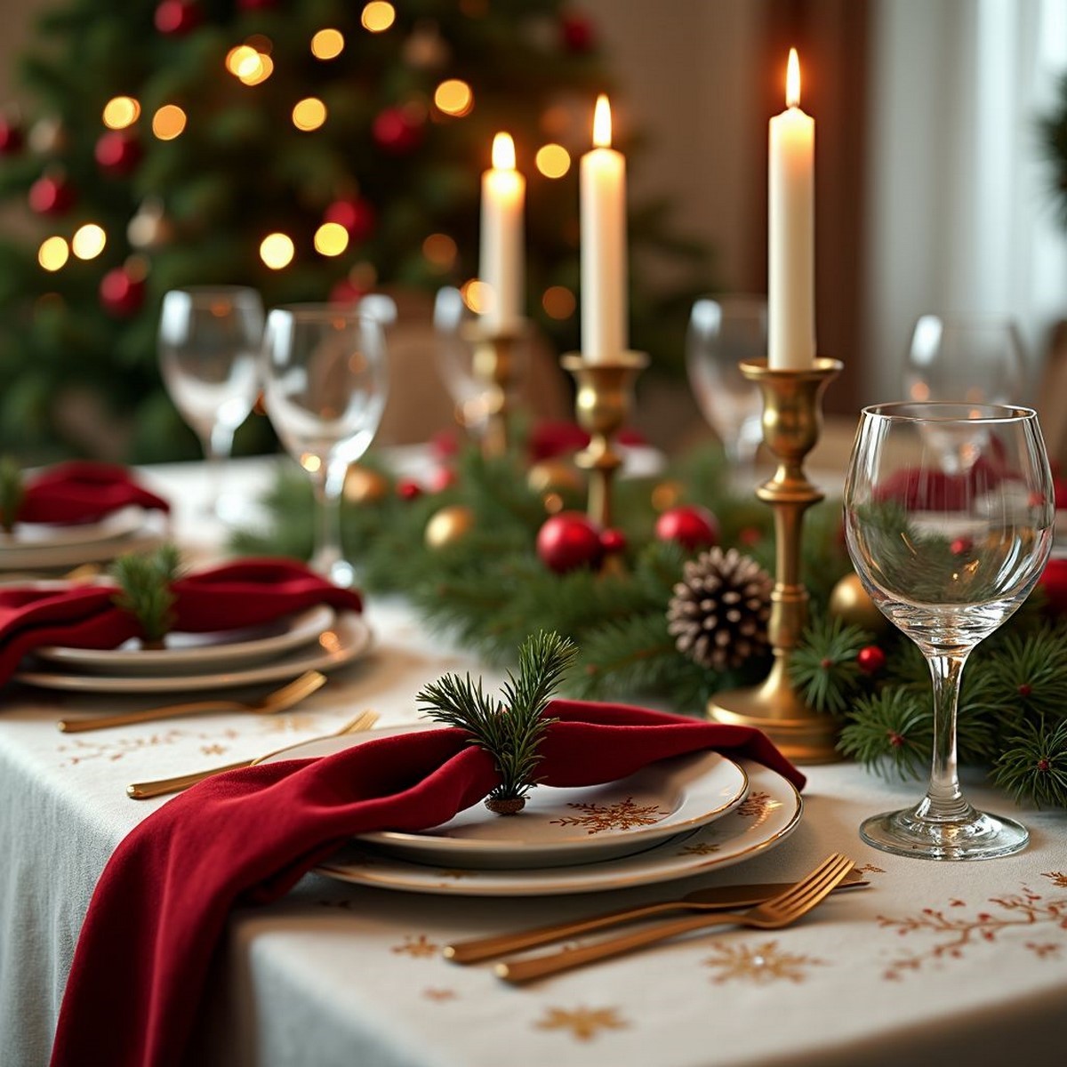 Сервірування будується на багатошаровості. Актуальні серветки з бавовни або льону, декоративні кільця, ялинові гілочки та імітація інею. Світло — м’яке, приглушене.