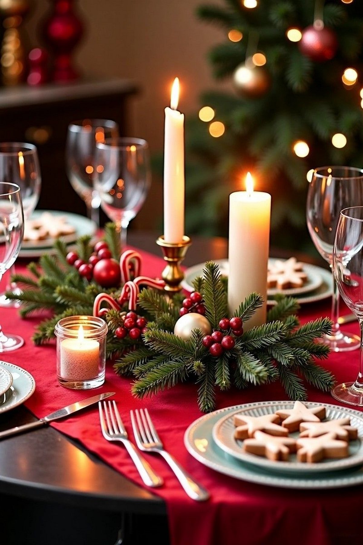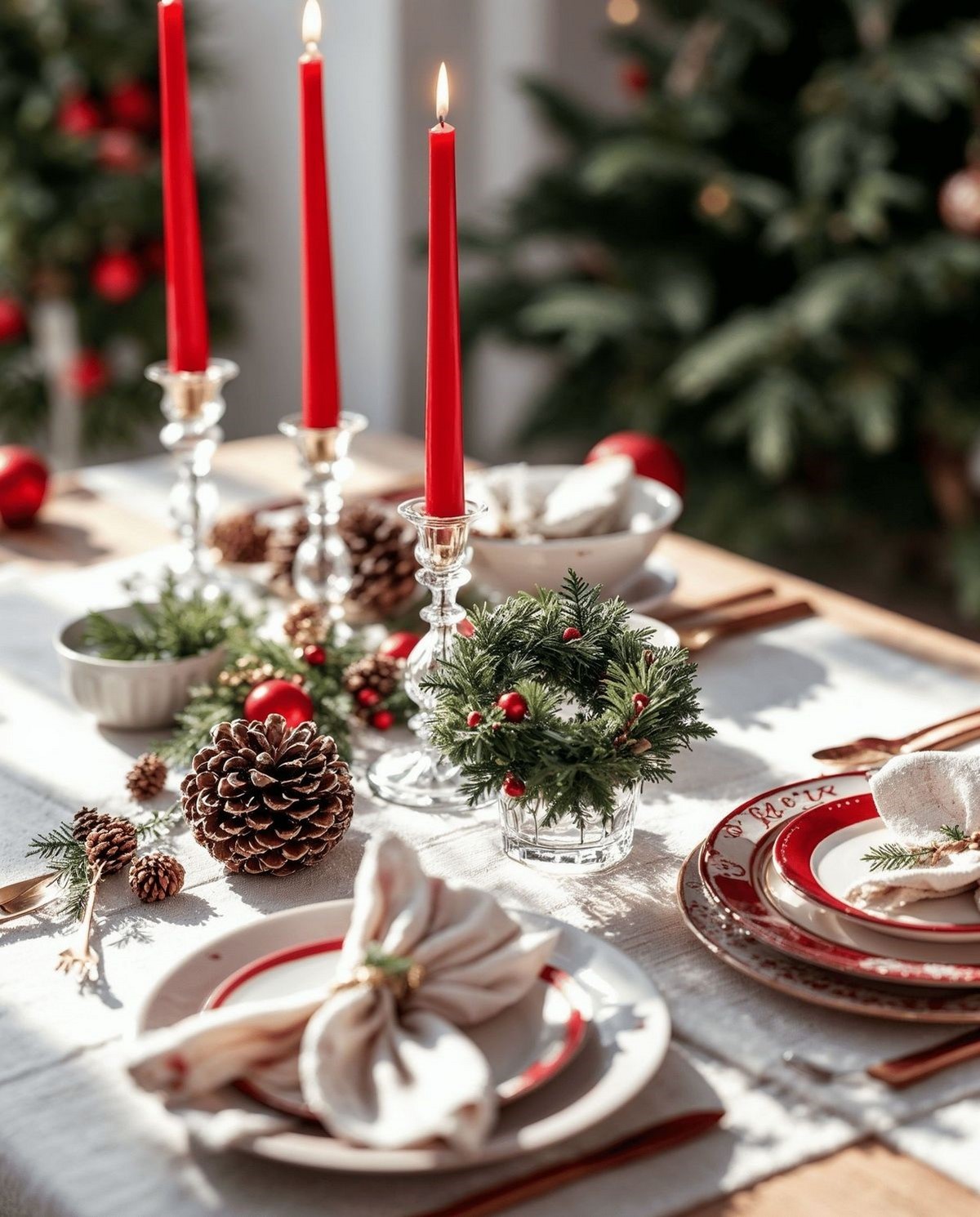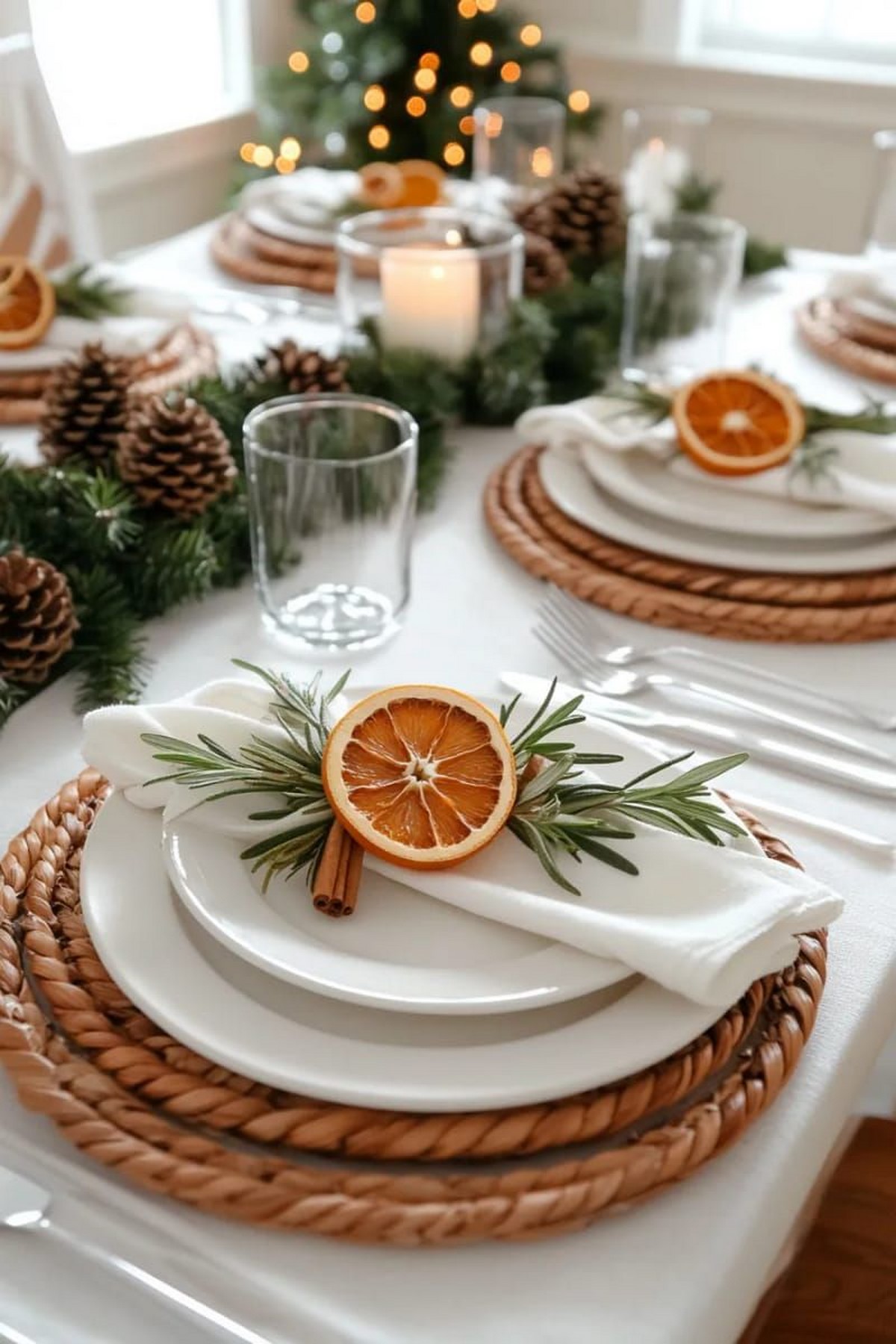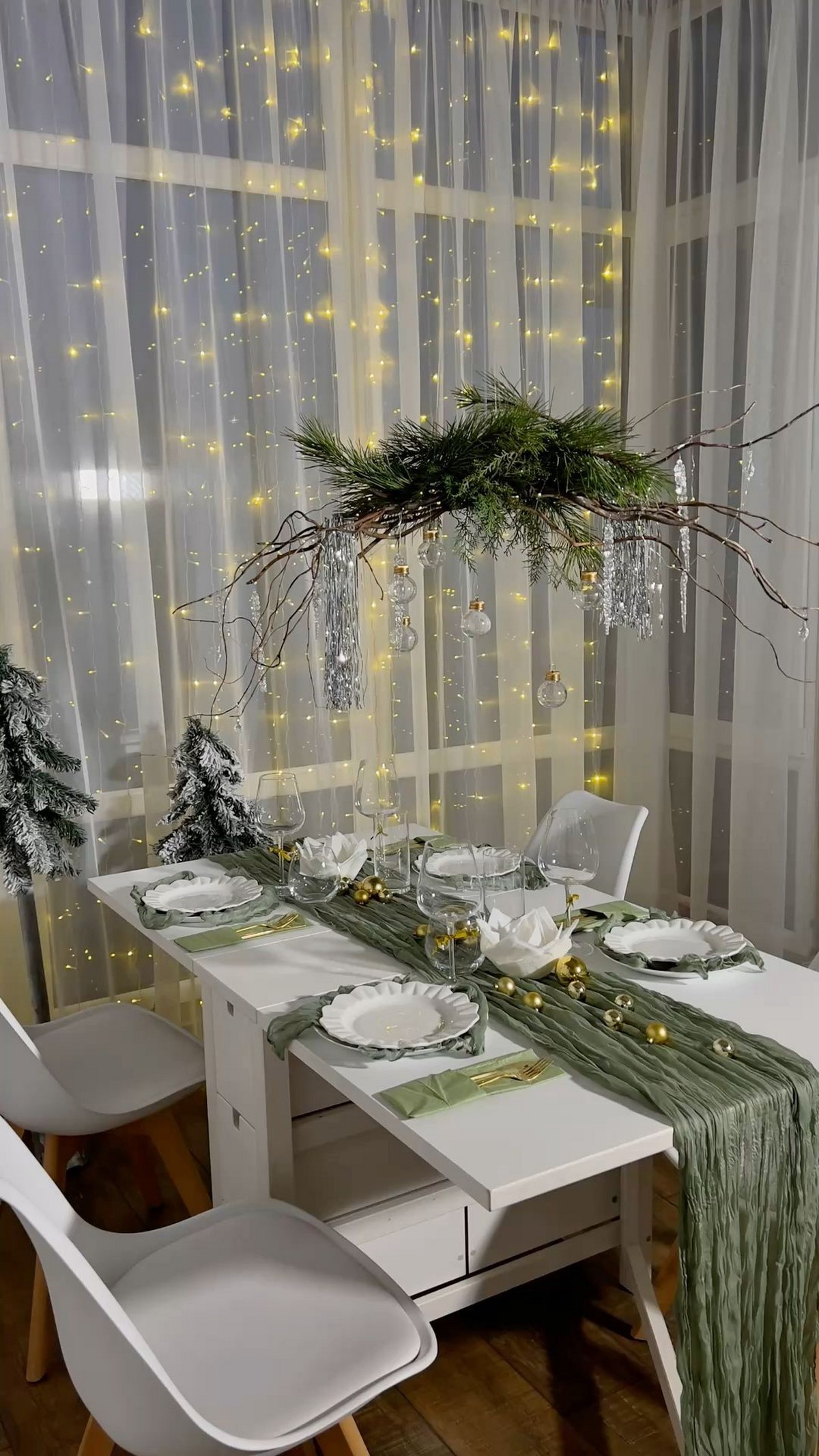 Сервірування будується на багатошаровості. Актуальні серветки з бавовни або льону, декоративні кільця, ялинові гілочки та імітація інею. Світло — м’яке, приглушене.