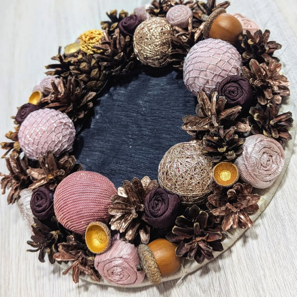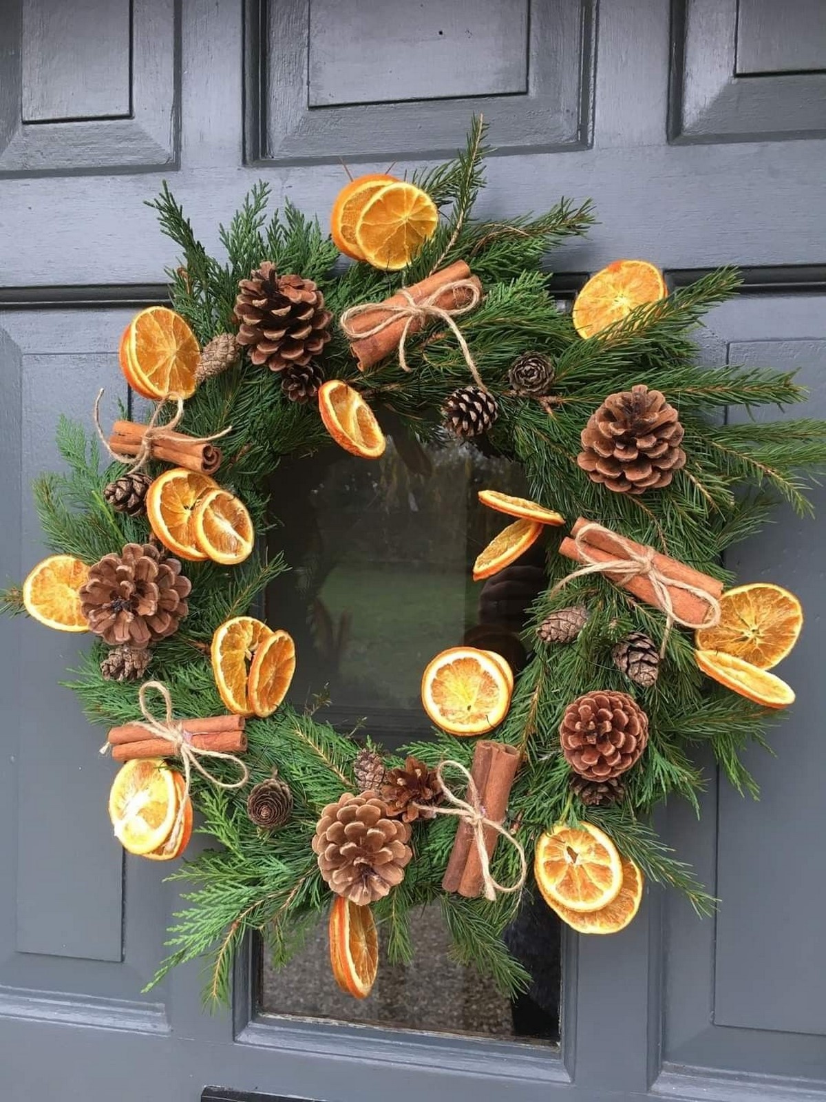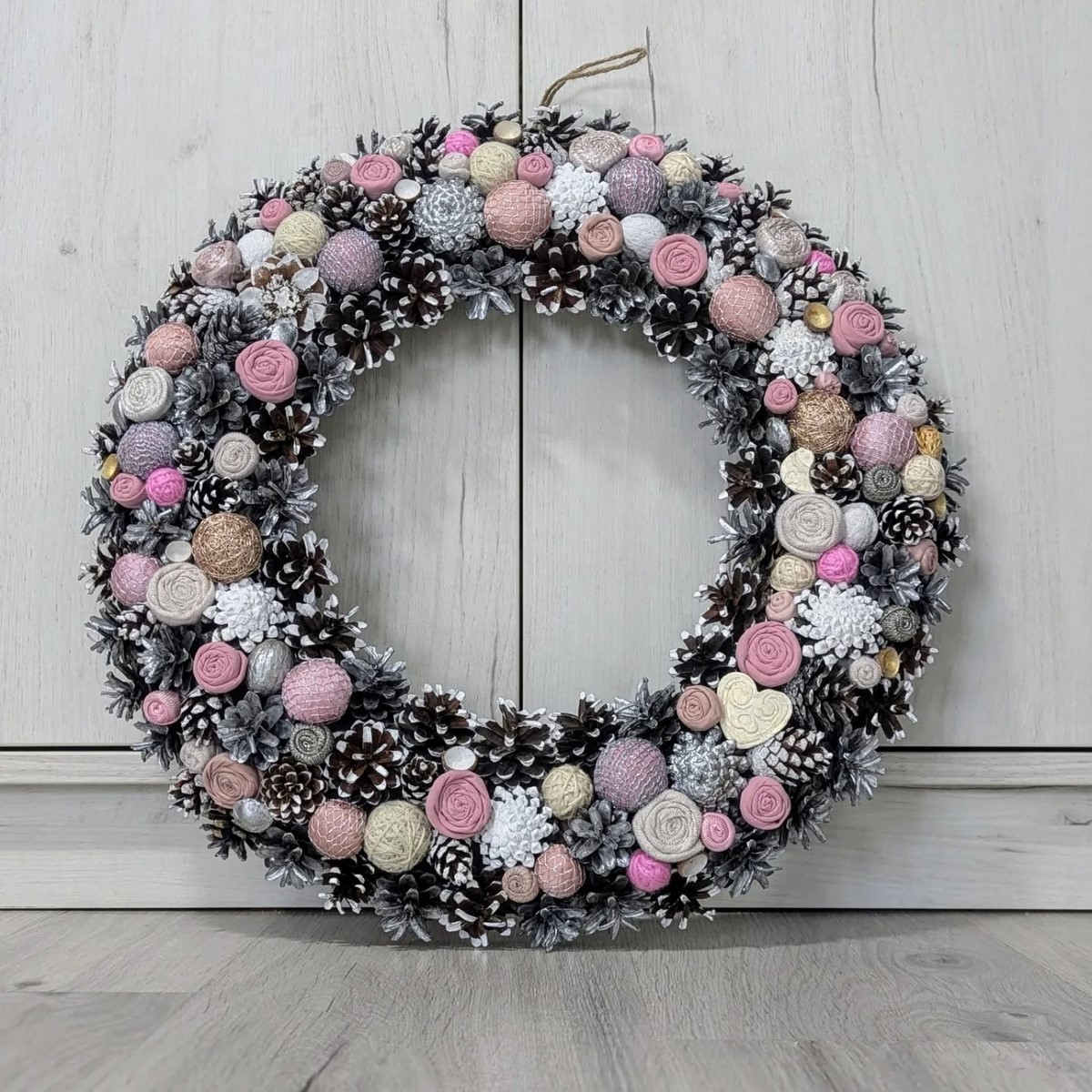 Новорічний вінок у 2026 році виконаний переважно з натуральних матеріалів: хвоя, евкаліпт, ялинові шишки, кориця. Колір — переважно природний з легким сріблястим інеєм.
