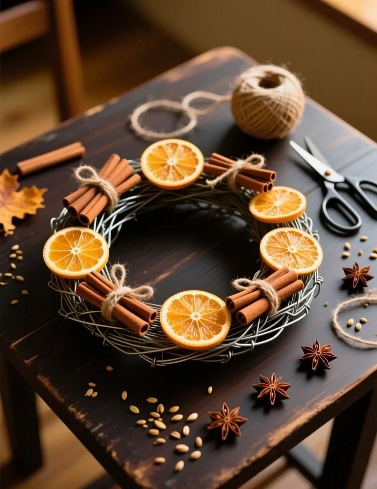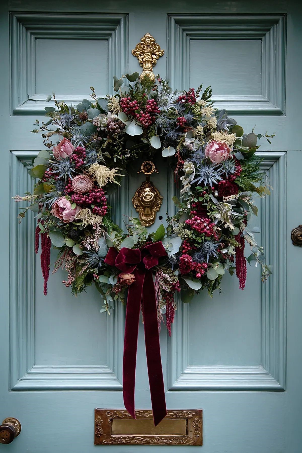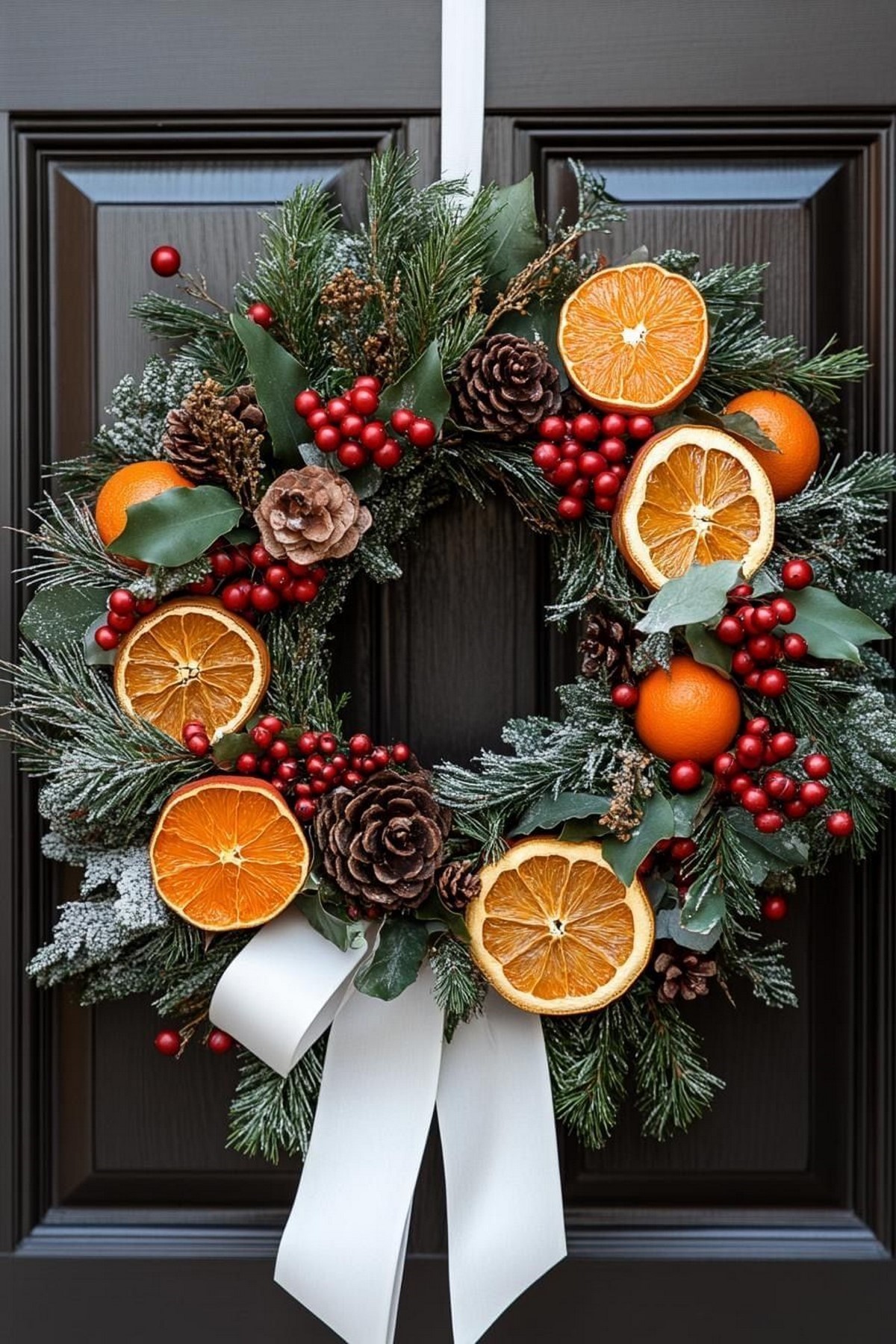 Новорічний вінок у 2026 році виконаний переважно з натуральних матеріалів: хвоя, евкаліпт, ялинові шишки, кориця. Колір — переважно природний з легким сріблястим інеєм.