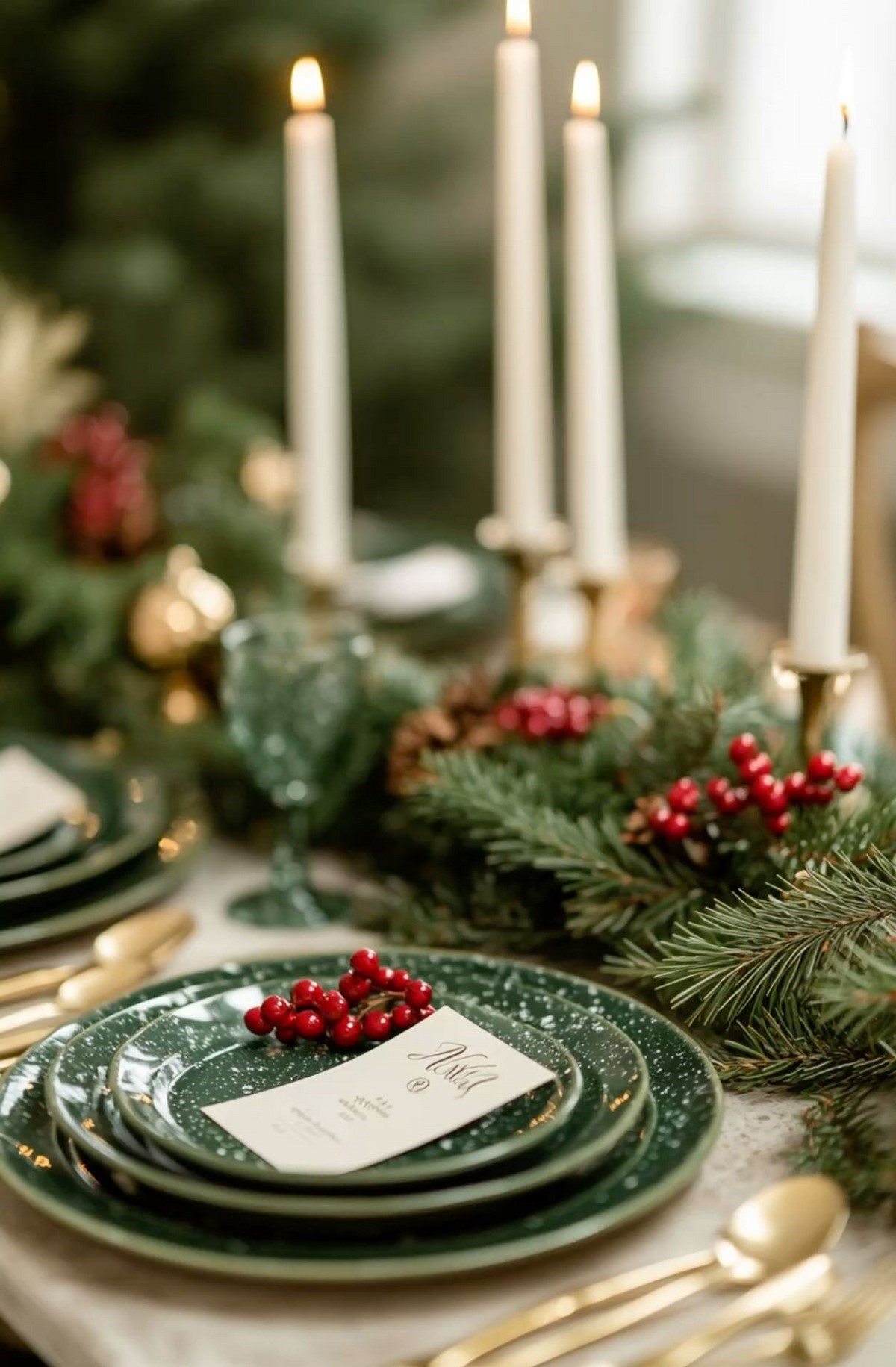 Головний акцент столу — фактури: лляна скатертина, матова кераміка, дерев’яні підставки. Колір: кремовий, графітовий, лісовий зелений. Додають скляні елементи і легке золото, але без зайвої розкоші.