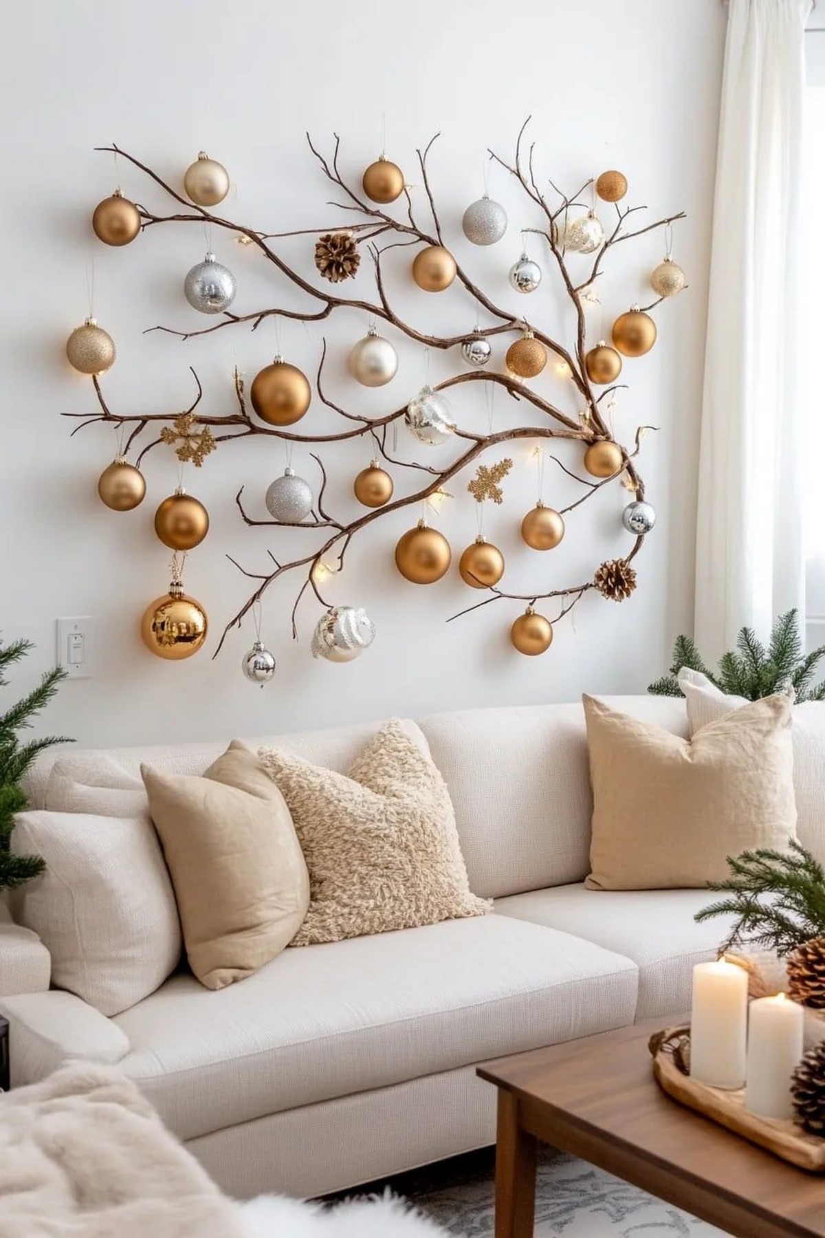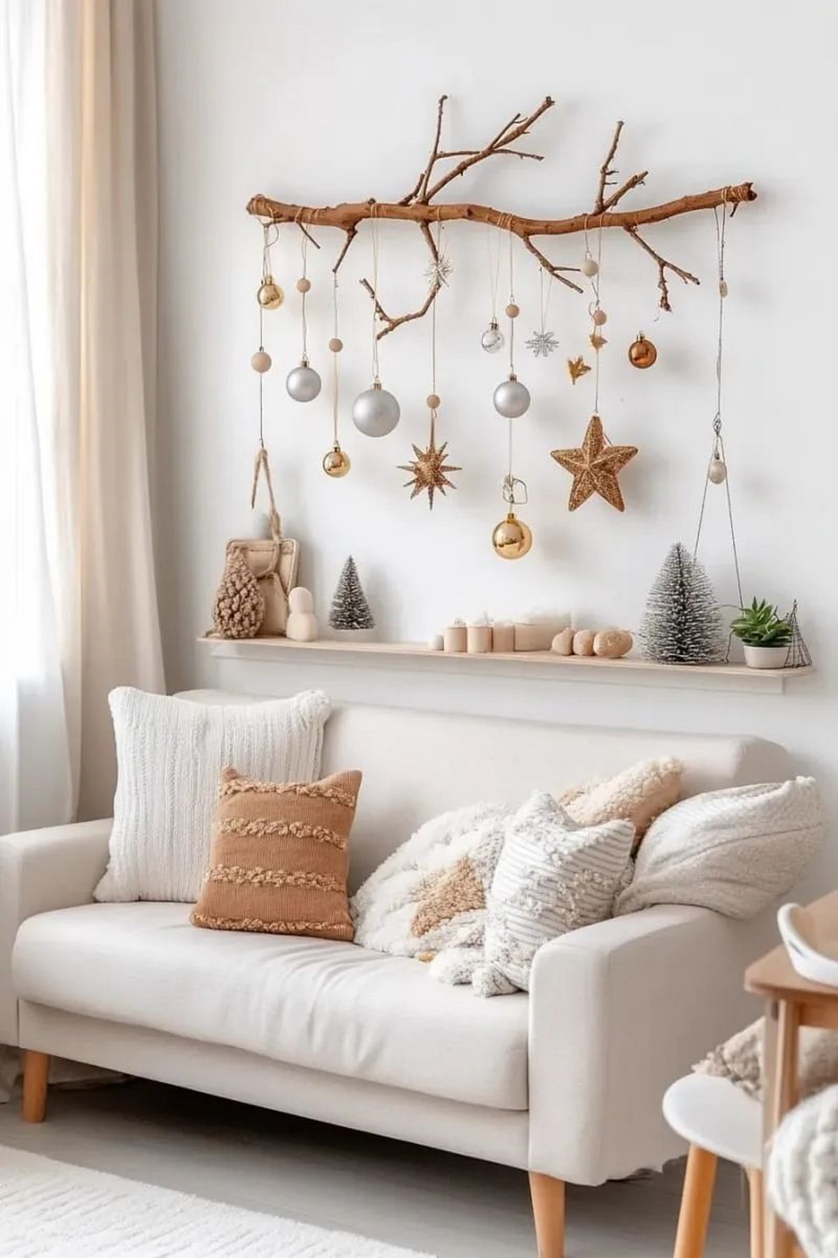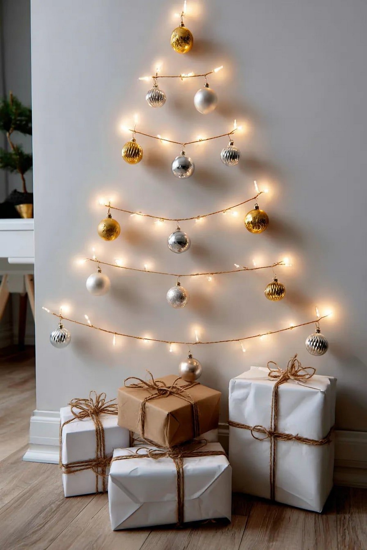 Стіни прикрашають мінімалістичними композиціями — гілки туї або евкаліпта, світлові інсталяції, рамки з новорічними принтами. У моді — акуратні вертикальні гірлянди і світлові краплі.