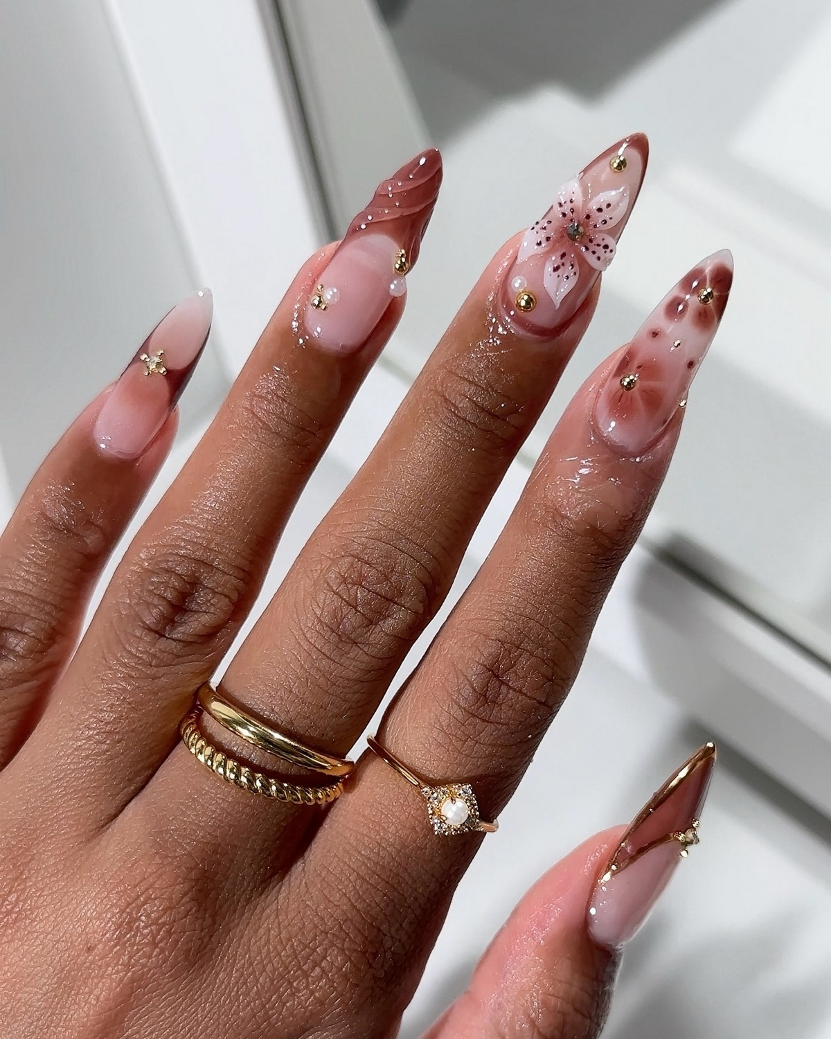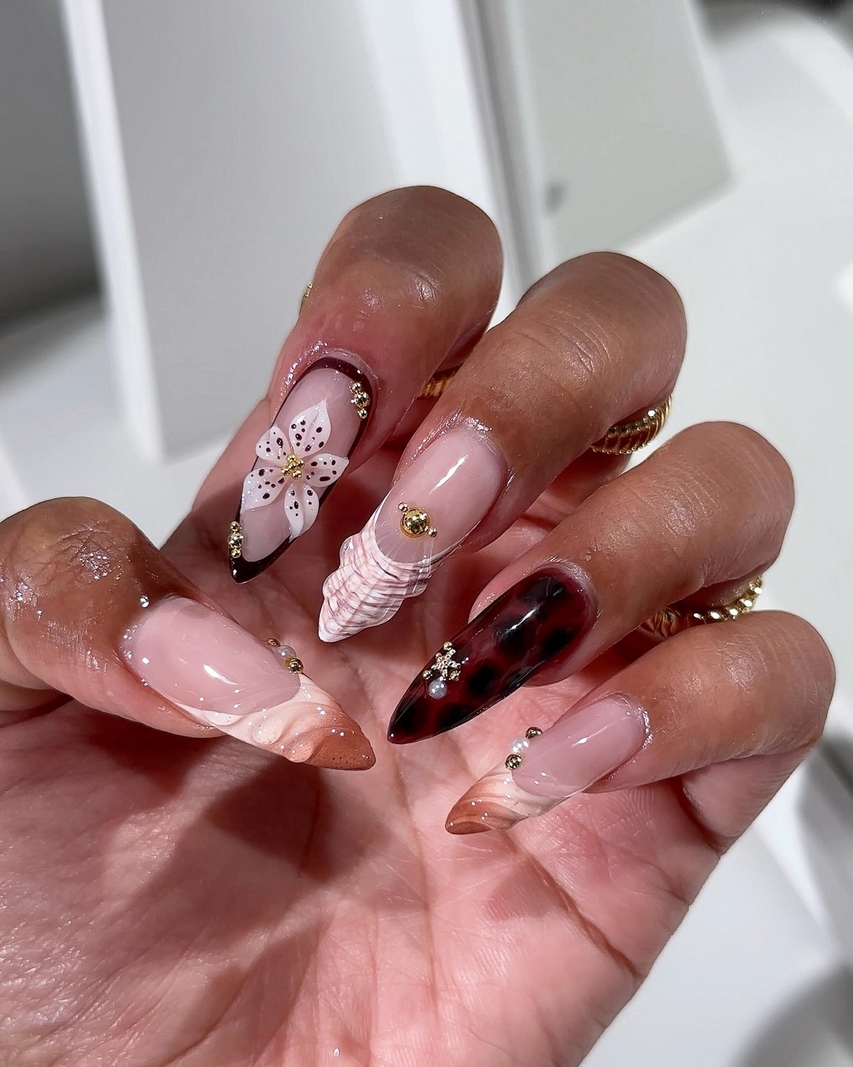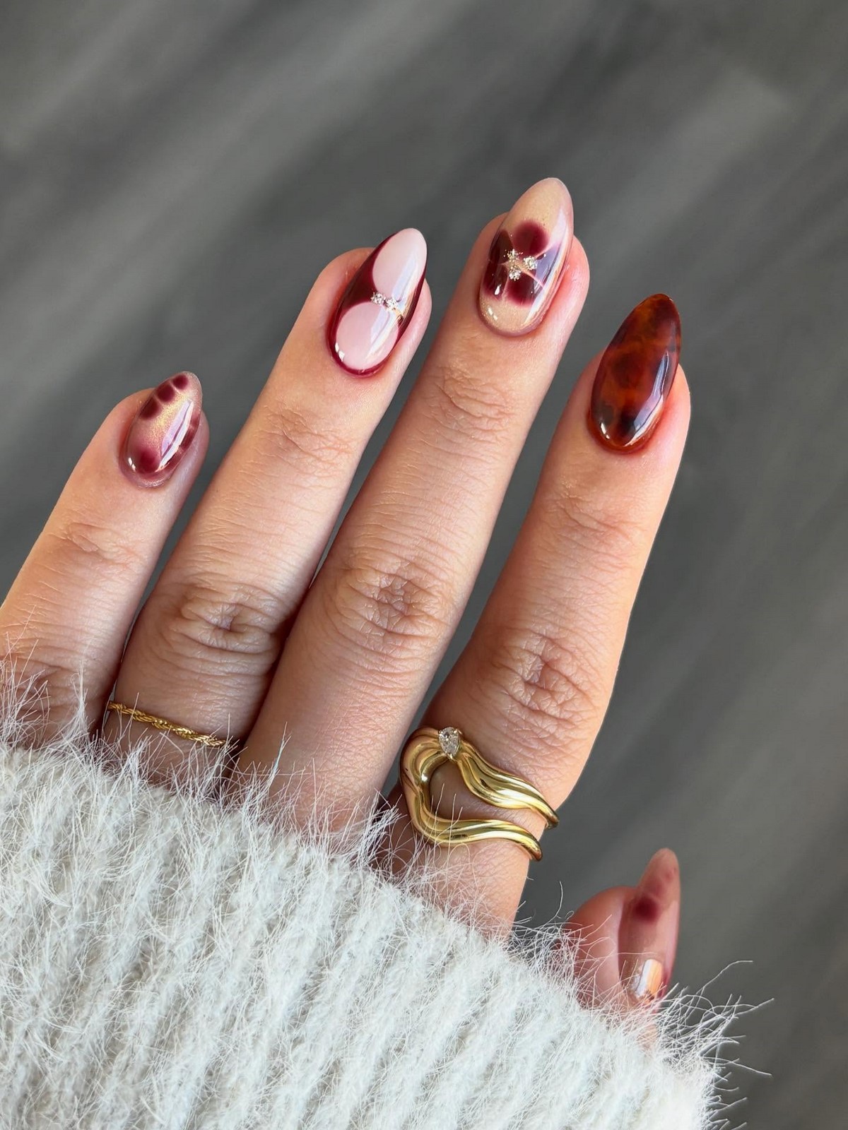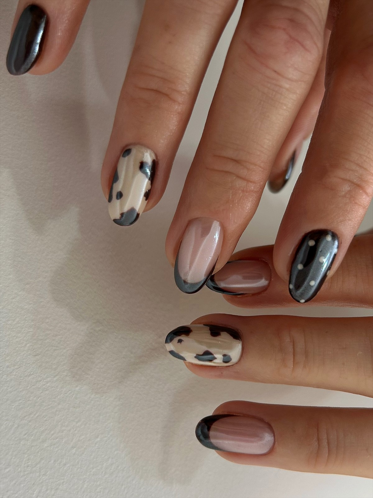 Комбінація різних технік і відтінків — візитна картка осені 2025. В одному дизайні можна поєднати нюд, принти, текстури і блиск. Такий манікюр виглядає креативно і сучасно, підкреслюючи індивідуальність. Він ідеально підійде для тих, хто любить експерименти і не боїться виділятися.
