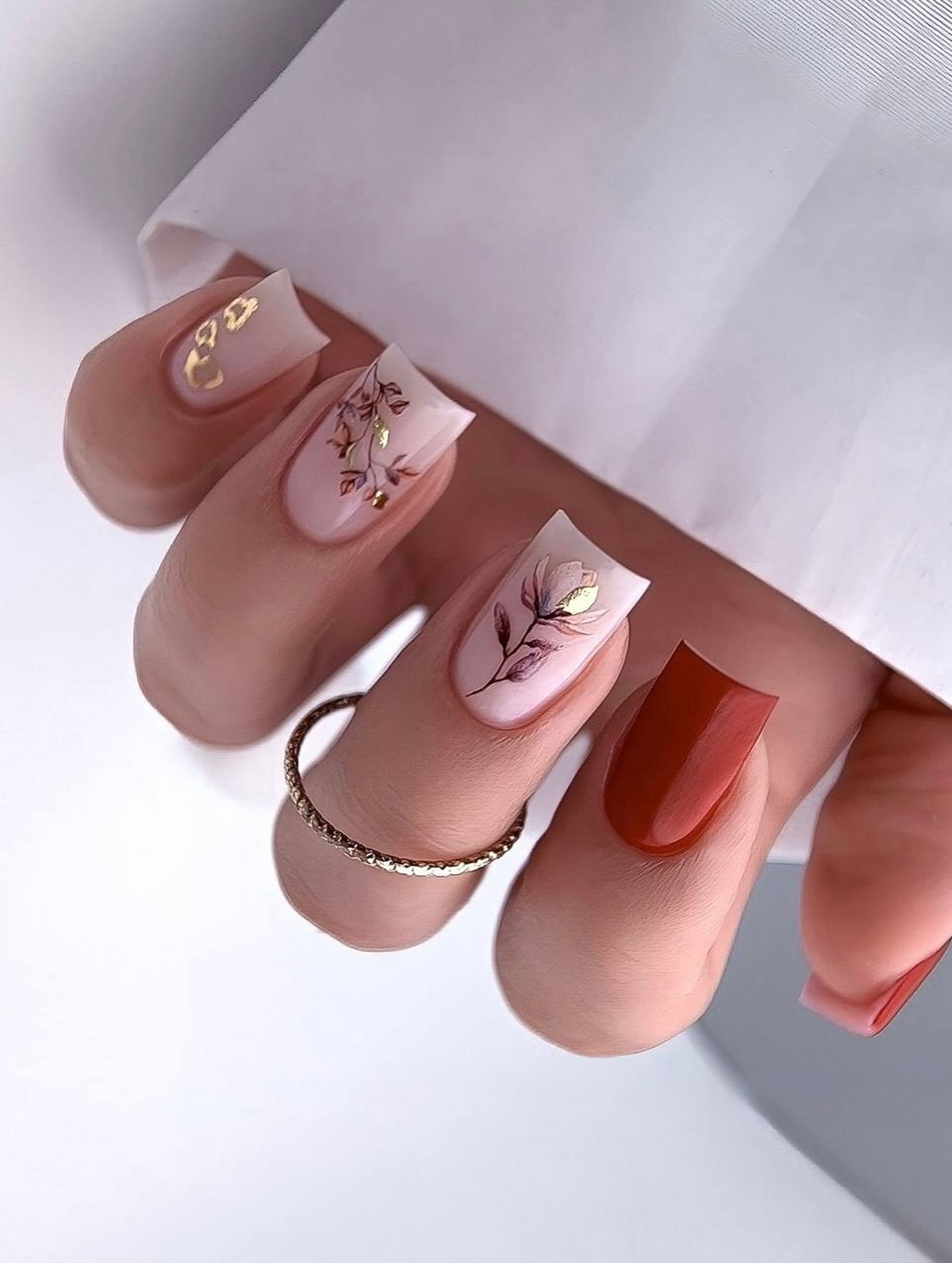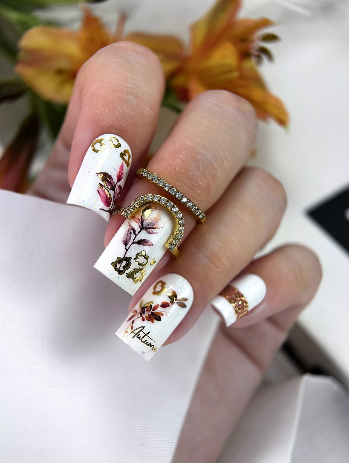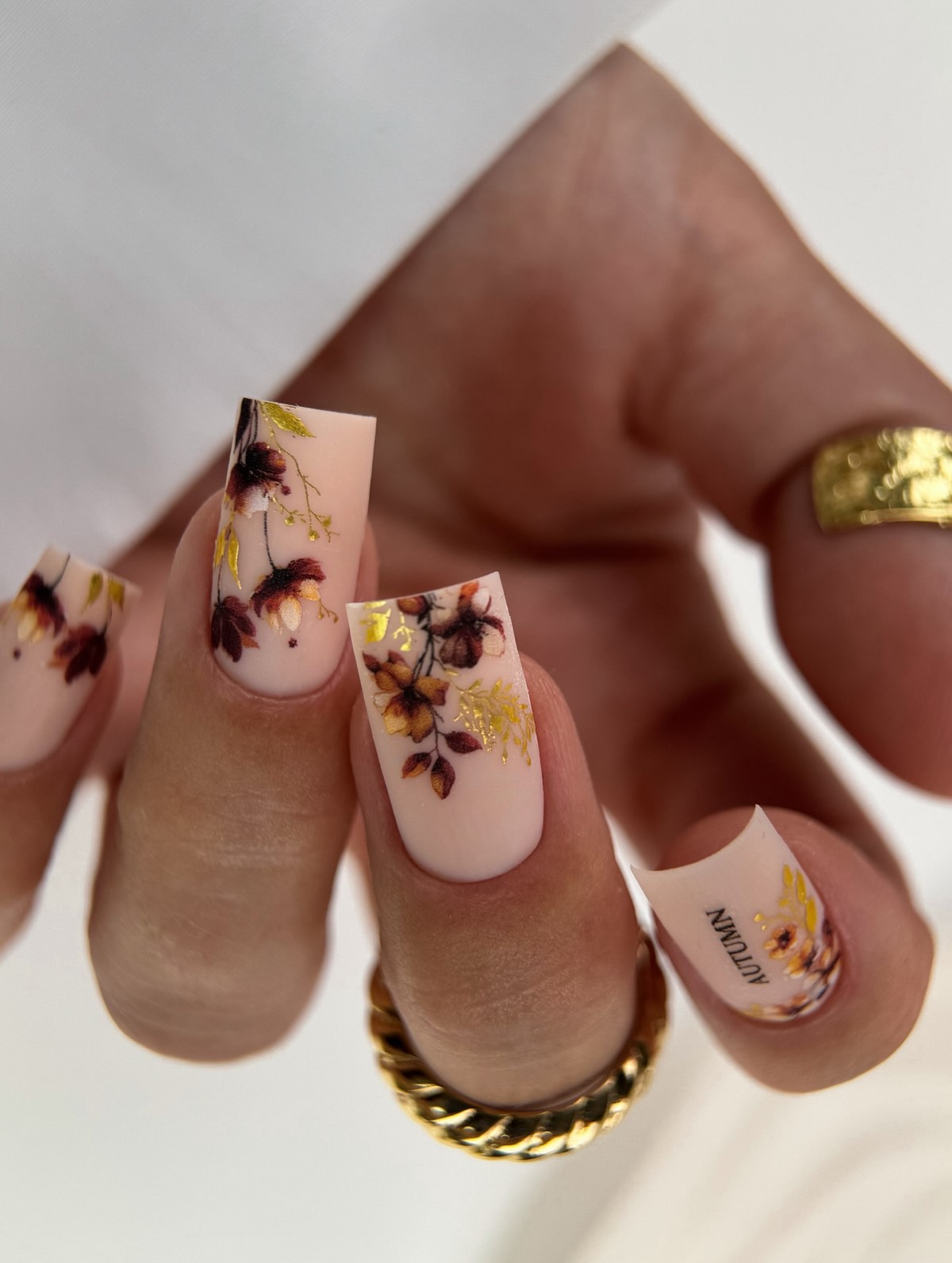 Флористичні мотиви залишаються в тренді навіть восени. На тлі нюдової або молочної бази квіти виглядають свіжо і романтично. Восени популярні мініатюрні малюнки в бордових, помаранчевих і зелених тонах. Такий манікюр ідеально підходить для створення ніжного образу.