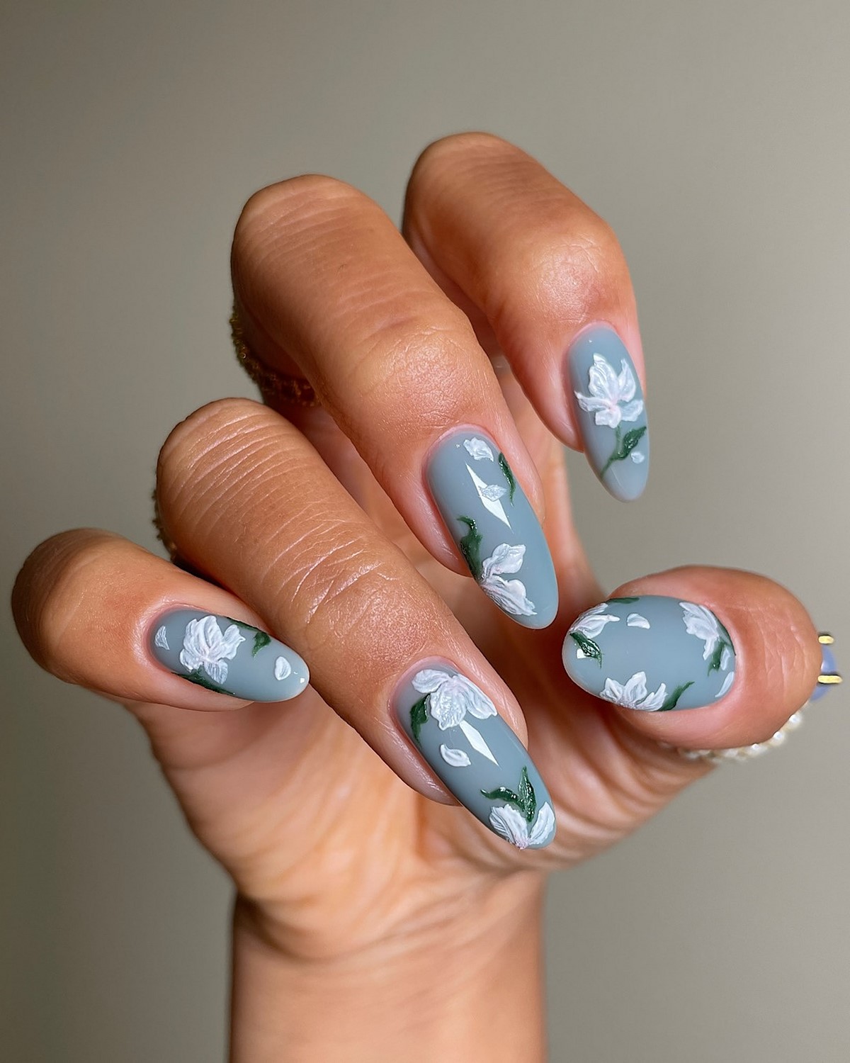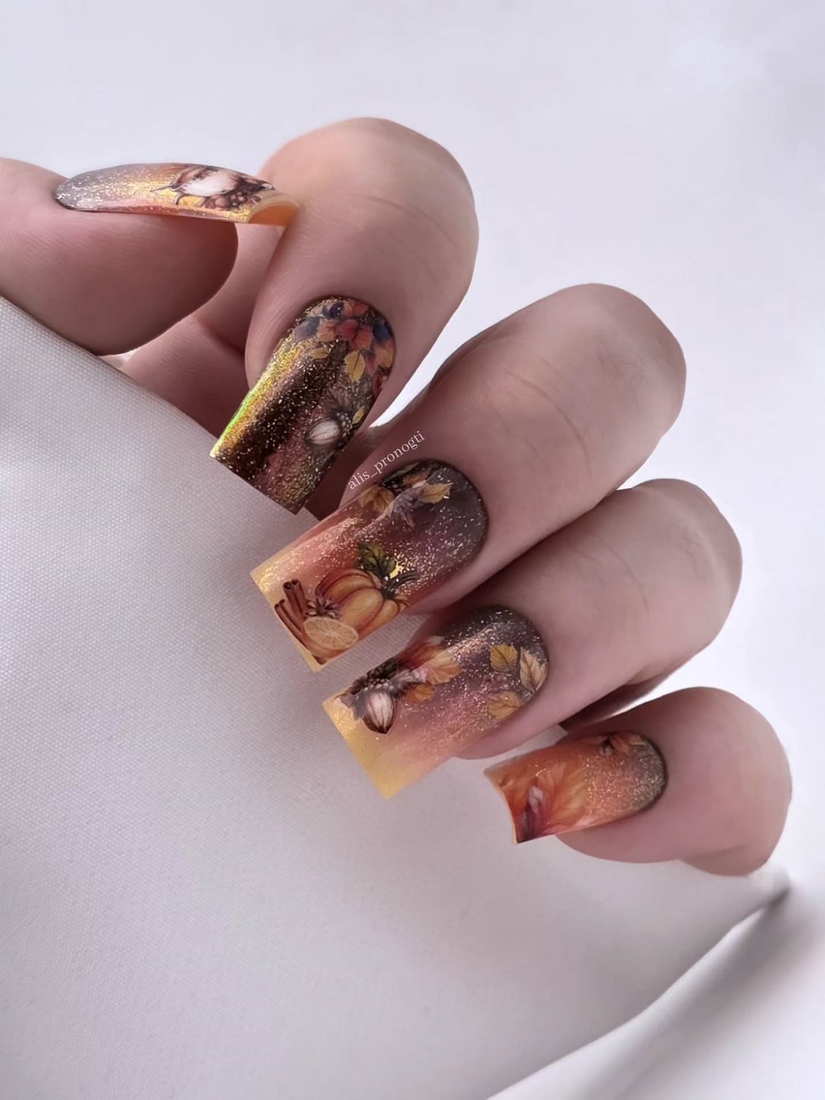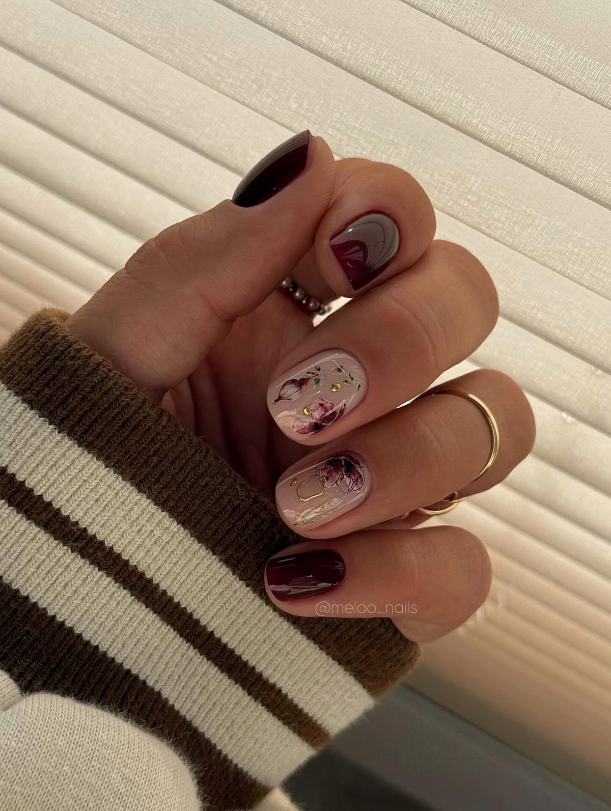 Флористичні мотиви залишаються в тренді навіть восени. На тлі нюдової або молочної бази квіти виглядають свіжо і романтично. Восени популярні мініатюрні малюнки в бордових, помаранчевих і зелених тонах. Такий манікюр ідеально підходить для створення ніжного образу.