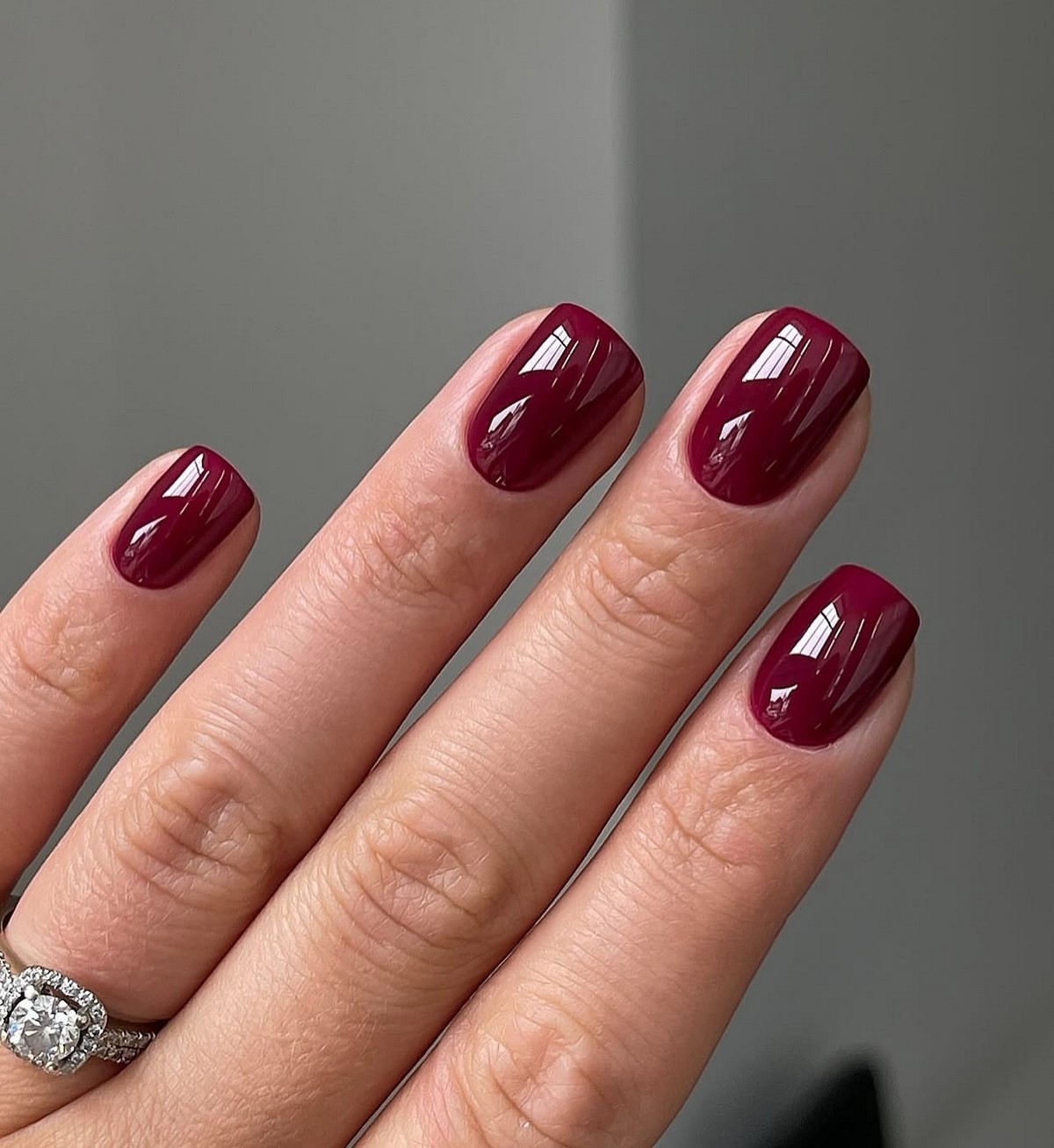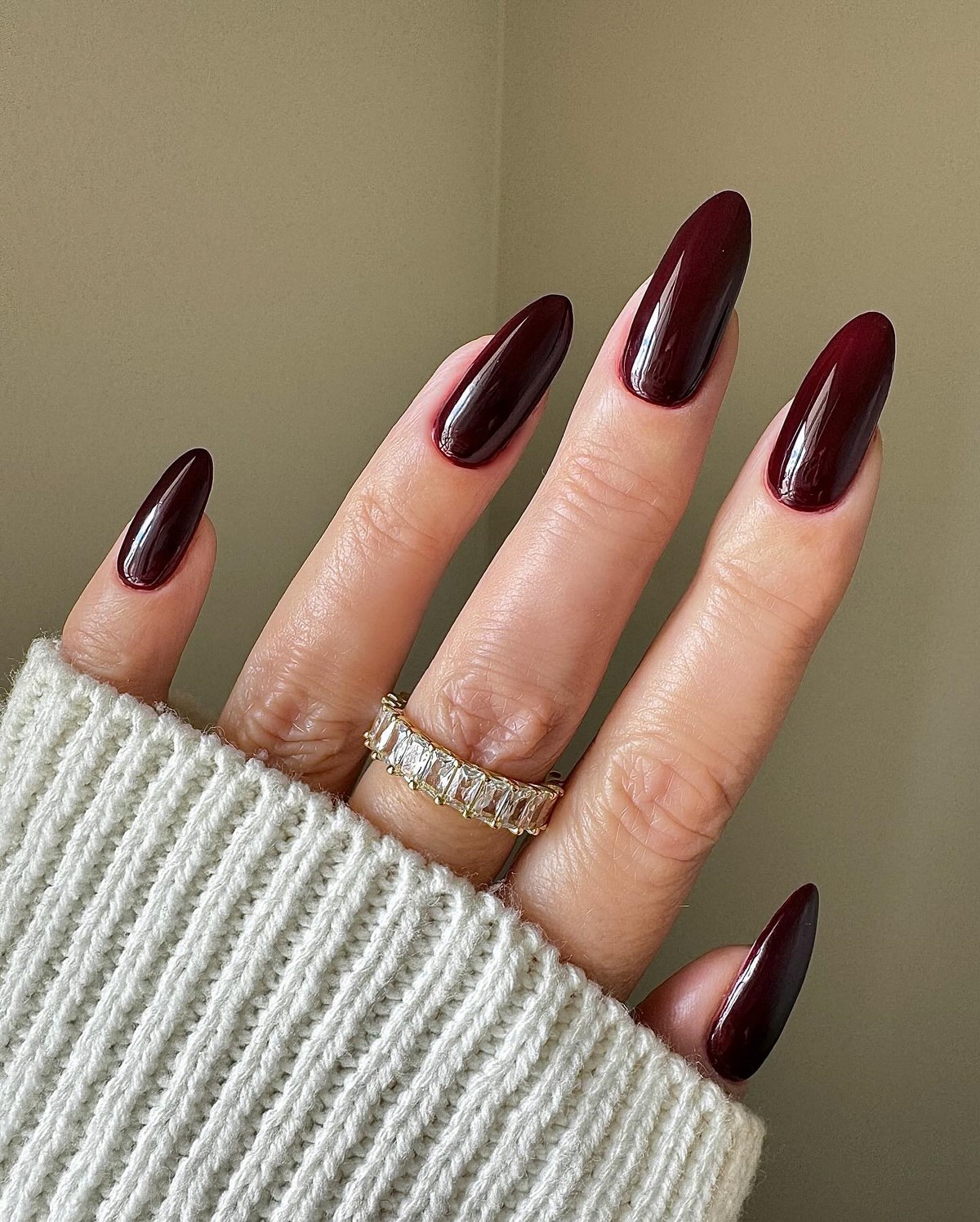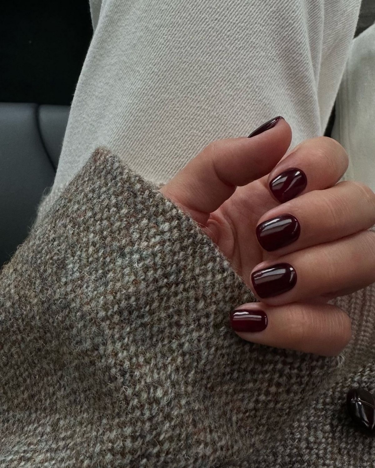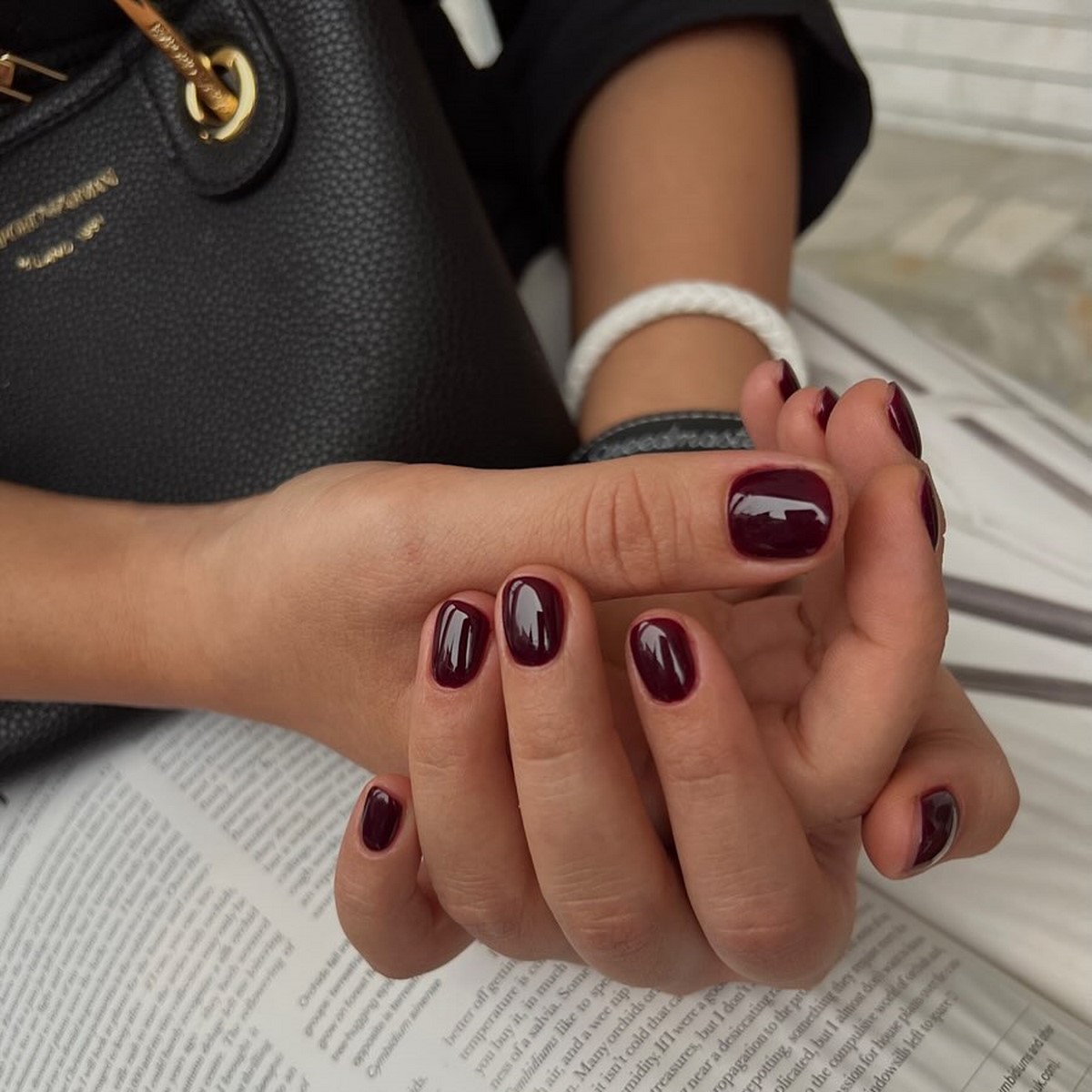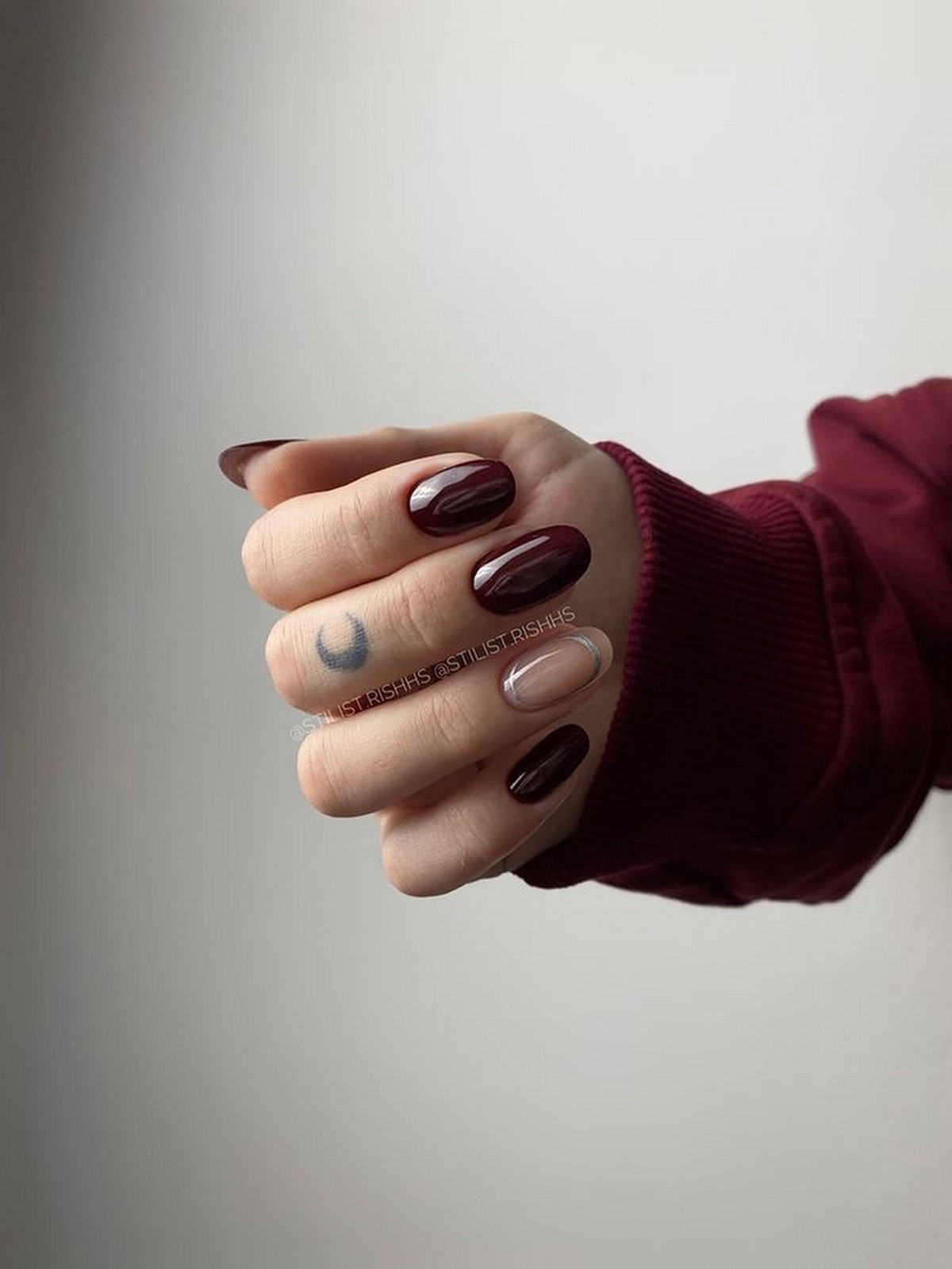 Глибокий бордовий — незмінний фаворит осені. Він надає образу драматичності і розкоші. Такий манікюр прекрасно виглядає в матовому виконанні, а також в комбінації з глянцевими акцентами. Можна додати тонкі золоті лінії або камені для святкового ефекту.