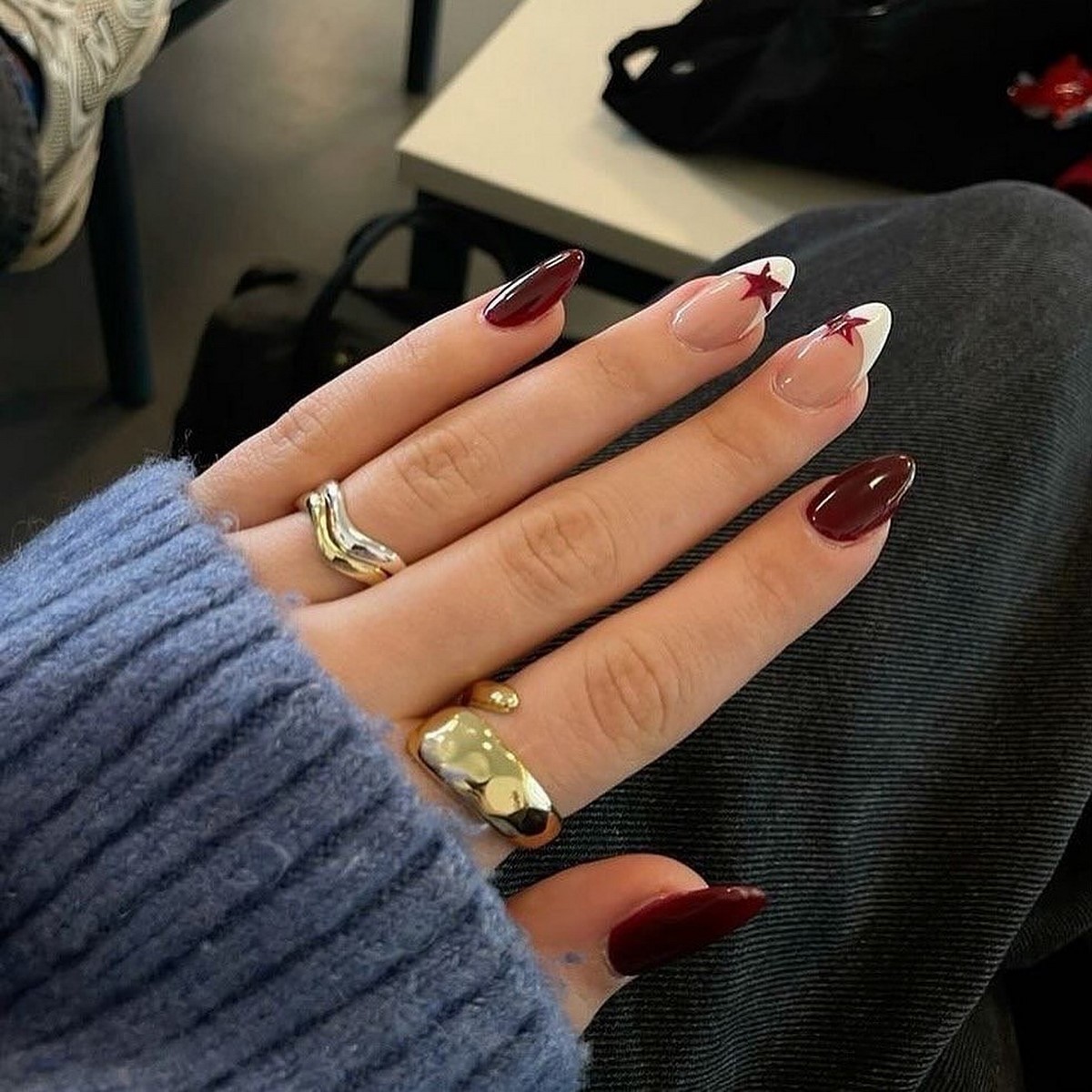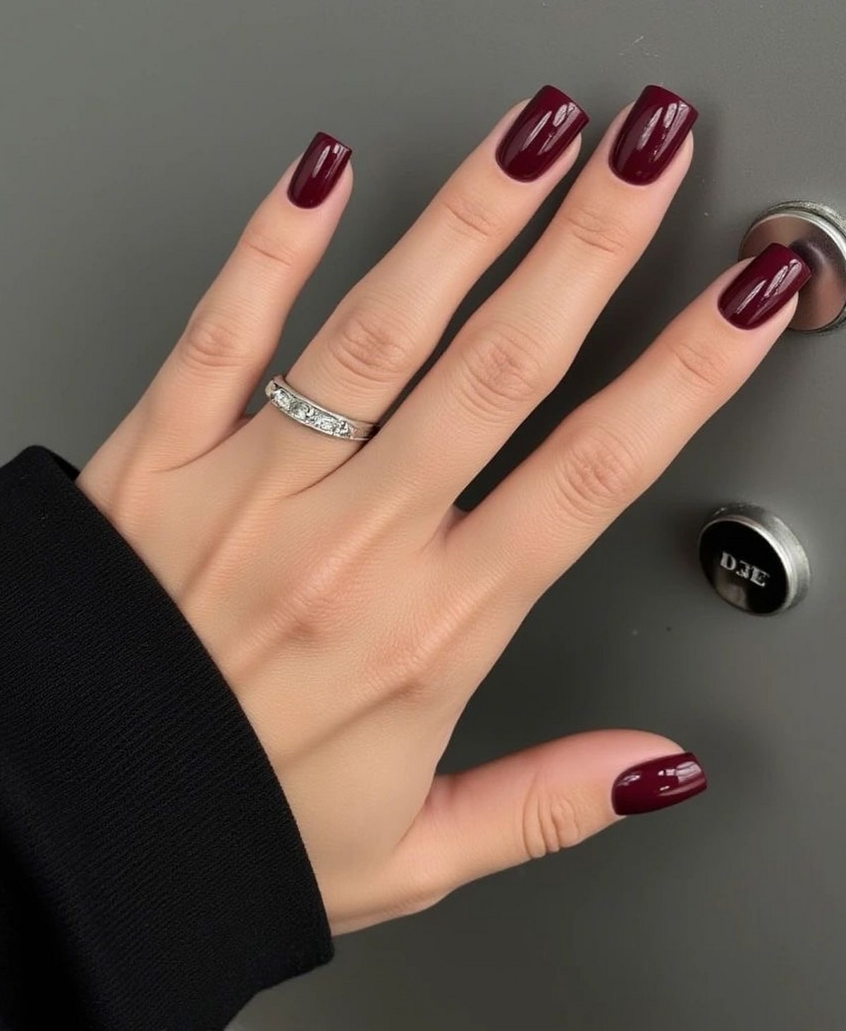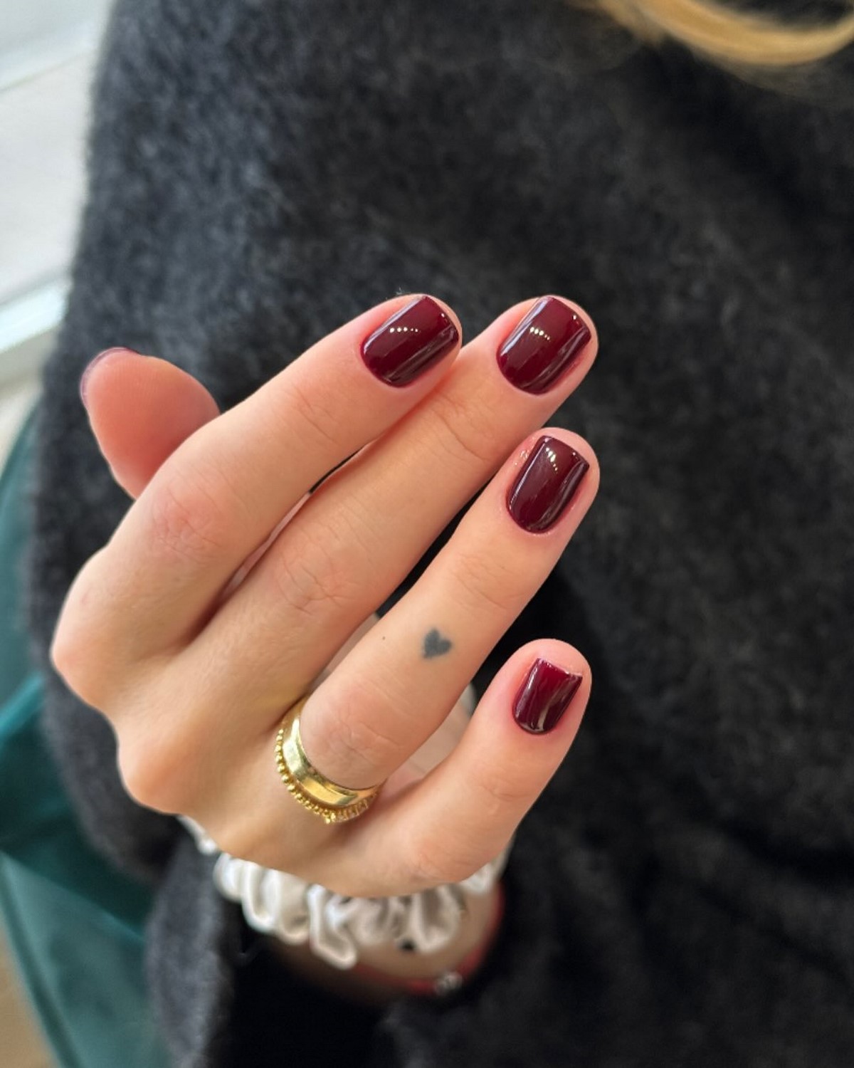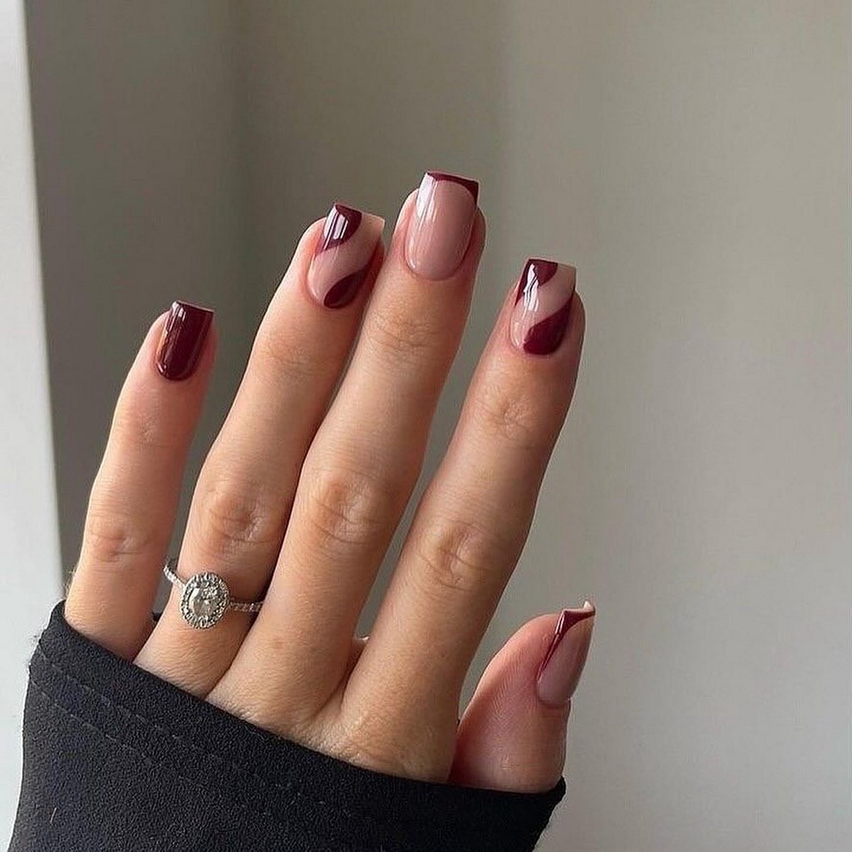 Глибокий бордовий — незмінний фаворит осені. Він надає образу драматичності і розкоші. Такий манікюр прекрасно виглядає в матовому виконанні, а також в комбінації з глянцевими акцентами. Можна додати тонкі золоті лінії або камені для святкового ефекту.