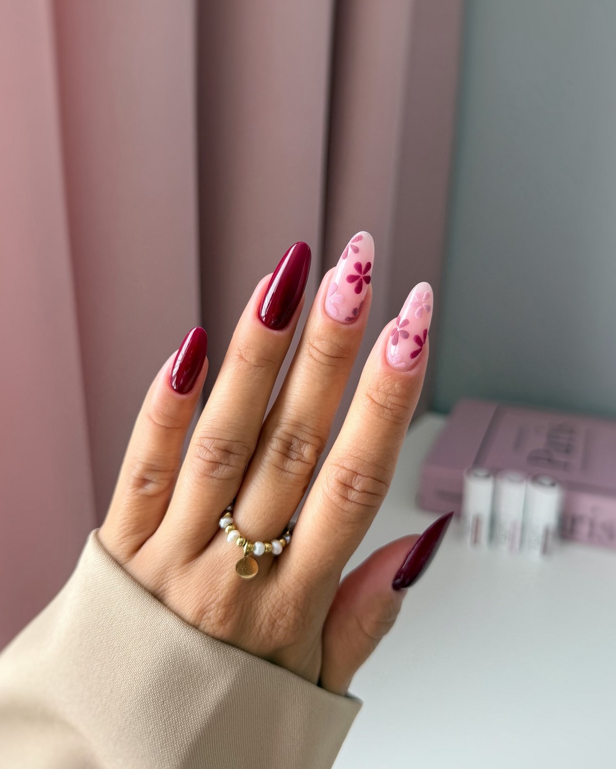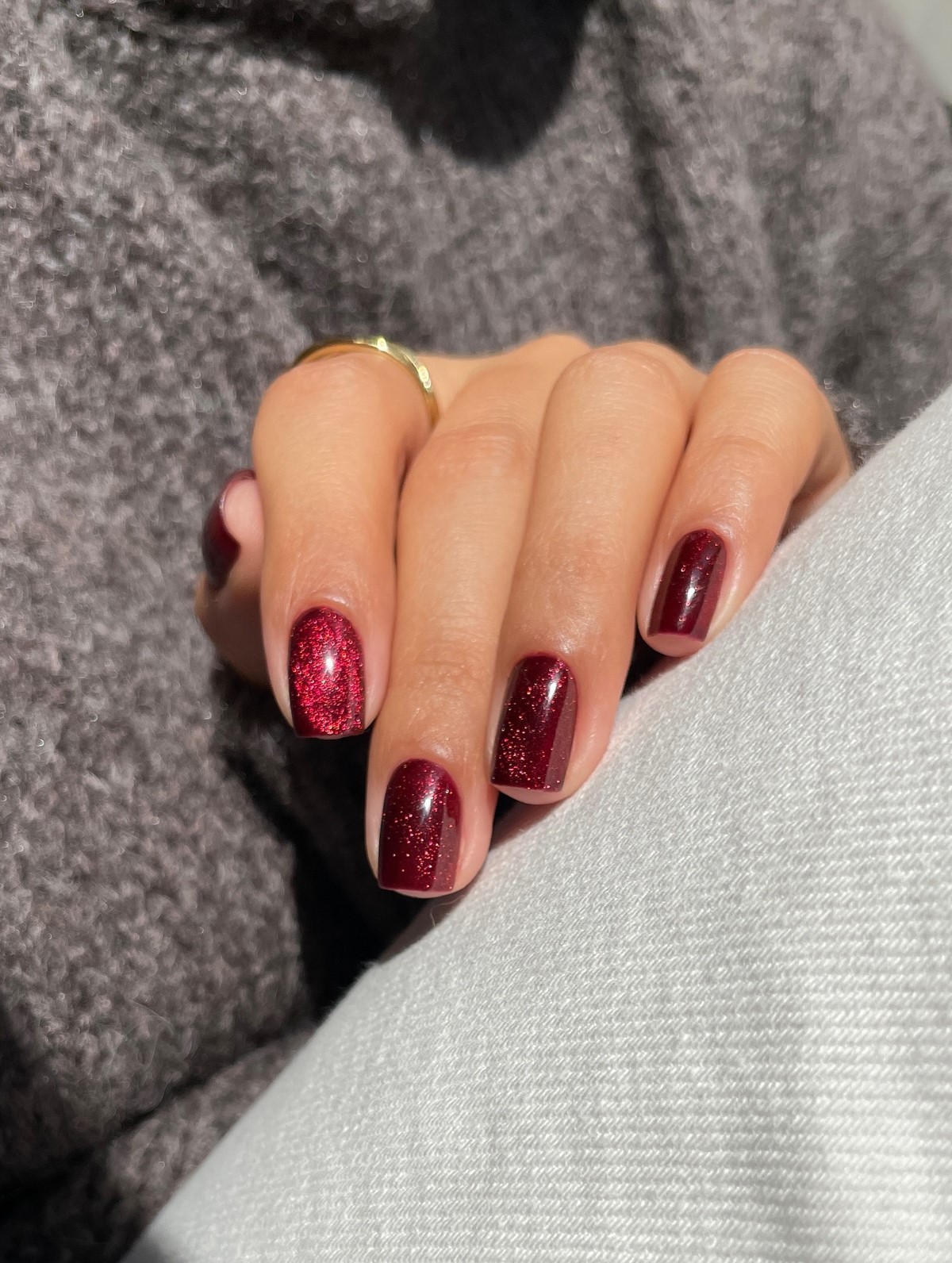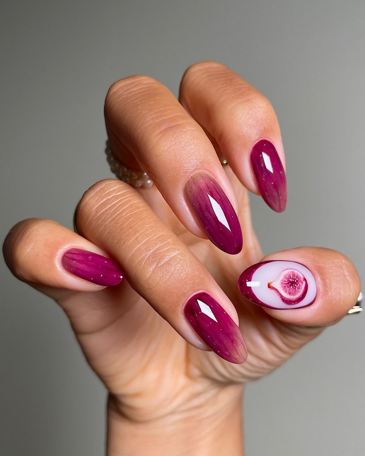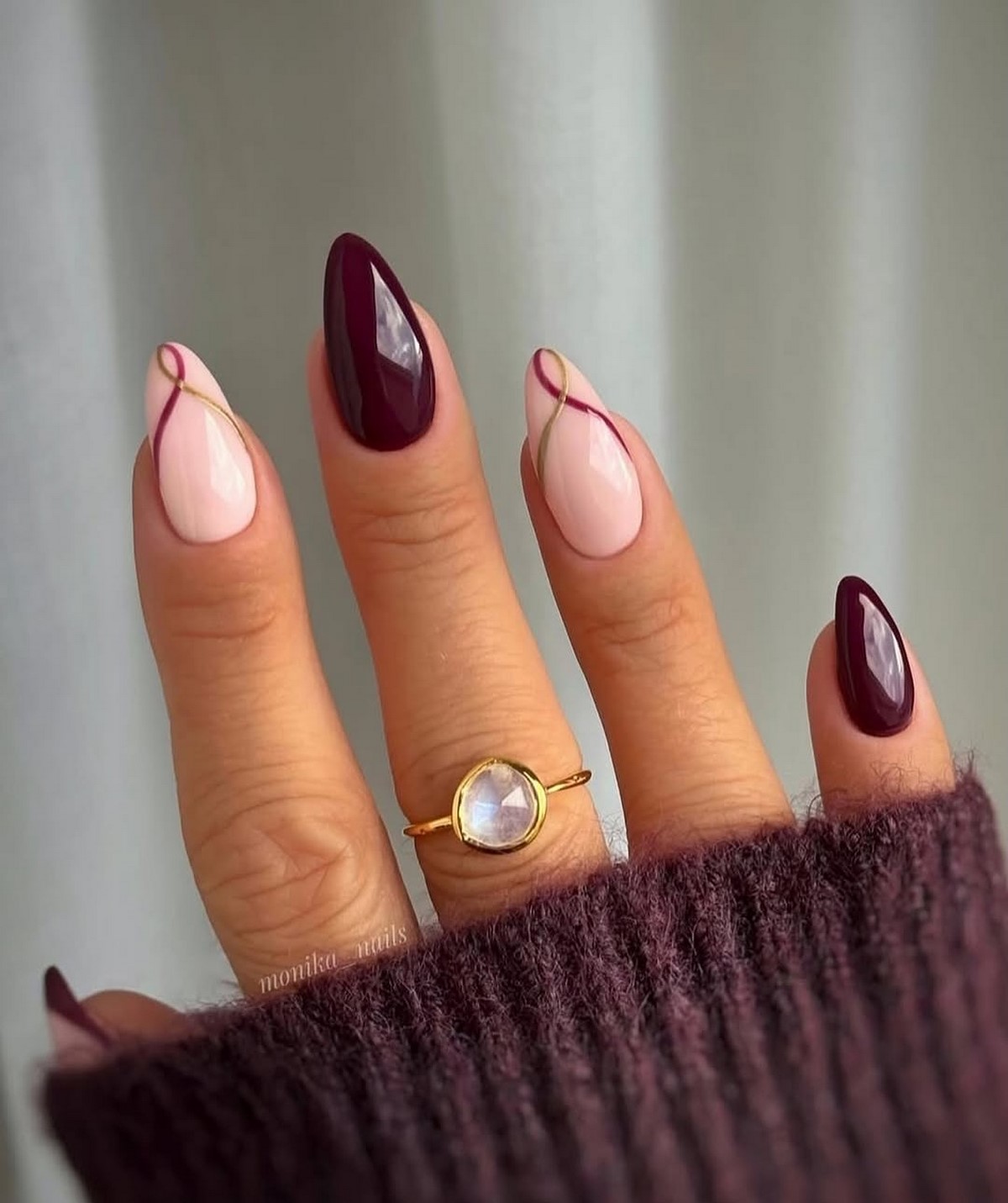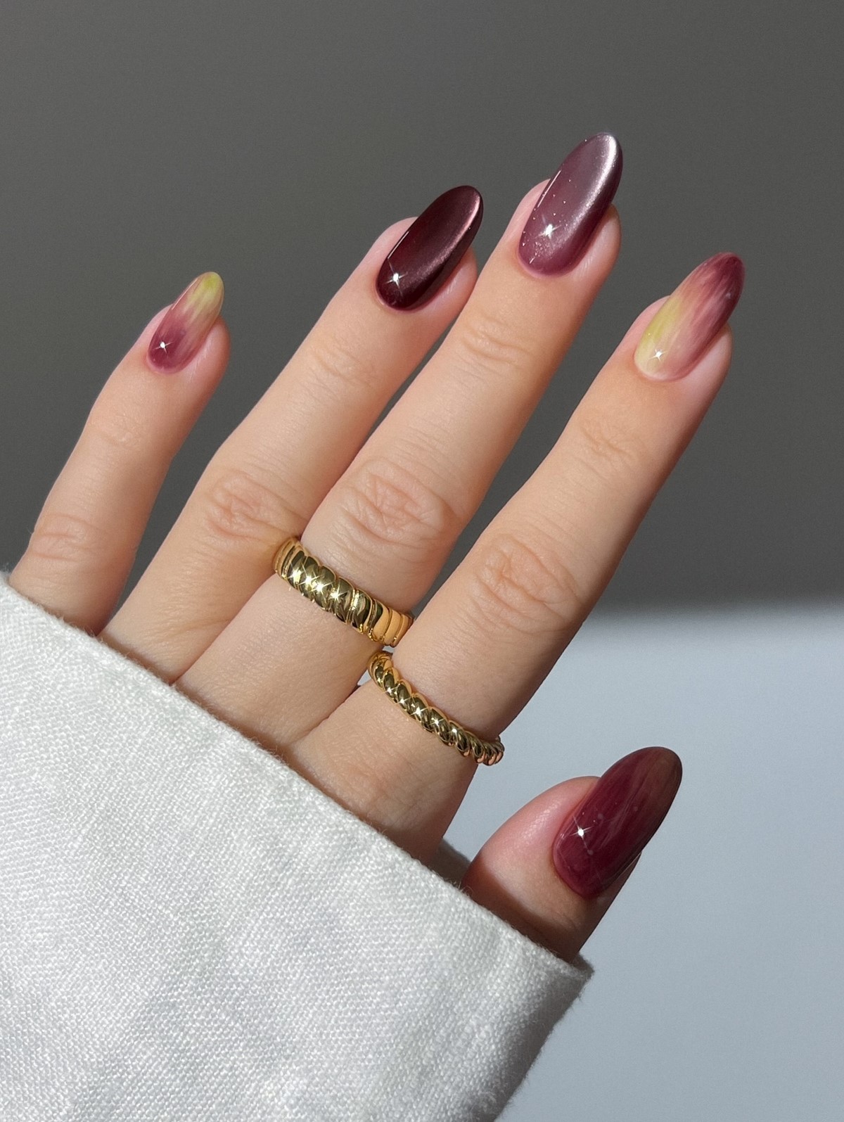 Глибокий бордовий — незмінний фаворит осені. Він надає образу драматичності і розкоші. Такий манікюр прекрасно виглядає в матовому виконанні, а також в комбінації з глянцевими акцентами. Можна додати тонкі золоті лінії або камені для святкового ефекту.